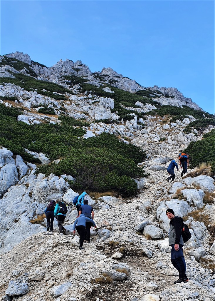 Viševnik je najposjećeniji slovenski dvotisućnjak zbog jednostavnog i kratkog uspona od Pokljuke stazom kojom ćemo se mi vratiti do automobila, a pred nama je tridesetak minuta ugodnog stjenarenja. Okružuju nas zanimljive nazubljene stijene raznih oblika koje smo vidjeli od raskrižja Jezerce ujutro.