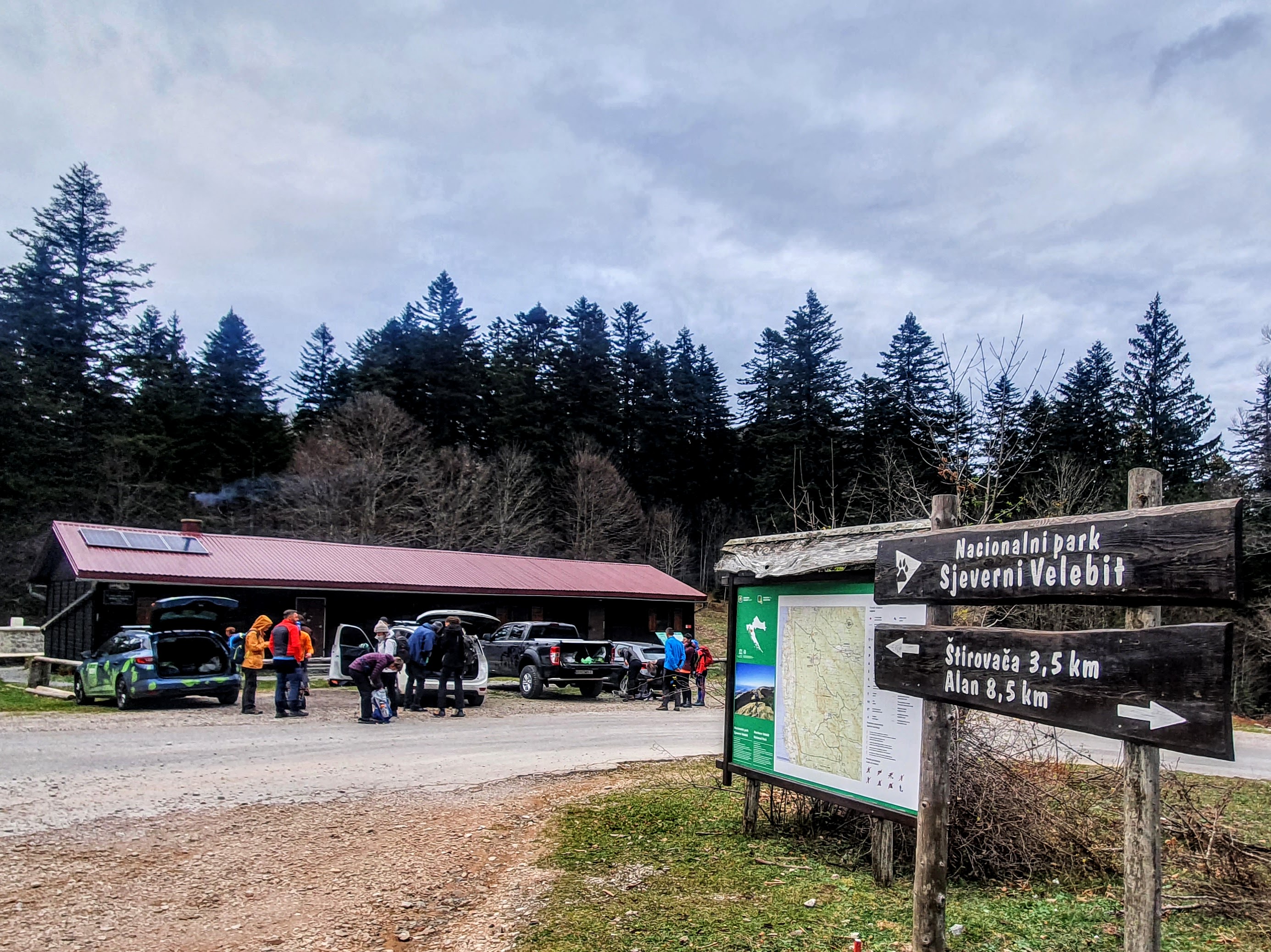 Zavojitu cestu od Krasna do planinarske kuće Mrkvište (1276m) svi sa zadnjih sjedala automobila želimo što prije zaboraviti. Dok dolazimo k sebi vozači odlaze premjestiti automobile do pk Alan, a Dubravko kupiti ulaznice za šetnju Nacionalnim parkom (30 kn) jer takva su pravila.