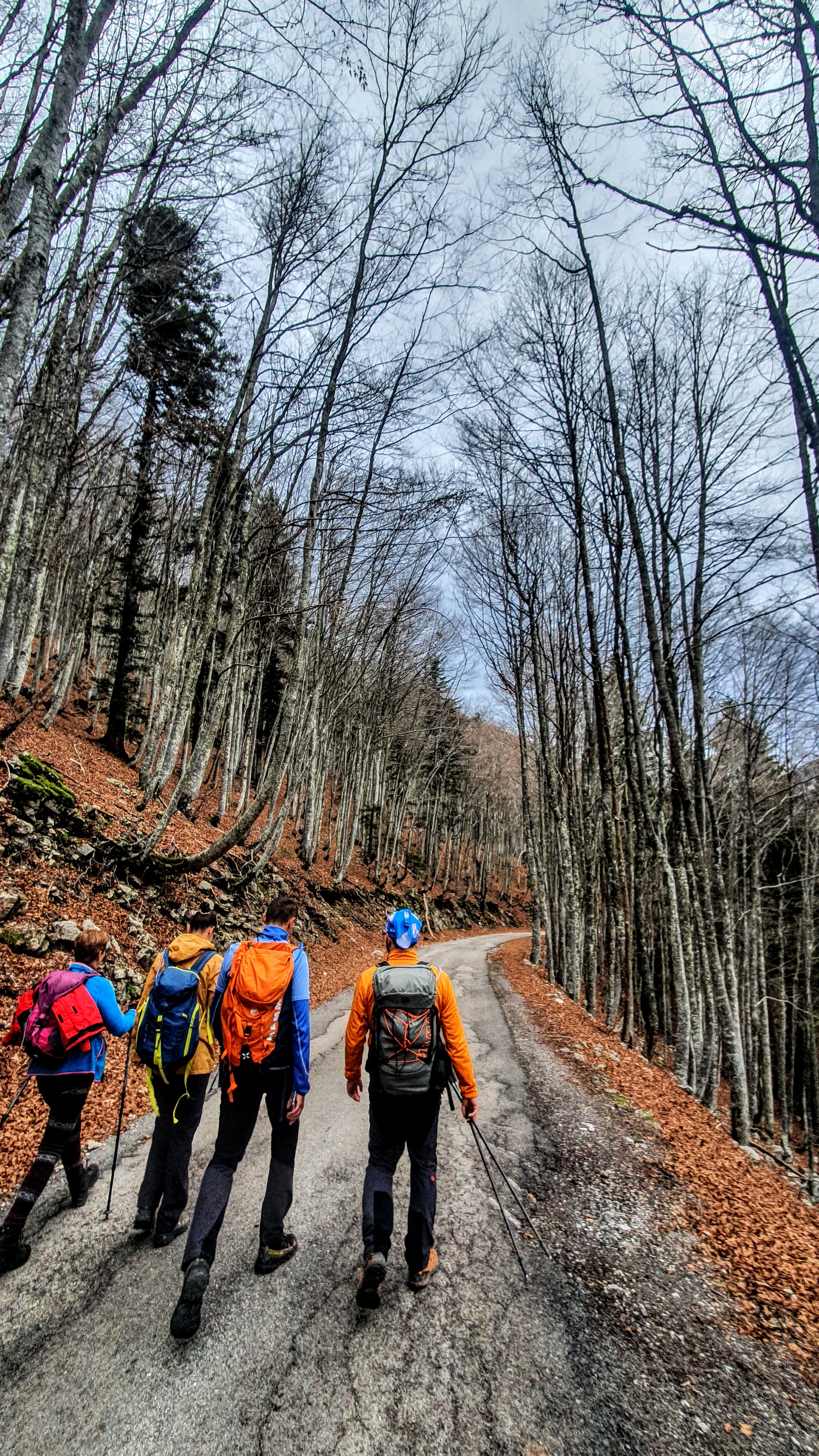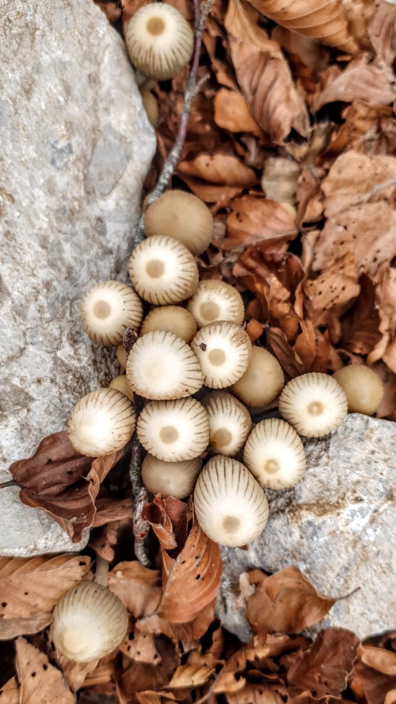 E, baš takav je naš svaki planinarski dan. I danas kad je dan svjež, vjetrovit i oblačan jednako se dinamično krećemo cestom kroz šumu visokih starih bukovih stabala s kojih jesenje lišće već otpalo je, a kroz golo granje viri Veliki Kozjak. Ptice cvrkutom nadglasuju šuštanje lišća pod nogama. Za oko mi zapinje rijedak grmić nježnih gljiva,