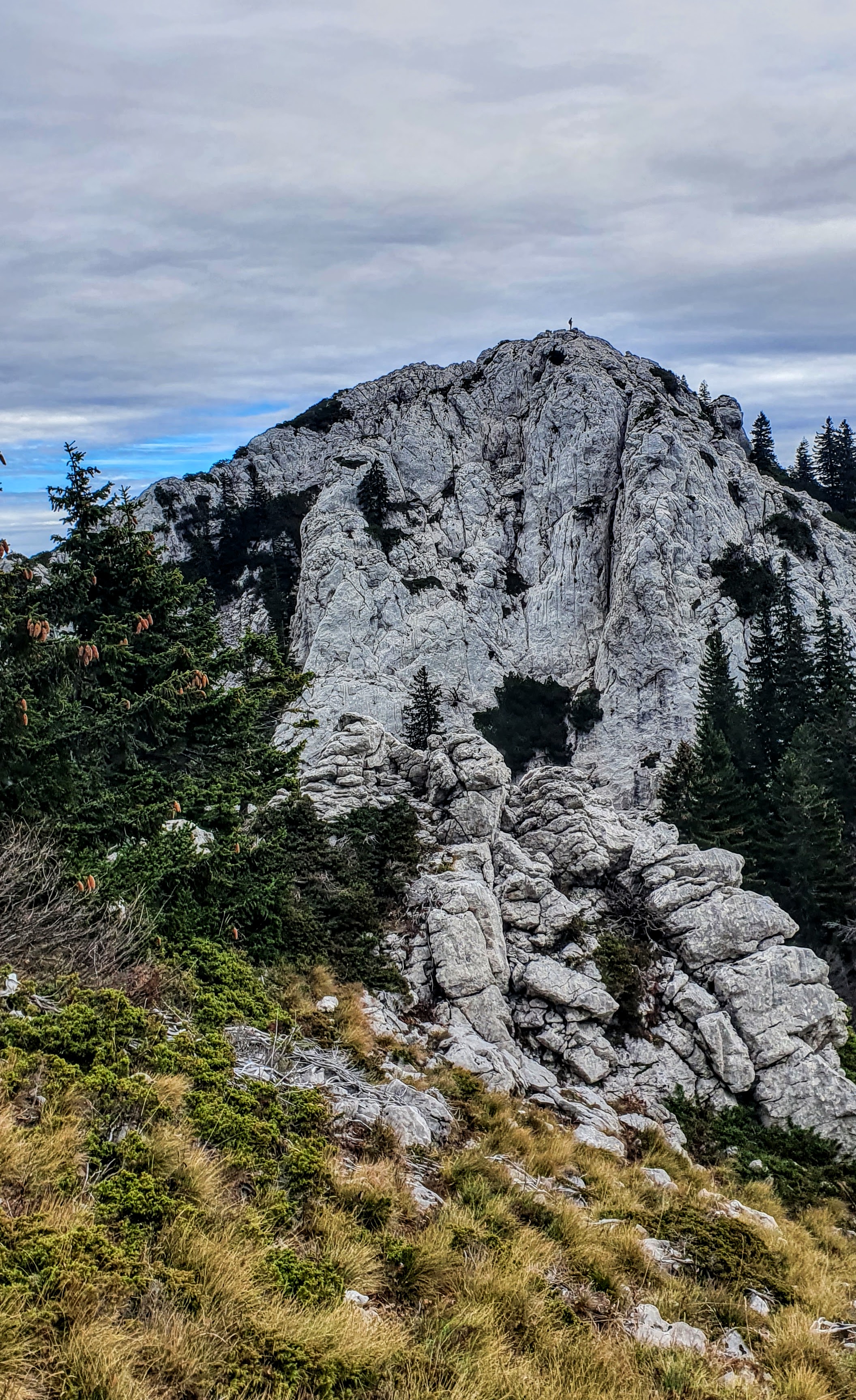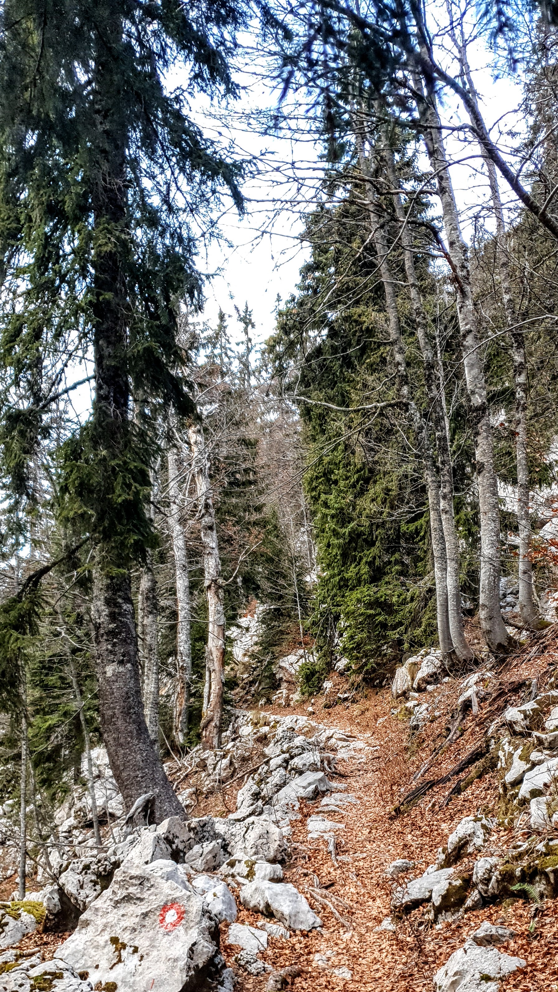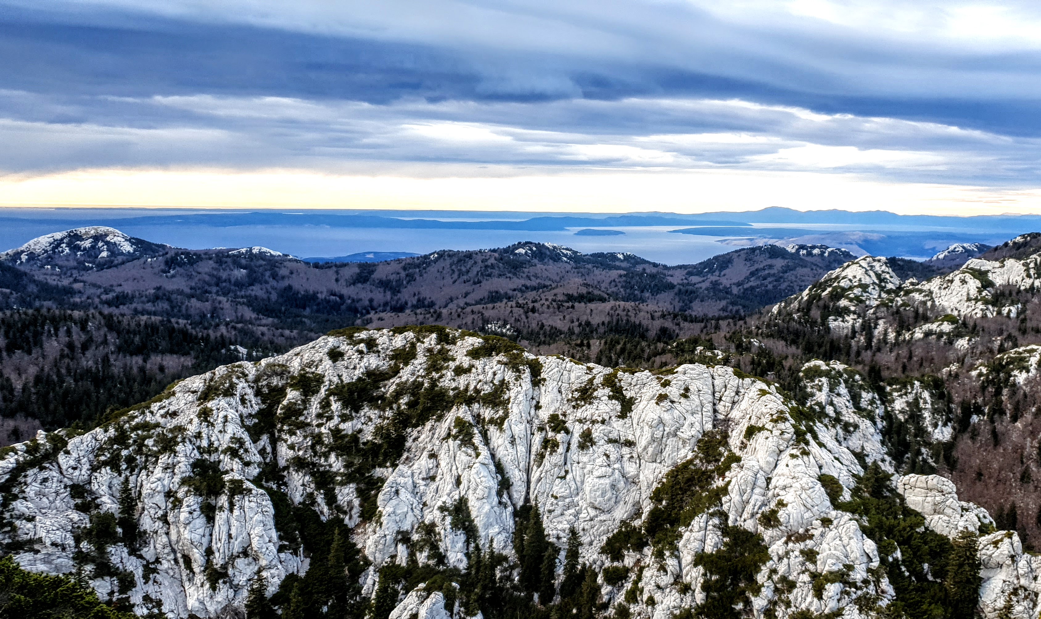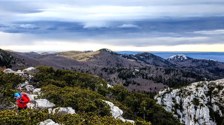 Na Krajačev kuk penjemo se šuškavom šumskom stazom dok kamen ne pobijedi zemljano tlo i uz poneku pauzu evo nas iznad visokih smreka, koje rastu iz krških jama, oči u oči s češerima u samim vrhovima – na grebenu. Ovaj kamen i ja već se dobro poznajemo, tu sam treći put. Jednom smo odavde ispraćali sunce kako uranja u more, a zatim je mjesec pratio nas do automobila… Satima! 🙂