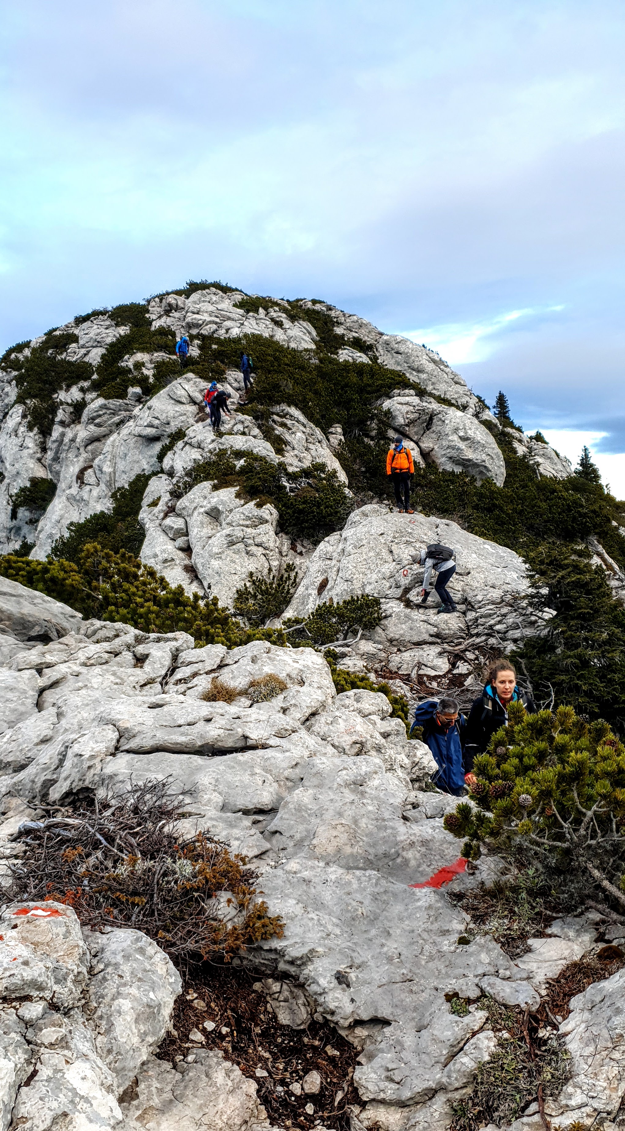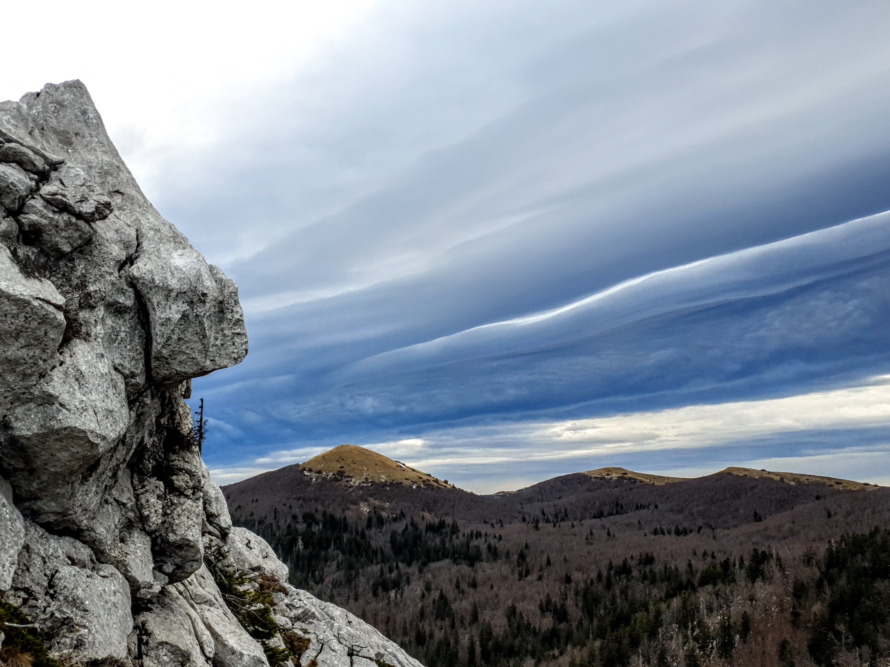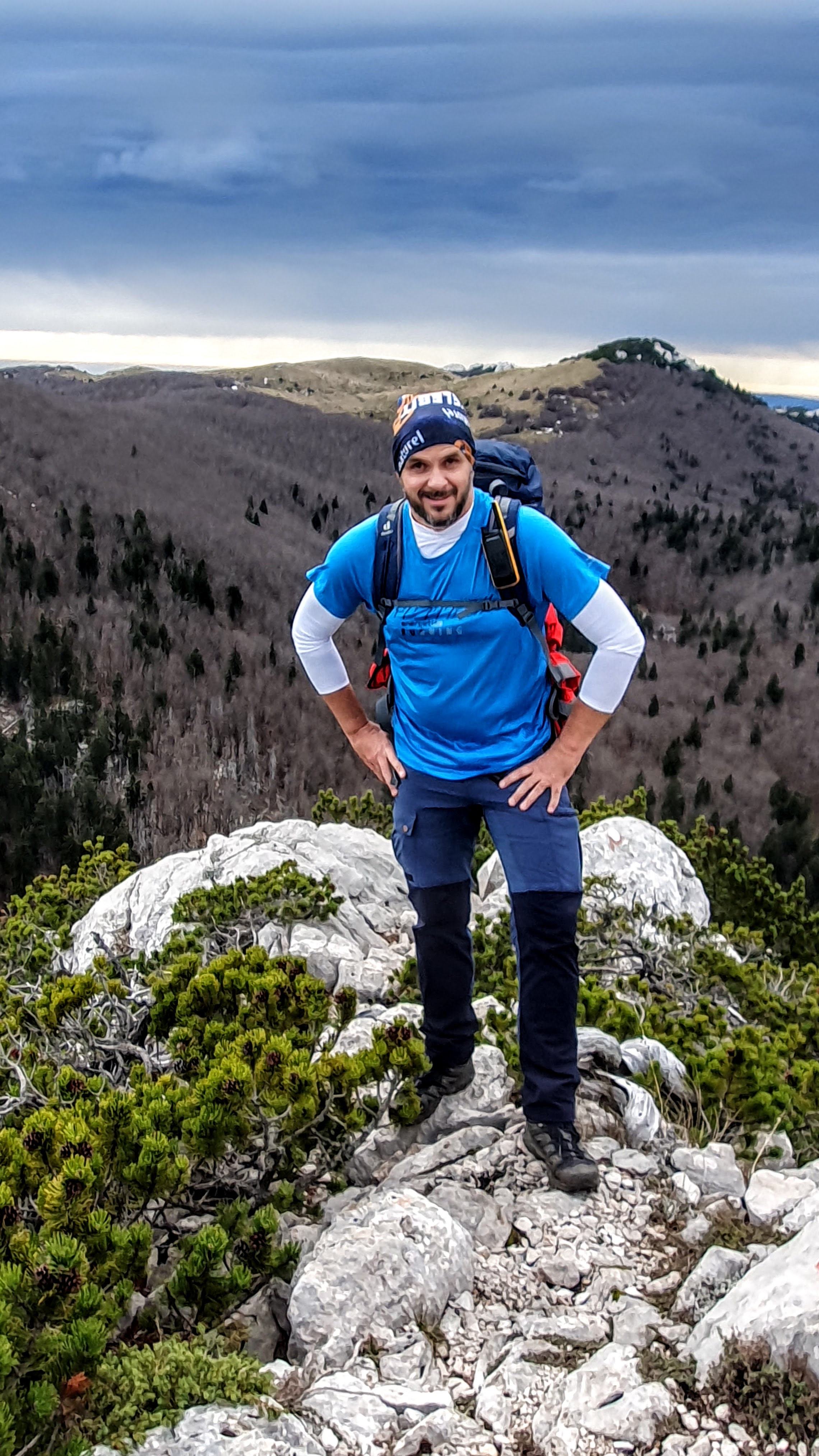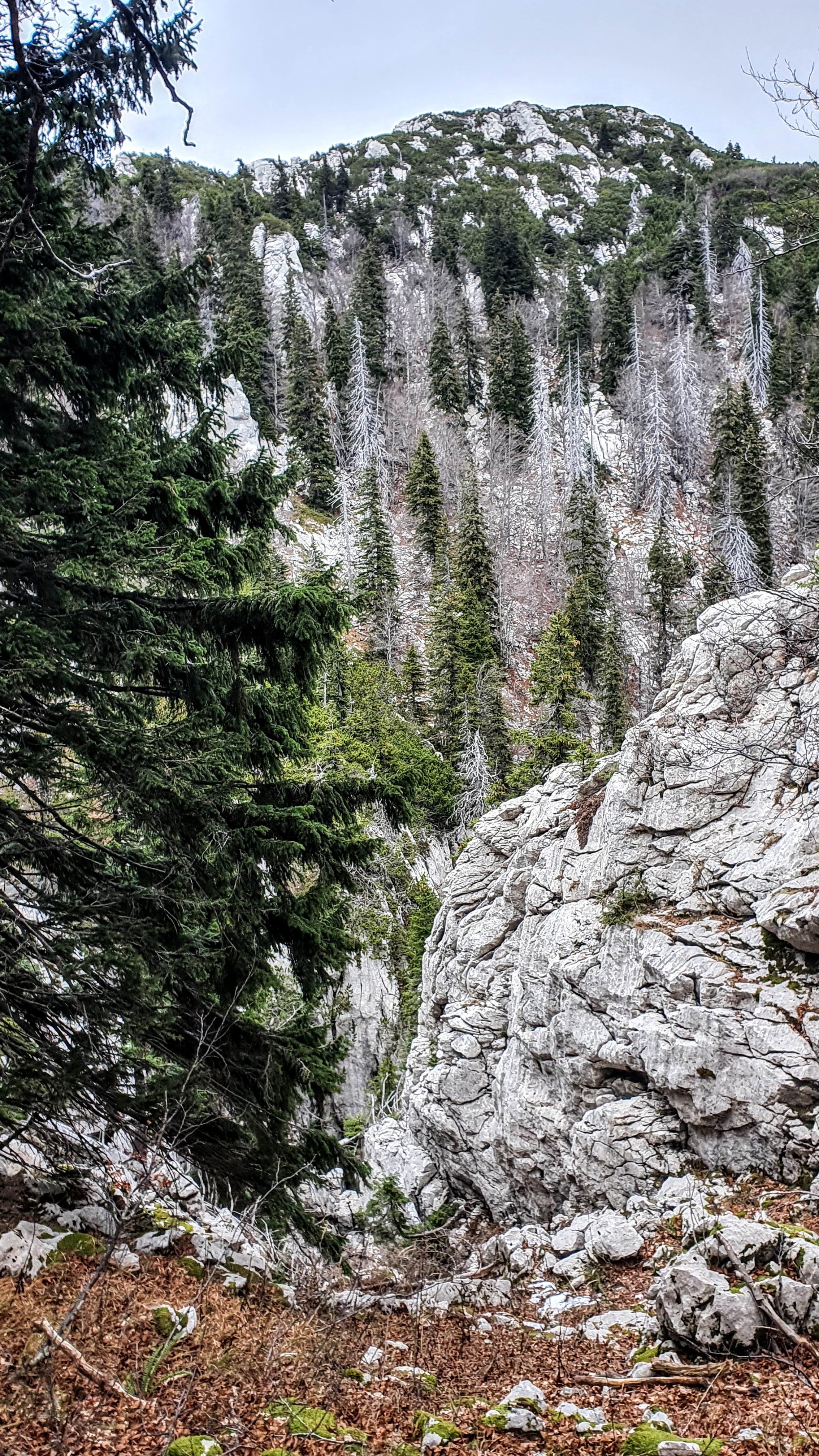 Na Krajačev kuk penjemo se šuškavom šumskom stazom dok kamen ne pobijedi zemljano tlo i uz poneku pauzu evo nas iznad visokih smreka, koje rastu iz krških jama, oči u oči s češerima u samim vrhovima – na grebenu. Ovaj kamen i ja već se dobro poznajemo, tu sam treći put. Jednom smo odavde ispraćali sunce kako uranja u more, a zatim je mjesec pratio nas do automobila… Satima! 🙂