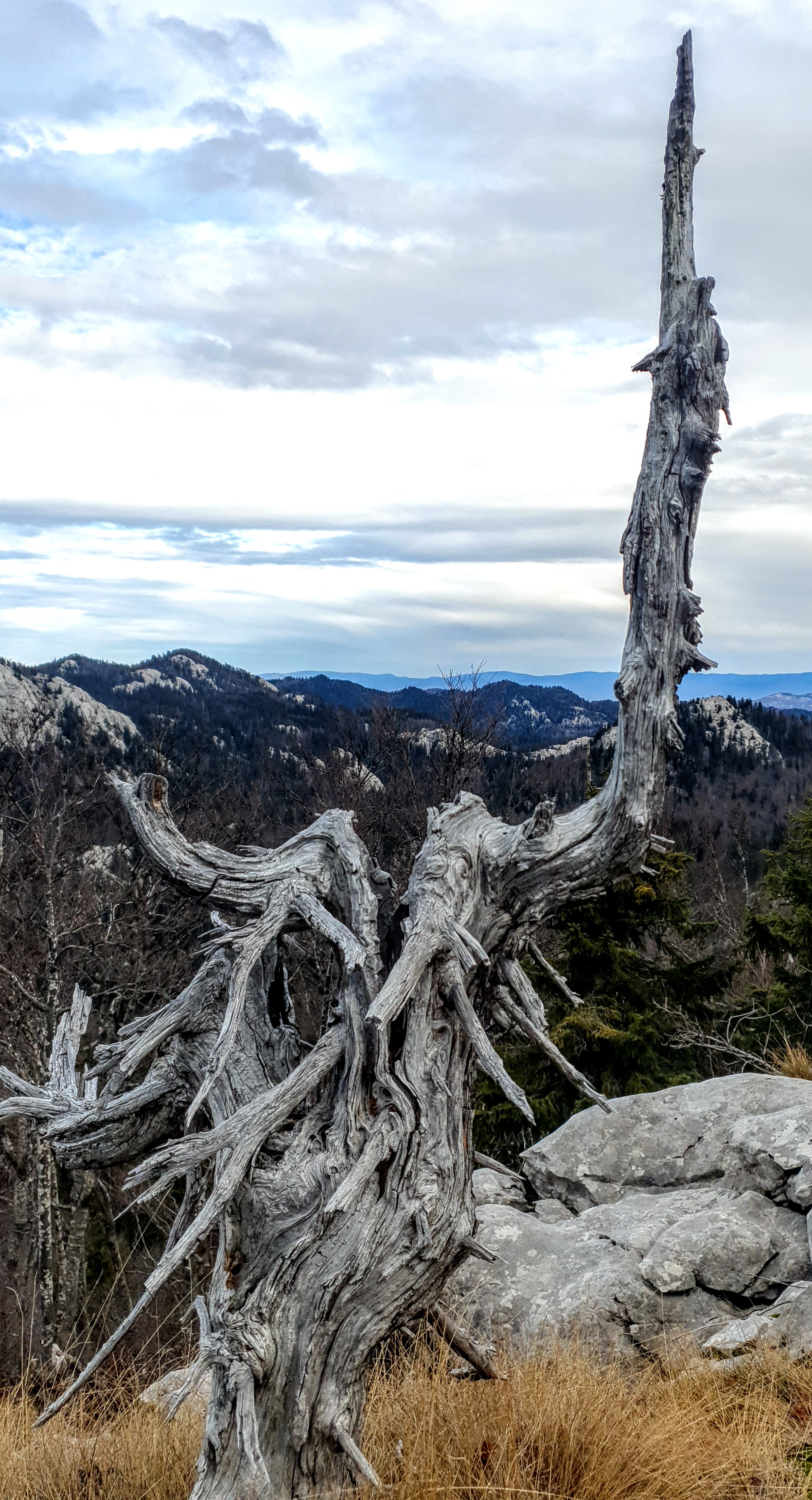Iz daljine kameni vrh djeluje nepristupačno, no lagano se otvaraju dobro markirani jednostavni putevi kroz sive velebitske stijene do oblaka, a iznad Hajdučkih kukova koje smo detaljno izgrlili prije par godina, iznad možda najljepše livade Lubenovac do umjetnički osušenog stabla koje bih najradije prebacila u spavaću sobu da glumi vješalicu i ne trpi više ovaj okrutni vjetar zbog kojeg se i mi brzo spuštamo da u mirnoj zavjetrini šume nešto pojedemo.