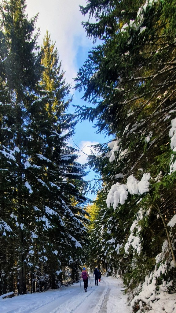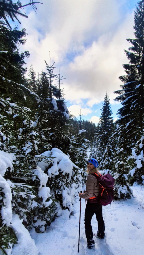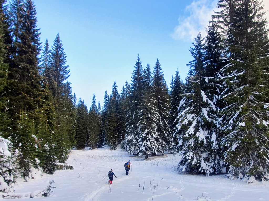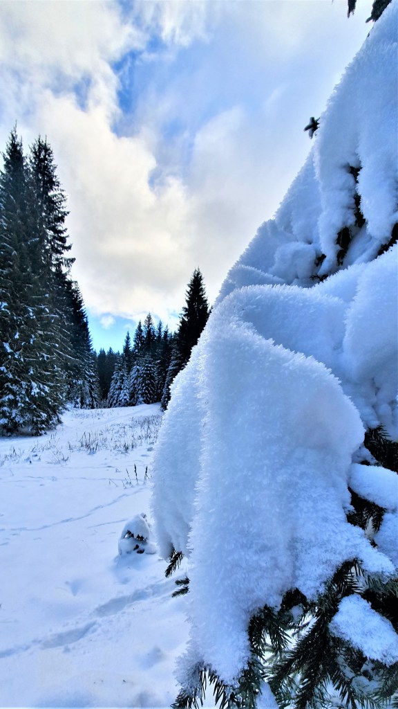 Staza je ravna, grane smreka teške od snijega, ruksaci lagani, još da mi je čuti pjev ptica i uhvatiti fotkom vrapčića na grani!