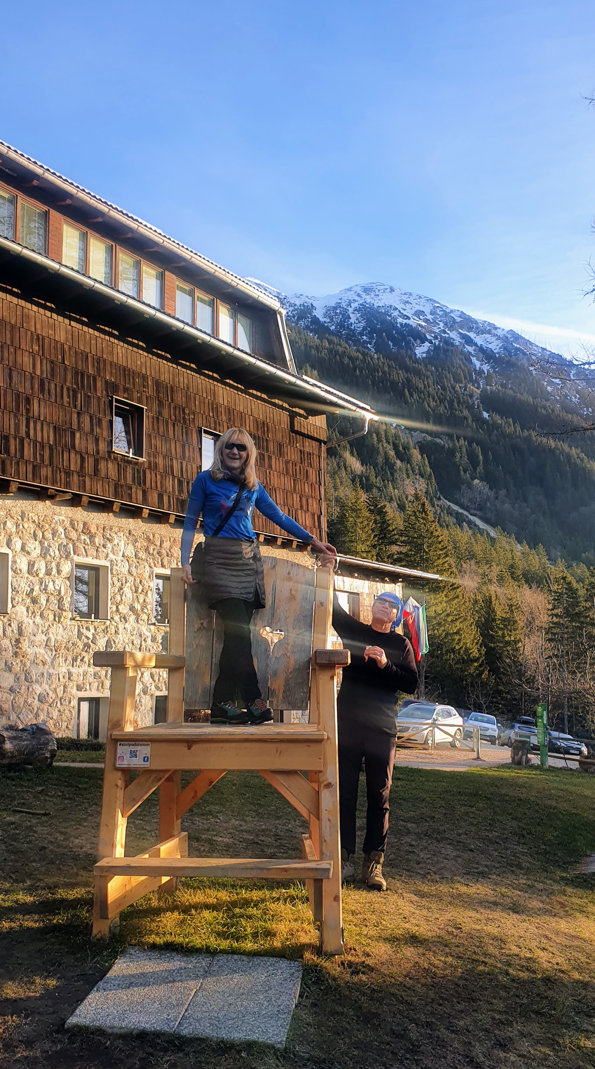 Već neko vrijeme hodamo po ostacima snijega koje južina nije još uspjela rastopiti. Radimo pauzu na travnatom proplanku, dvije grede za nas su klupe, grije nas sunce, vjetrića nema. Desno kao veliki otok izranjaju Julijske Alpe s najvišim vrhom Slovenije -Triglavom. Negdje po obroncima Špika sad se penju prijatelji iz društva. Svoje oduševljenje i proplanak dijelimo s grupicom Slovenaca te utvrđujemo razlike u jezicima: “Vam je stol – miza, nam pak je vaš stol – stolac. Veste?”, pojašnjavaju nam. “Hmm, da to objašnjava veliki stolac pored Valvasorjevog doma.”