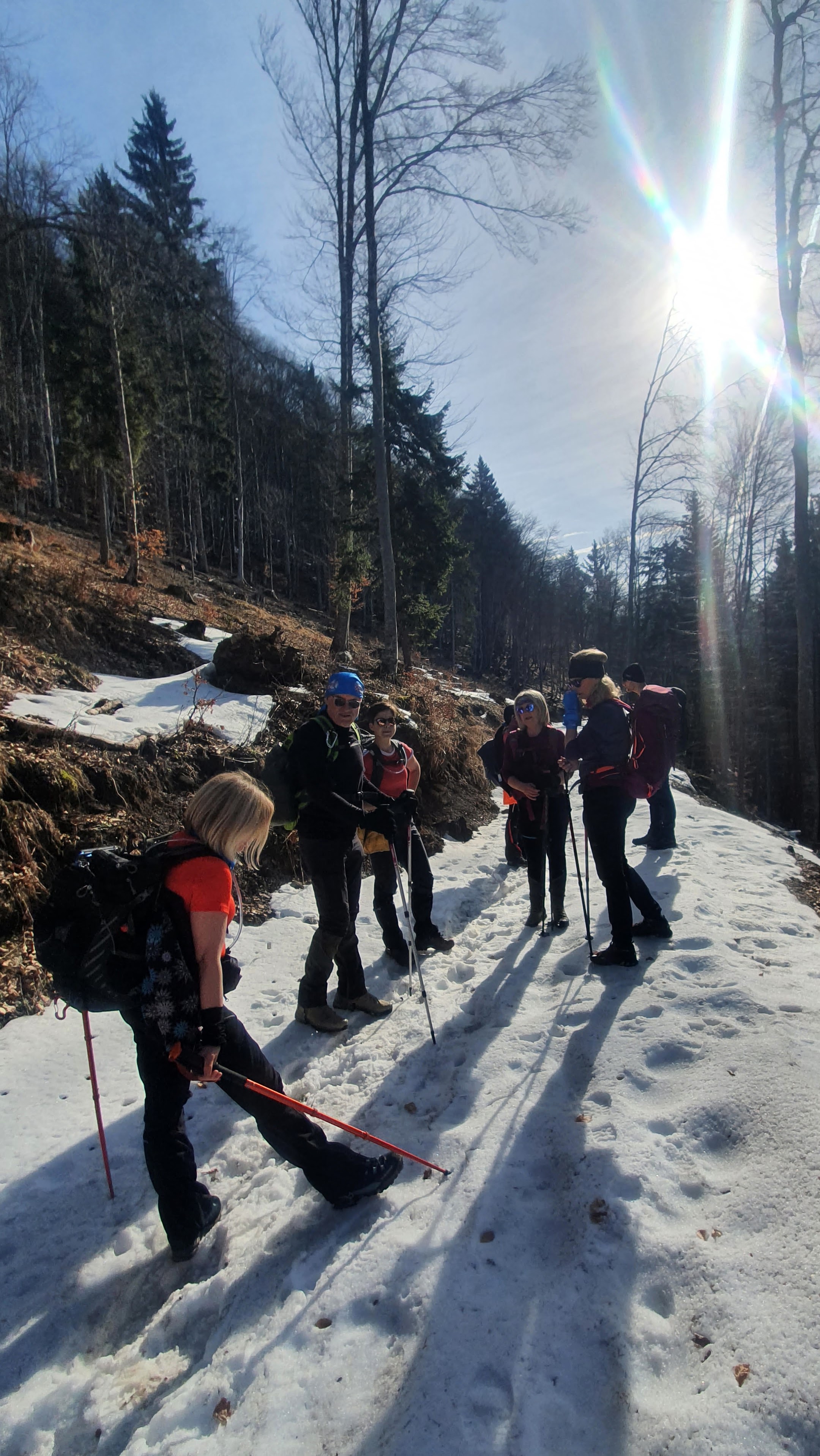 9:00 Pratimo markacije. Dan je vedar, ugodnih 6 C. U šumi, v gozdu rekli bi Slovenci, traje uvertira u proljeće. Jaglaci bliješte bojom jutra, visibabe i zvončići elegantno se njišu, stasiti šafrani mudruju, a ptice sakrivene u krošnjama smreka veselo cvrkuću. Blato je.