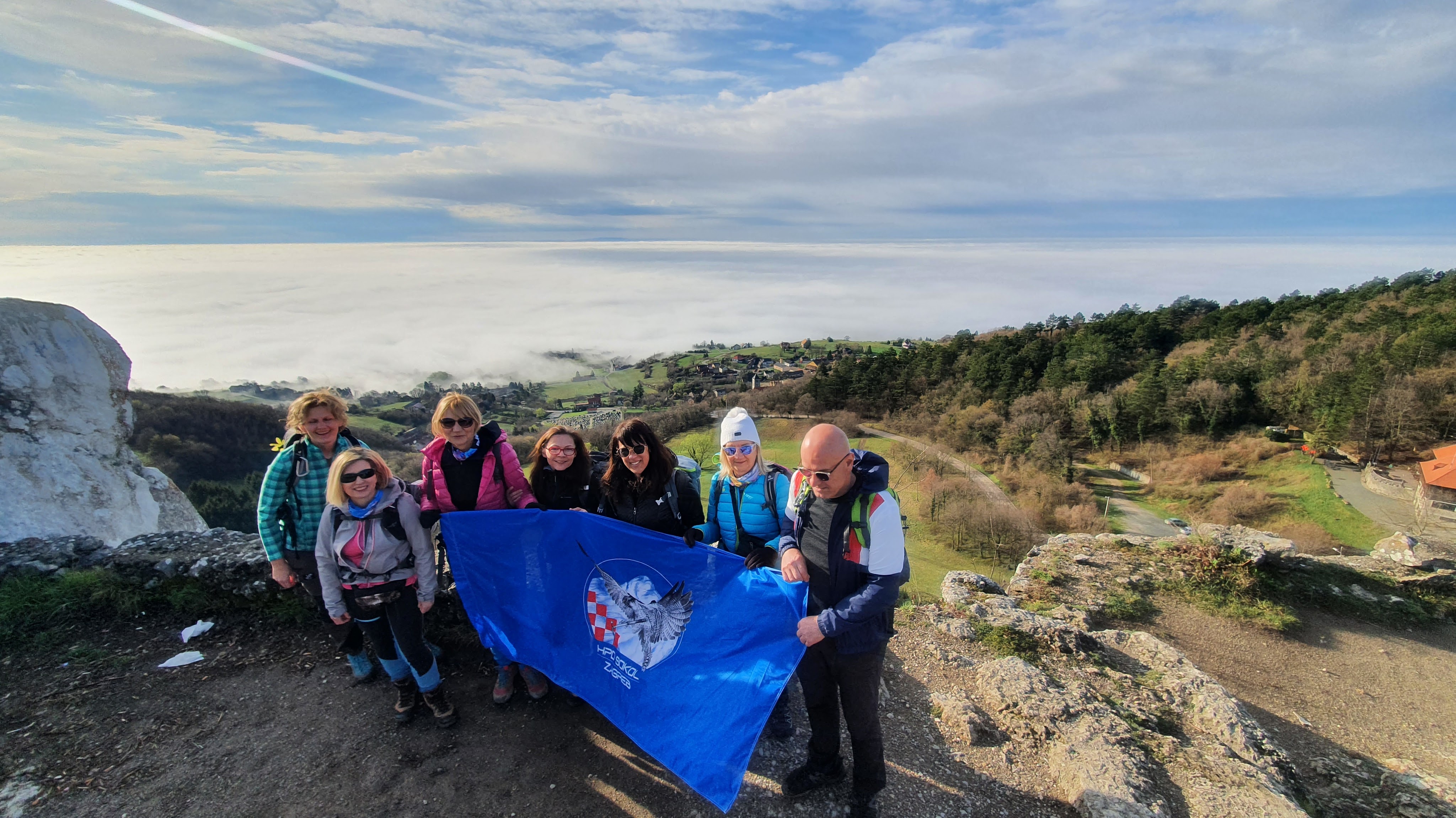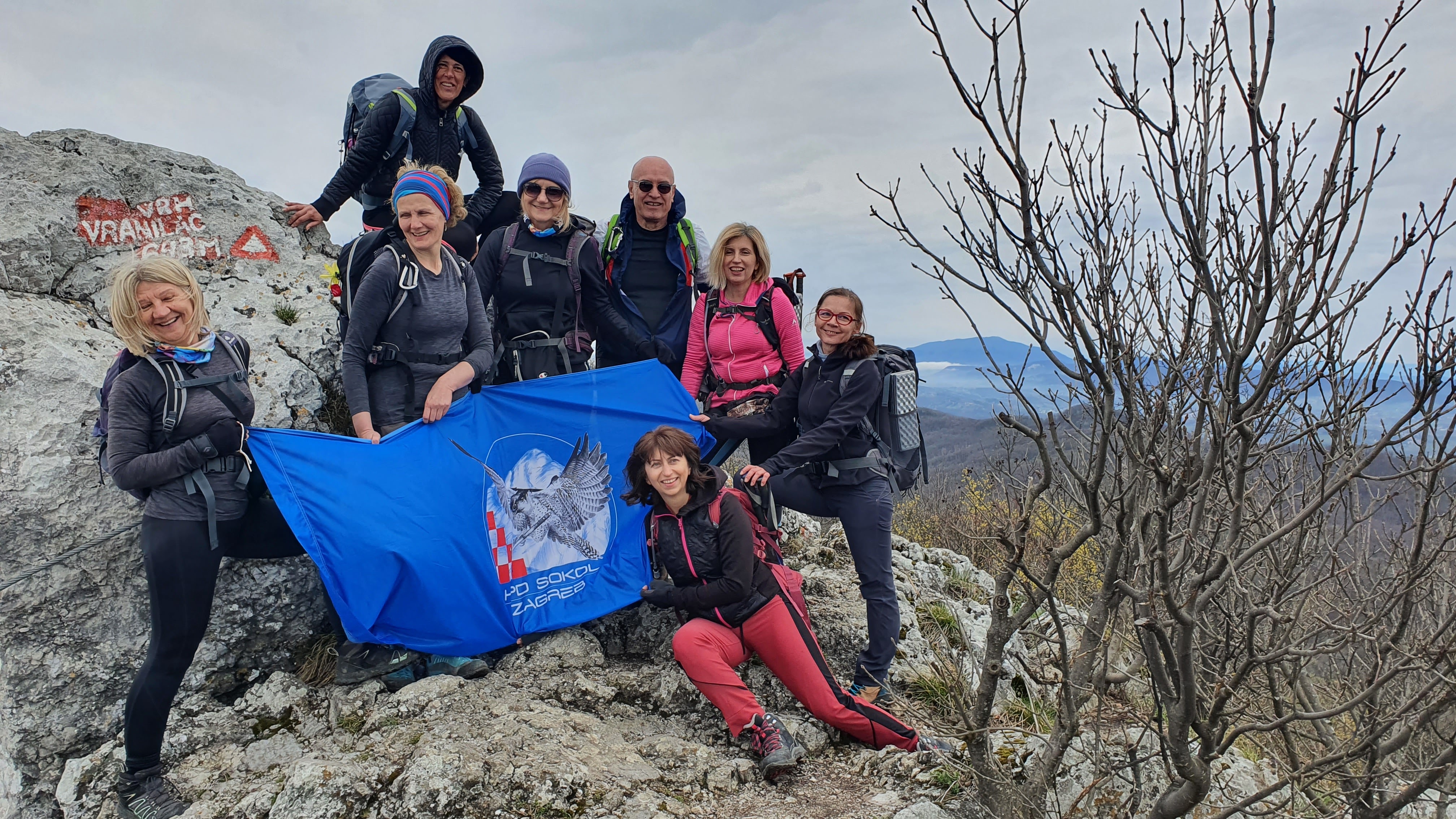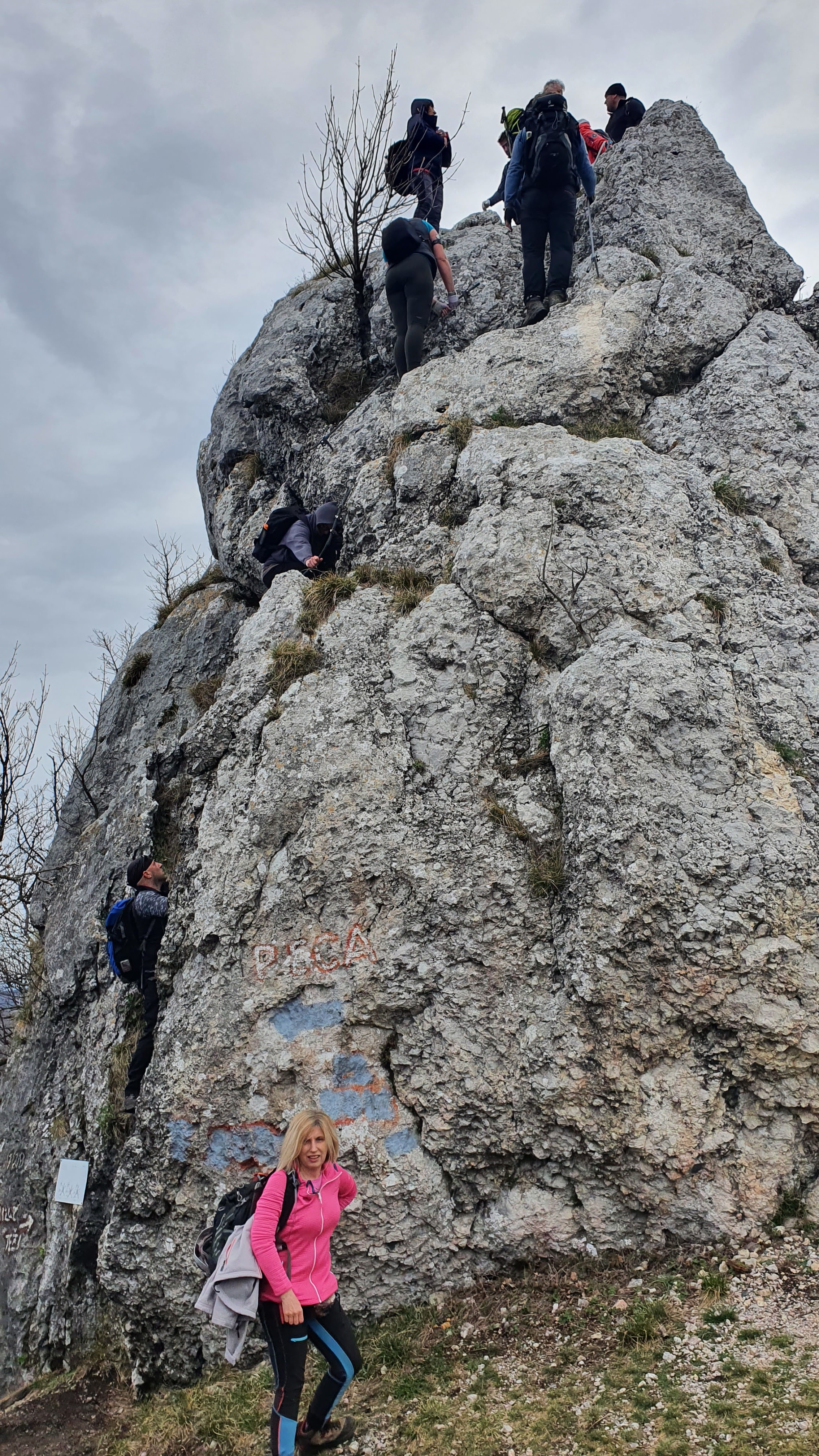 Šesti i sedmi su baš divni. Pri spuštanju sa sedmog zuba prolazimo simpatičnu okomitu feraticu i stojimo pred ogromnim crvenim odašiljačem koji uništava svaki doživljaj planine. Kratak uspon i na najvišem smo vrhu Kalnika na 643 mnv, na vrhu Vranilac tj. Peca. Do sad smo se već sprijateljili s nekima iz PD Strahinjčica te nas fotkaju. Ova staza preko zuba pravi je bombončić – mentol klasik do extra strong.