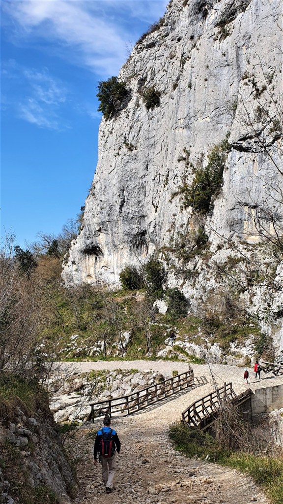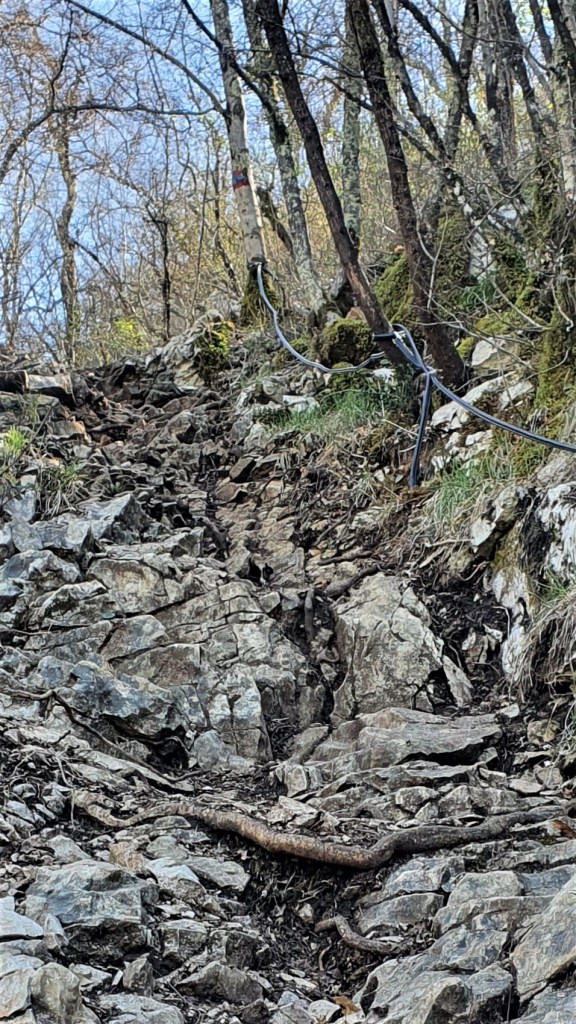 Kamenom stazom penjemo se strmo uzbrdo. Osigurana je sajlom i ponekim klinom za sigurniji oslonac. Zanimljivo! Nisam to očekivala, a nije ni moj muž. 😉 I nije sretan, ali ima dvije ruke i dvije noge, snalazi se. Dižemo se iznad stijena kanjona. Posebna je ova staza. Više od očekivanog. Divlja je, prirodna.