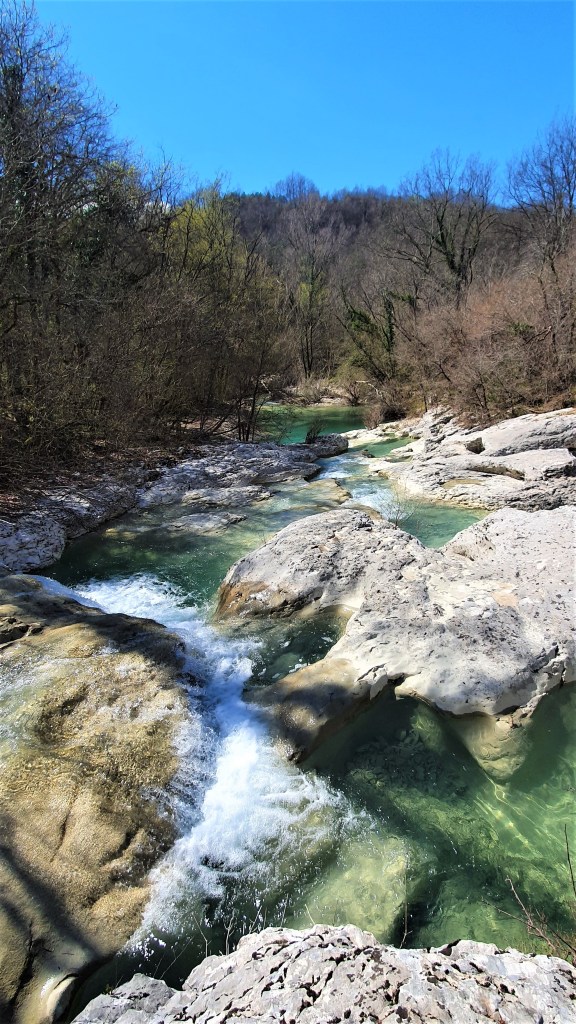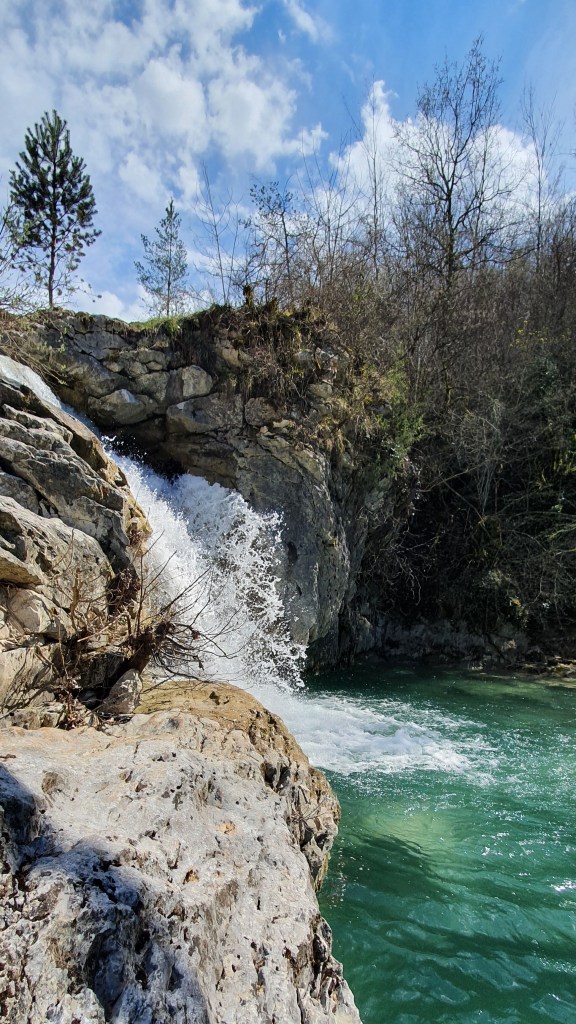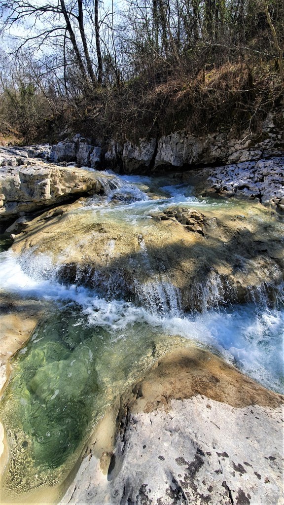 11:00 Ispod brežuljka na kojem se smjestio stari grad Buzet počinje staza 7 slapova. Počinje od mosta, a kad ja vidim most moram ga prijeći. I tako smo stazu započeli na krivoj obali. To nam je postalo jasno nakon desetak minuta. Dočekali smo priliku za prijeći na drugu obalu po kamenju koje strši iz vode. Nekome prilika drugome je neprilika! Nekome je smiješno , nekome je lijeva gojzerica poplavila. “Dobro da sam ponio rezervne tenisice i čarape za ovakvu situaciju.” Ili “Da nisi računao na ovakvu situaciju i ponio rezervnu obuću ne bi je ni bilo!” 🙂 I tako, sad možemo nastaviti dalje.