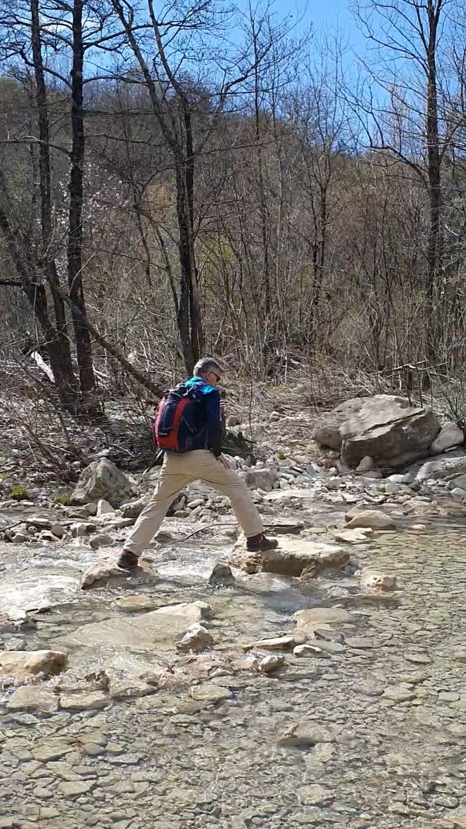 Slijedimo zelene strelice na stablima, a one nas vode preko Mirne. Ne jednom – tri puta uspješno preskačemo rijeku po kamenju koje taman dovoljno viri iz korita da ne moramo zagaziti ili se izuvati.
