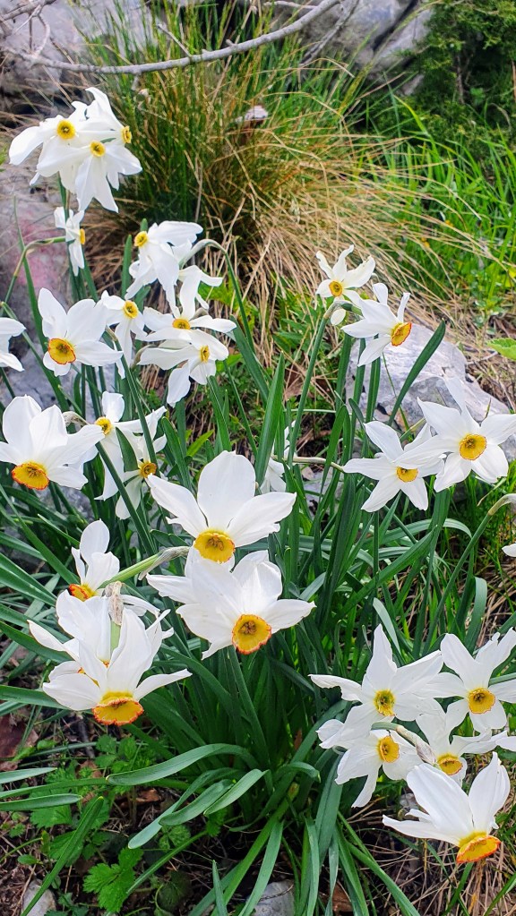 Šumu smjenjuje niska klekovina i livade narcisa. Odlično, sad ne trebam ići na Golicu (Slovenija) u lov na narcise. Nekoliko božura uz stazu još nije procvalo, za sad su samo pupoljci. Drugih planinara na stazi nema, ako ne računam nekoliko puževa s kućama na leđima koji se marljivo i uporno penju.