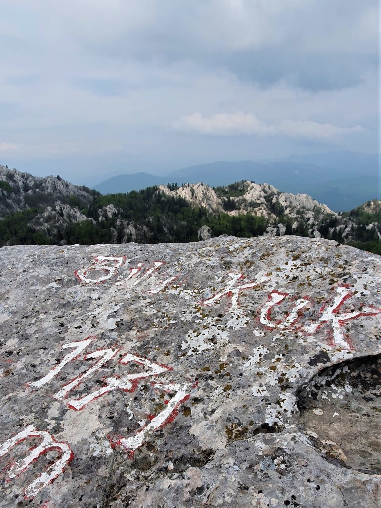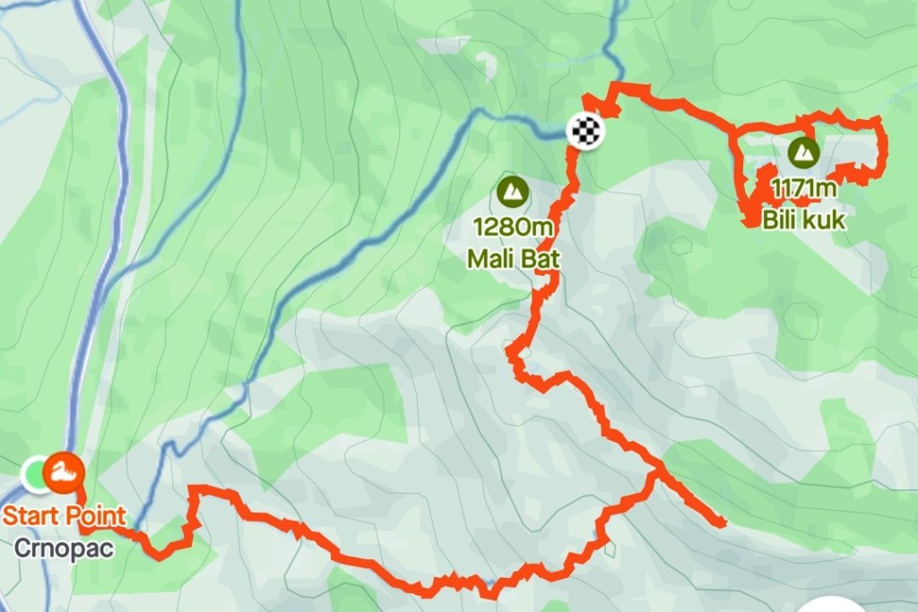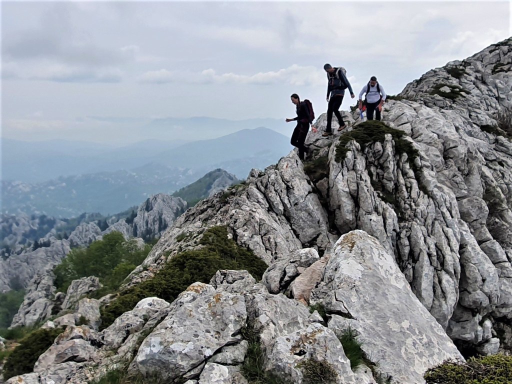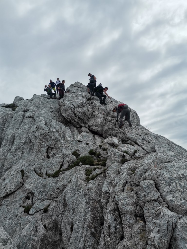 “100 metara visinske razlike je do vrha.”, komentira kolega gledajući aplikaciju. I bi tako. Petnaestak minuta znatno ozbiljnijeg penjanja po skoro bijeloj stijeni Bilog kuka. Bilo kako bilo sad smo ushićeni na malom oblom kamenom vrhu. Ushićeni i šćućureni jer nema ovdje ravnog područja ni metar kvadratni. Treba nam hrana i predah da skupimo snage i hrabrosti za povratak. “Ono je vrh Crnopac!”, pokazuje Dubravko blago uzdignut vršić u daljini. Nevjerojatno je koliko se može proći u jednom danu!