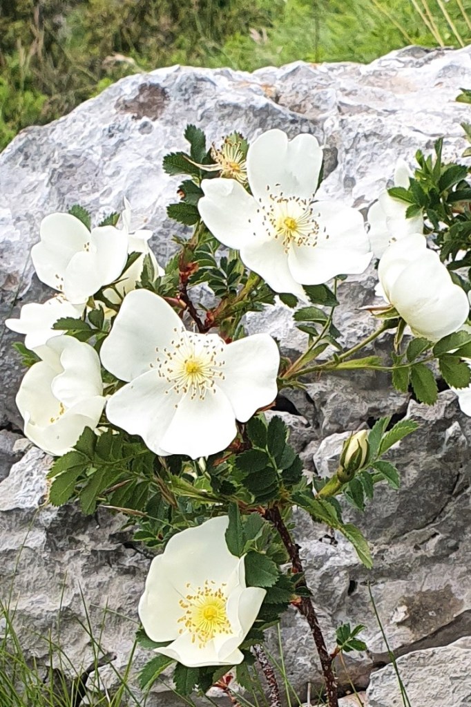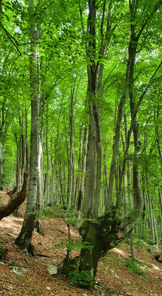 Ulazimo u šumu zelenu, tihu, proljetnu. Slijedi livada s otvorenim pogledom na vrhove Ćićarije. Brgudac – Korita – Županj su jedini koje znam. Sa staze sam ugledala neodoljive roze cvjetove. Morala sam se spustiti. To je procvalo desetak planinskih božura!