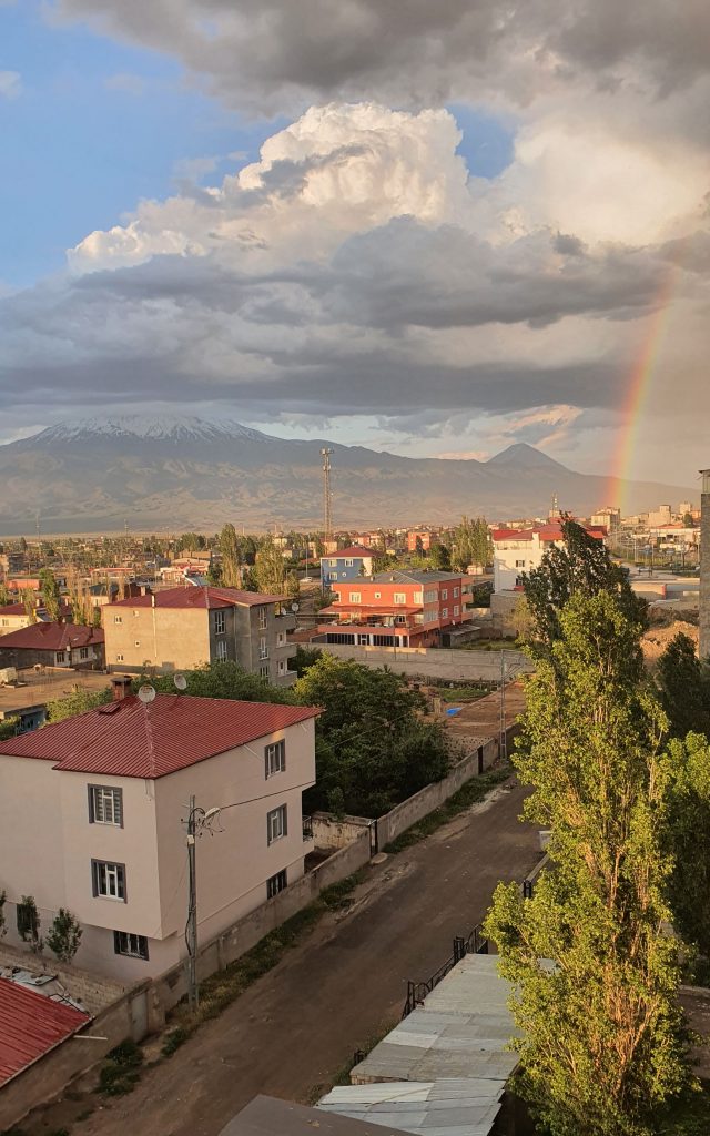 Dan je završio snažnim pljuskom i dugom fotografiranom s balkona hotela, a s pogledom na naš vrh, na usnuli vulkan, na jedinu svjetsku planinu koja stoji samostalno, na dva vulkanska stošca spojena zajedno (Veliki Aratat 5165m i Mali 3896m). Udaljenost između kratera je 11 km, no ta se staza ne koristi.