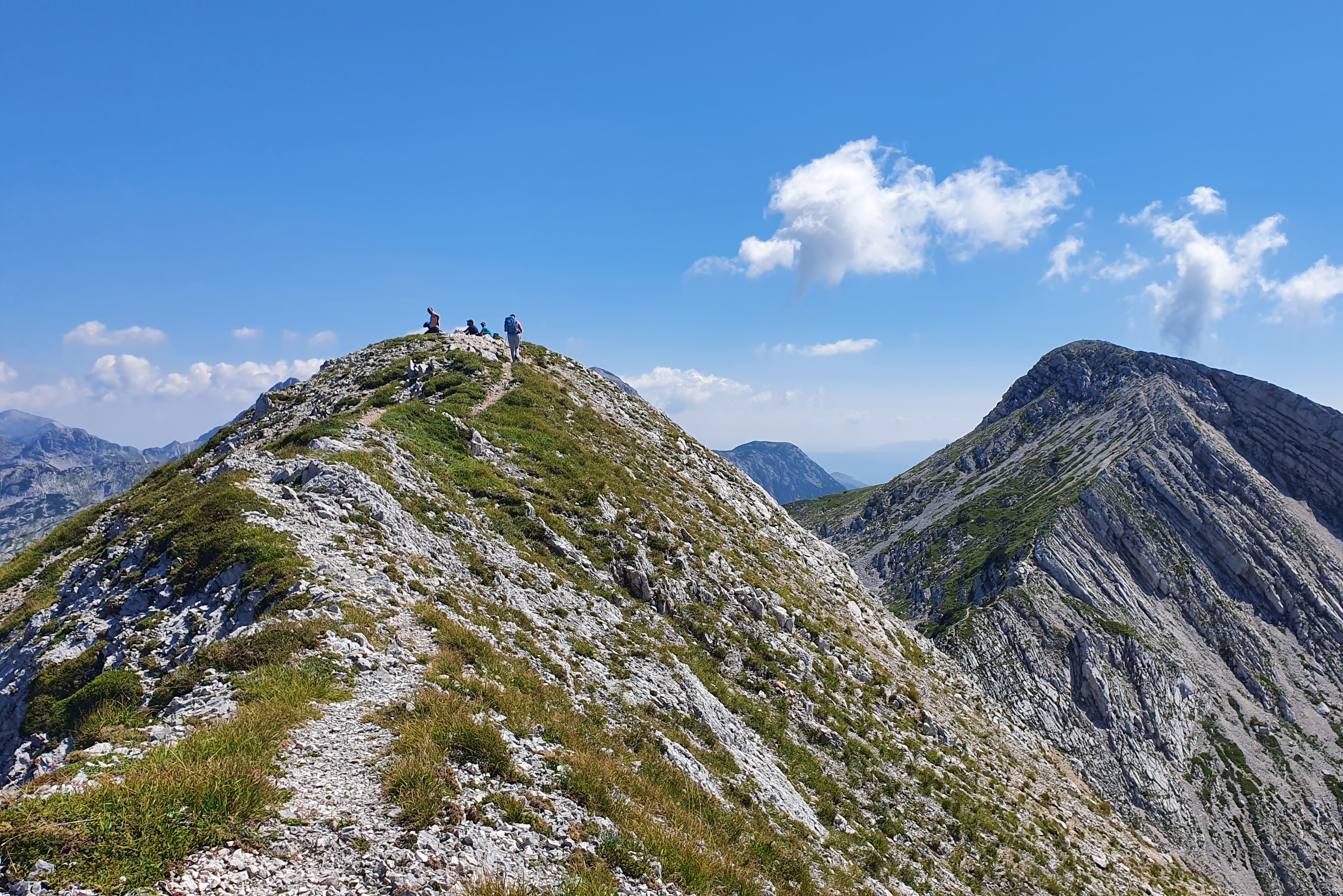 Spuštamo se do Bogatinskog sedla i prema vrhu Mali Bogatin gledamo iz žablje perspektive. Da, puno se izležavamo danas po travnatim prostranstvima Triglavskog nacionalnog parka, jedinog nacionalnog parka Slovenije. Ne srećemo puno planinara, većina je sad ipak na moru.