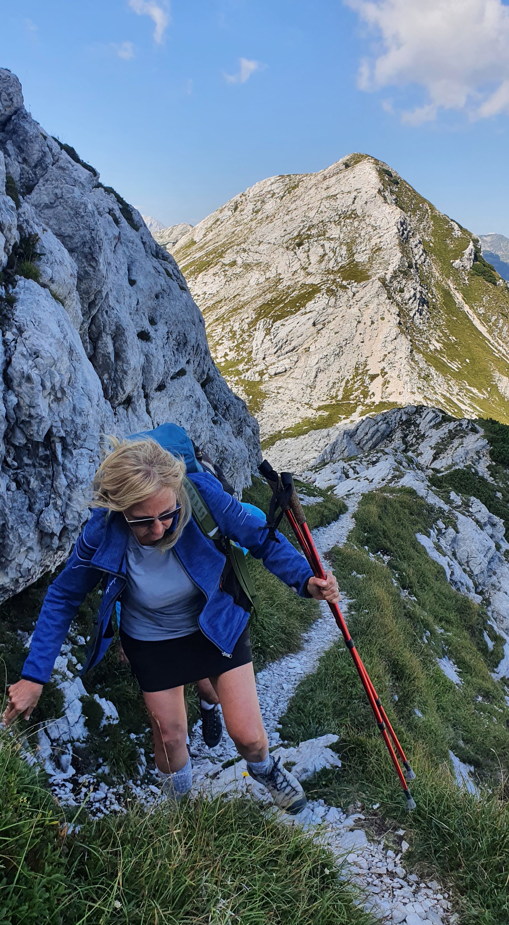 Put prema vrhu je stjenovit i Alida ga je vješto izbjegla/zaobišla stazom koja zaobilazi vrh i čekat će nas u travi, u horizontali, a ja sam izbjegla zmijicu sa šarom ili je ona izbjegla mene, ne znam. Obje smo se uplašile.