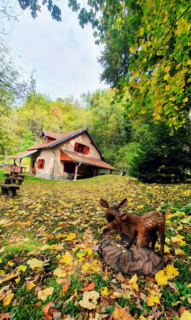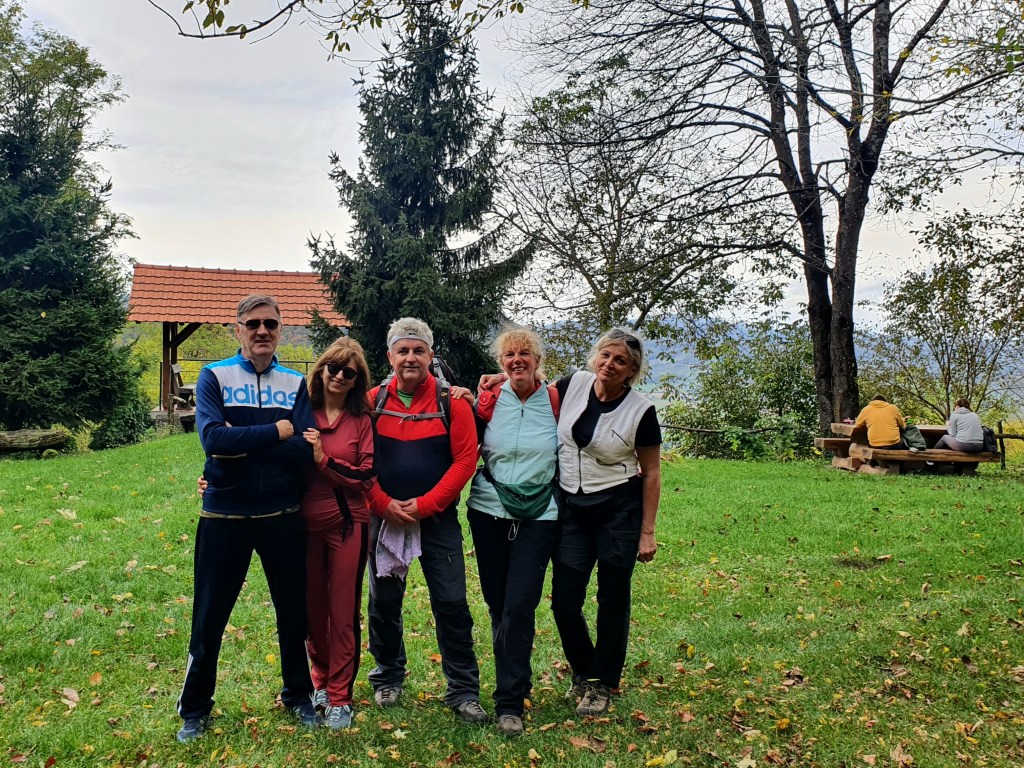 Za zagrijavanje biram 20 minutni uspon na Risvičku goru poučnom, još rosnom, stazom do kapele Majke Božje Snježne iz 16.st. Spustivši se istim putem mogli smo sjesti u restoran kod Venteka, no sve potrebno imamo u našem mini-baru tj.prtljažniku: kratko i slatko (više vrsta), još vruću kavu i tople zapečene palačinke sa sirom – rano sam danas ustala. 🙂 Tu su drveni stolovi i klupe postavljeni za ovakve potrebe.