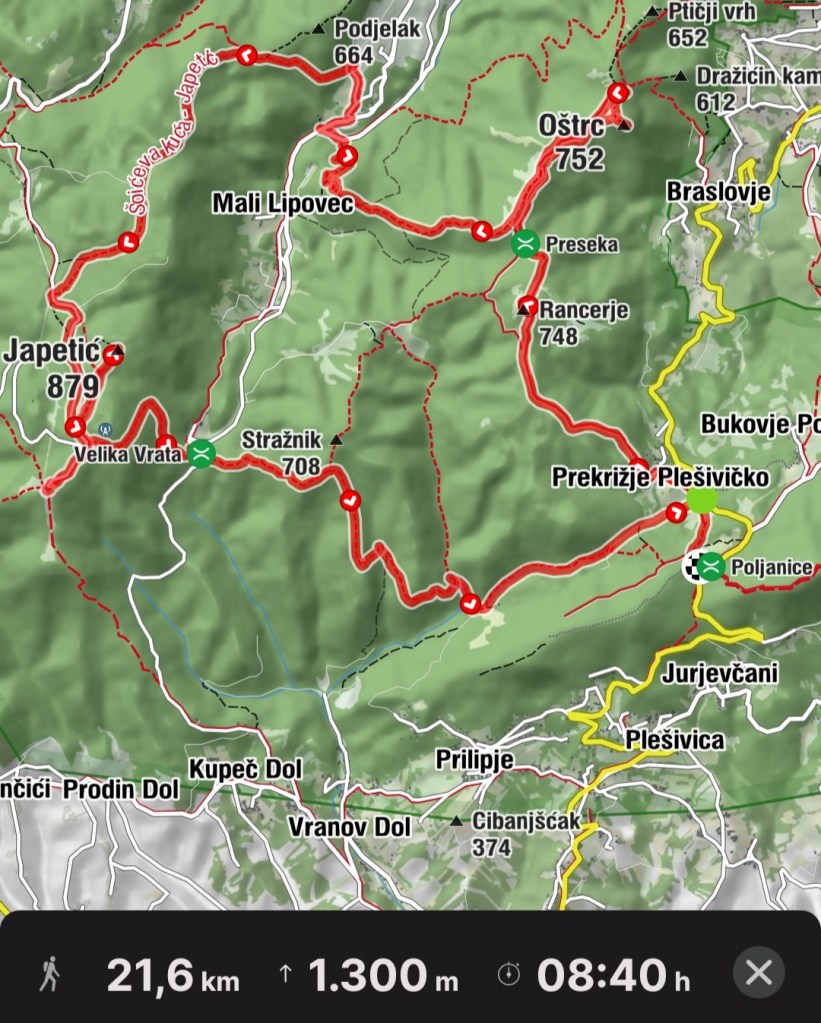 8:00 Stojimo ispred postavljene planinarske karte na velikom panou ispred restorana Klet Poljanica nas osmero koliko nas se okupilo iz redova PD Sokol Zagreb. “Kamo ćemo?”, pita Goran, on dobro poznaje isprepletene puteljke Samoborskog gorja. “Ja bih uskoro htjela popiti kavu, a kasnije negdje na ručak.” – “Kava na Oštrcu, a ručak na Japetiću.”, usvojen je Bibin redoslijed nakon kratke rasprave.