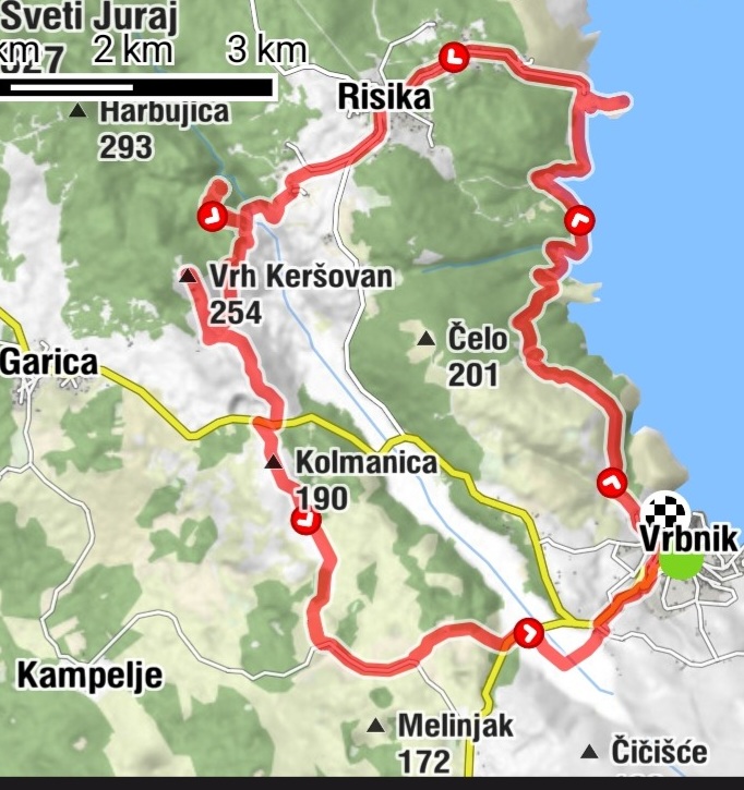 Nakon kave u jedinom otvorenom caffe baru krećemo na stazu Putevima Frankopana. Zvala sam prije par dana turističku zajednicu da pitam za interaktivnu kartu. “Imali smo je do jučer, ali trenutno ne postoji ni u kakvom obliku – maknuta je, jer je u izradi nova, proširena.”, objasnio mi je direktor ljubazno. Nije znao je li staza dobro markirana i prohodna, ali… – “Kao direktor sigurno znate gdje u Vrbniku možemo dobro jesti!” – “O, da. S Gospojom ne možete pogriješiti!”, to je znao!