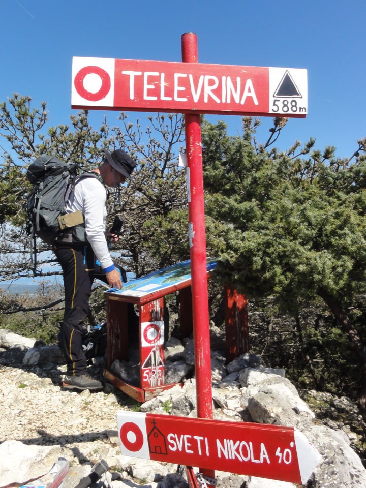 13:00 Planinarski dom Sveti Gaudent (274 m) održava PD Osoršćica. To je mala kuća sa dnevnom sobom, spavaonom i kuhinjom, a ispred je prostrana terasa s pogledom. Dočekala nas je srdačna gđa Vivian s kuhačom u ruci, jer kuha nam maneštru za večeru. Riješili smo se nepotrebnog tereta ( npr. vreće za spavanje ), malo se opustili i krenuli dalje prema najvišoj točci otoka – vrhu Televrina (588 m).