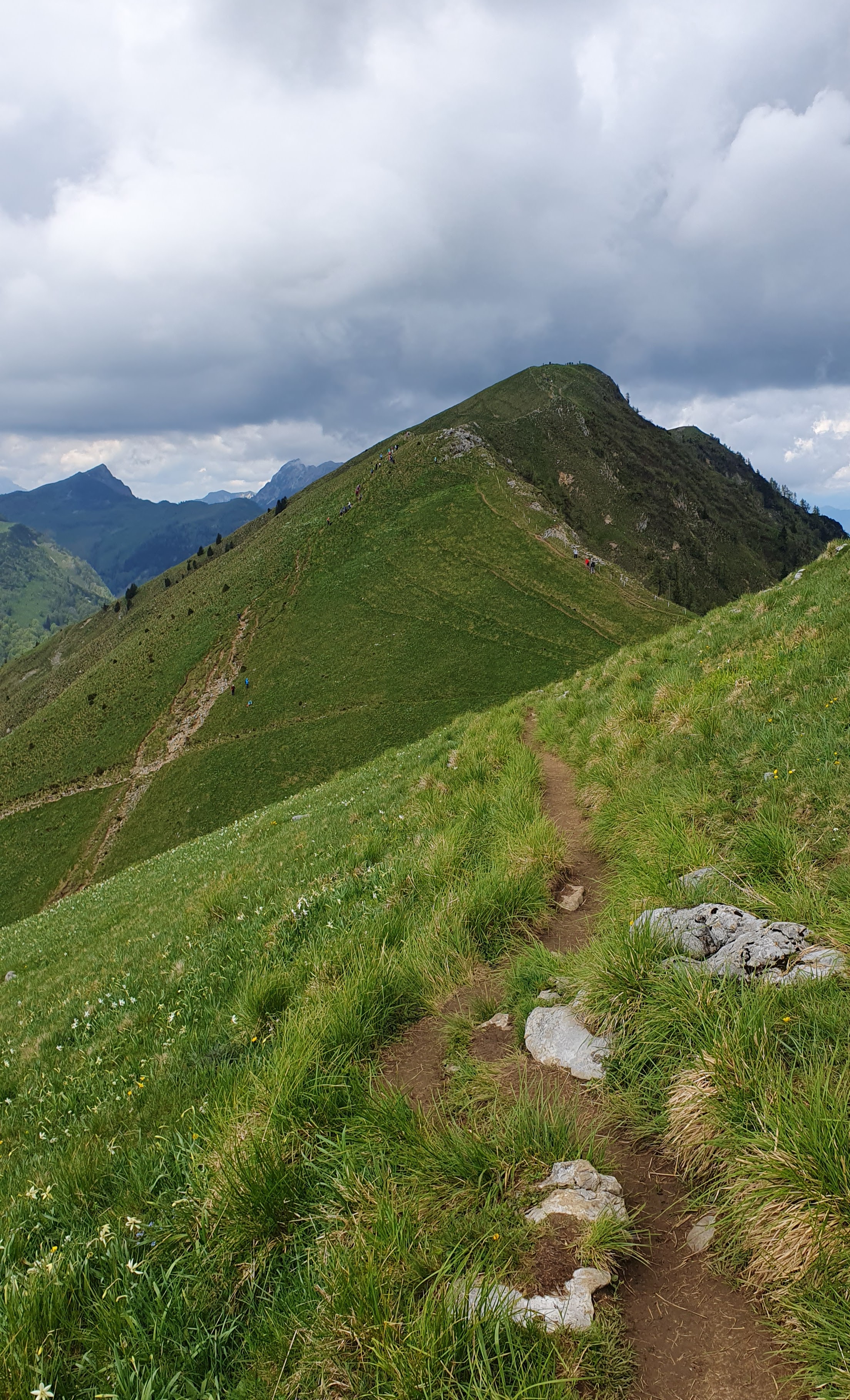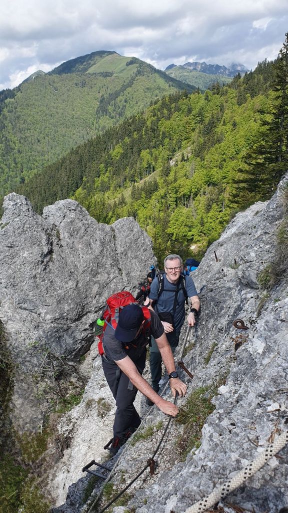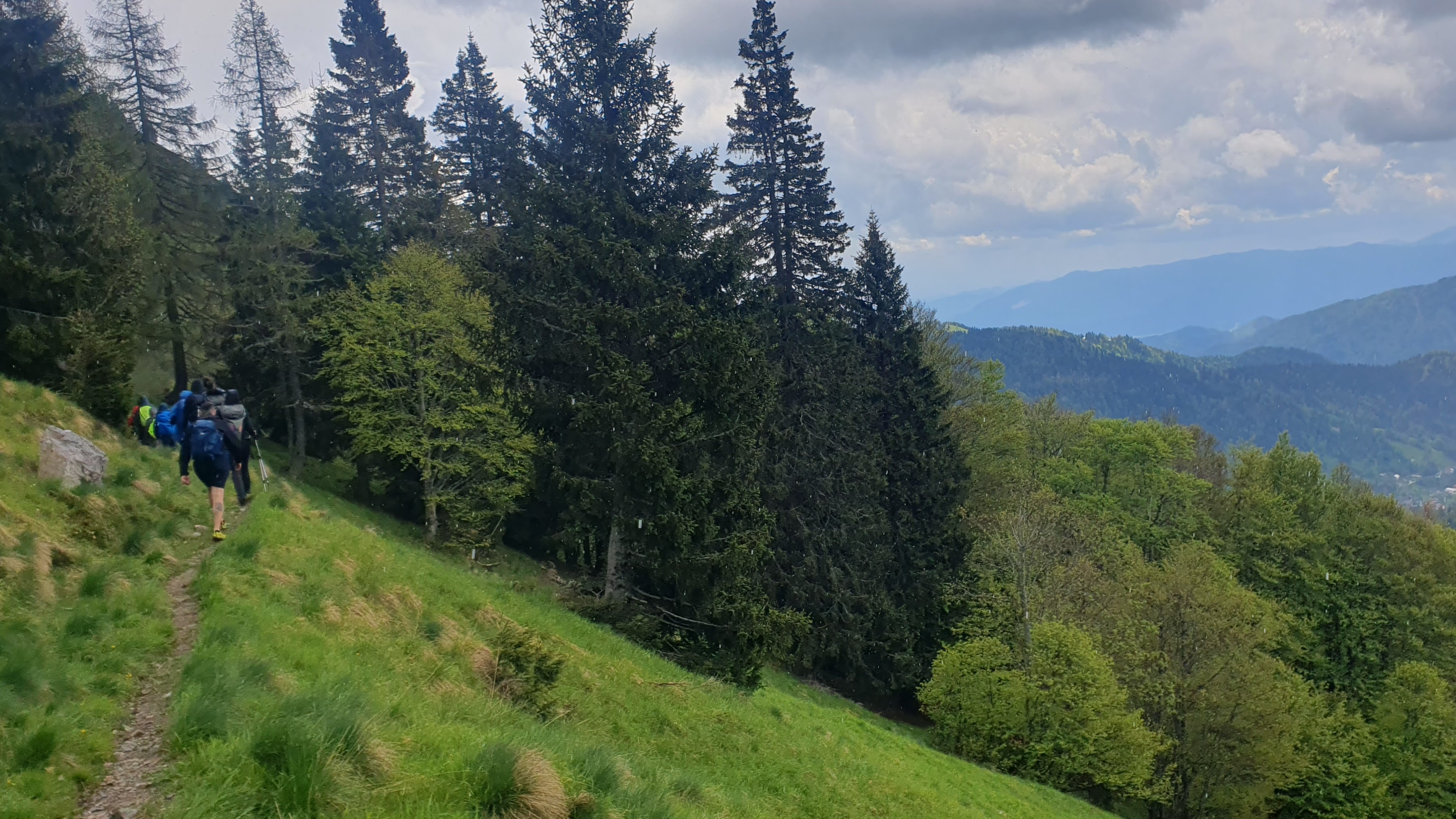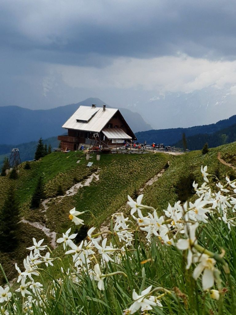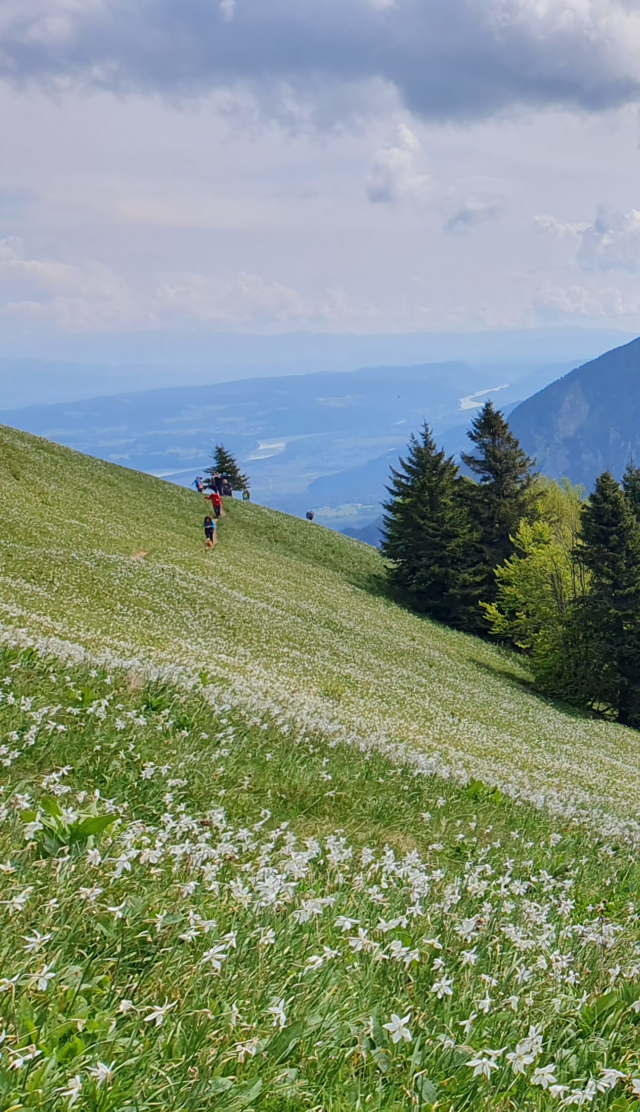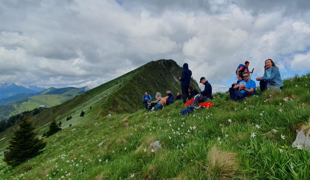 Uspon je to koji oduzima dah, tj. vrlo je strm. Gazimo stepenice ispletene od korijenja smreka, a zatim kratak stjenovit dio osiguran užetom i klinovima. Otvara se pogled na još zasniježene velikane Julijskih Alpa u daljini, a u meni sreću bude nepregledne zelene kosine po kojima se povlači bijeli veo – naše planinske narcise.