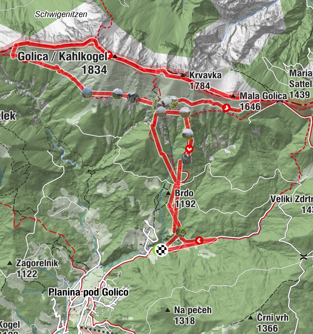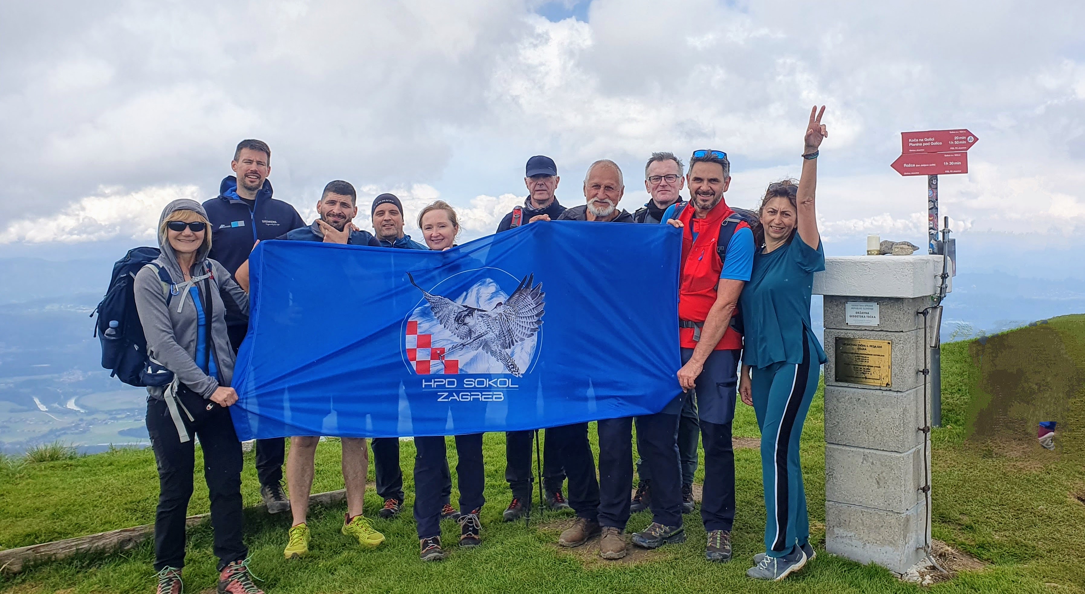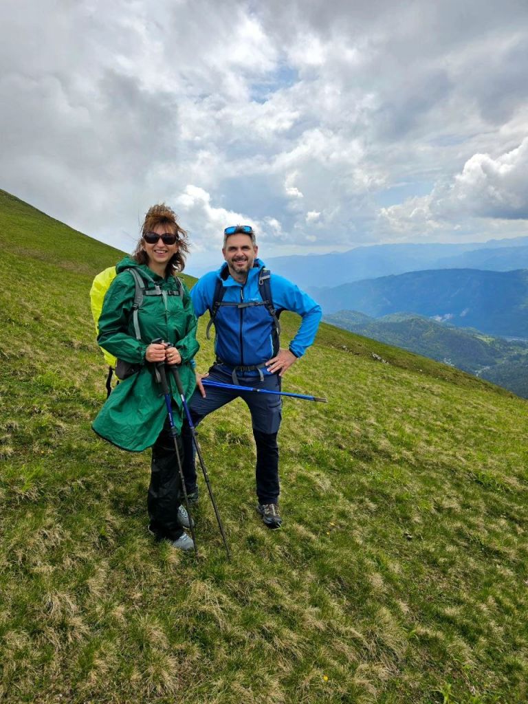 Velika Golica je prostran travnat proplanak s pogledom na Austriju s jedne, a Sloveniju s druge strane. Vesele se ovdje ljudi na raznim jezicima, a pogledi su svima usmjereni prema nebu – stižu prve kapi kiše. Krupne i teške. Hoćemo li požuriti prema domu i kisnuti dvadeset minuta ili nastaviti dalje do sedla Jekljevo, po programu s nadom da će stati? Grmljavine nema, a rastopiti se nećemo, nismo od šećera. 12:30 Stavljamo kabanice, idemo dalje i jedini smo na ovom putu.