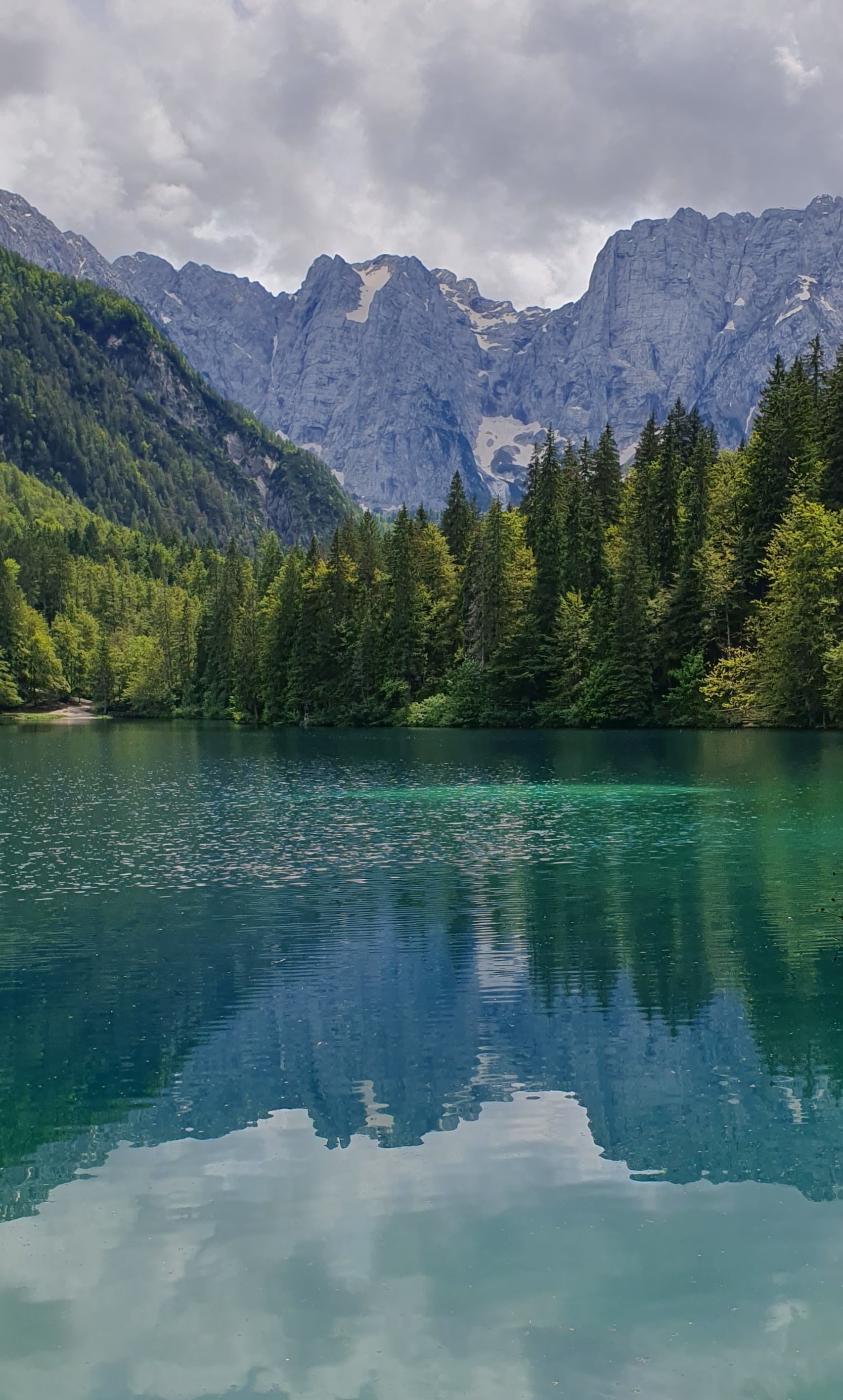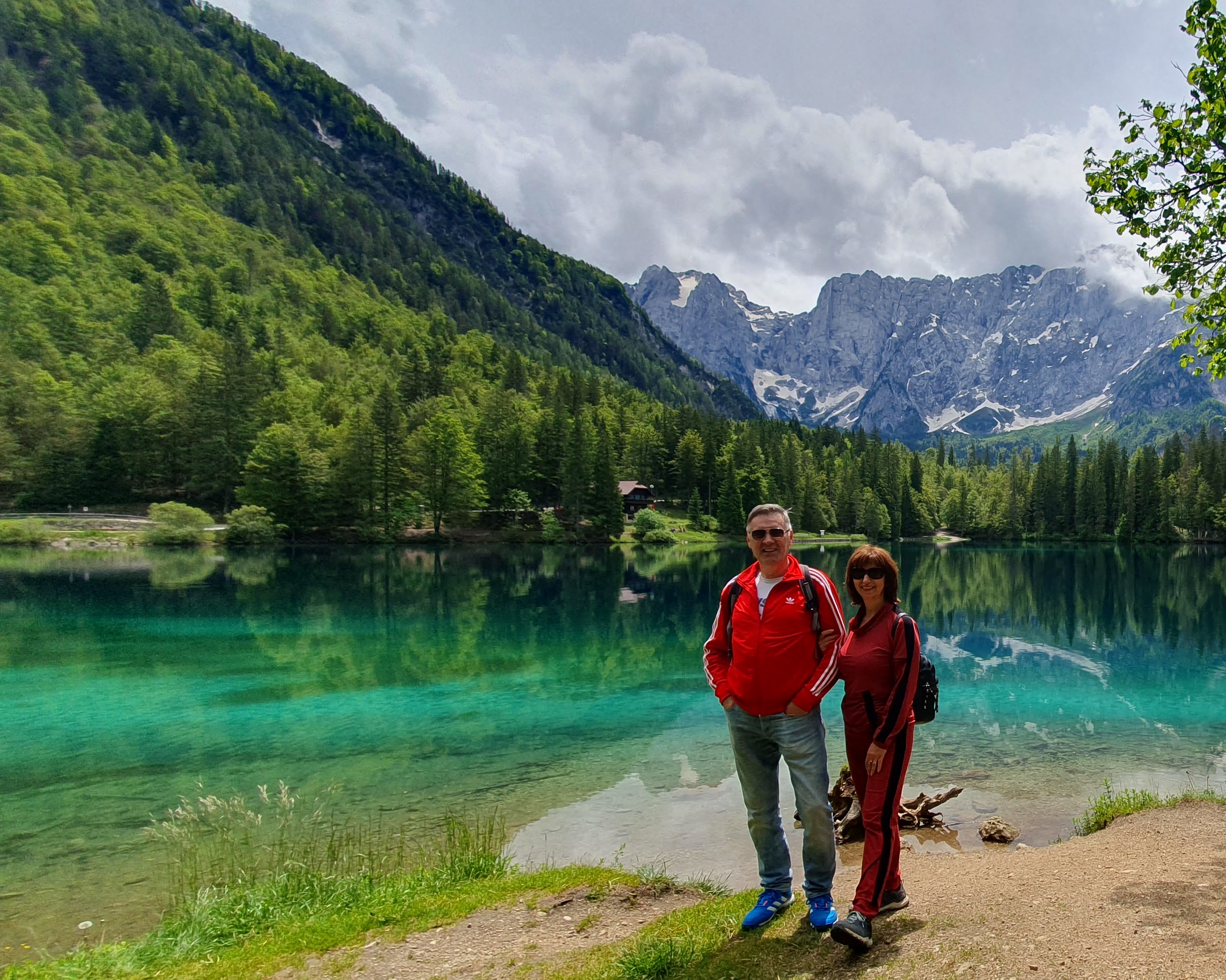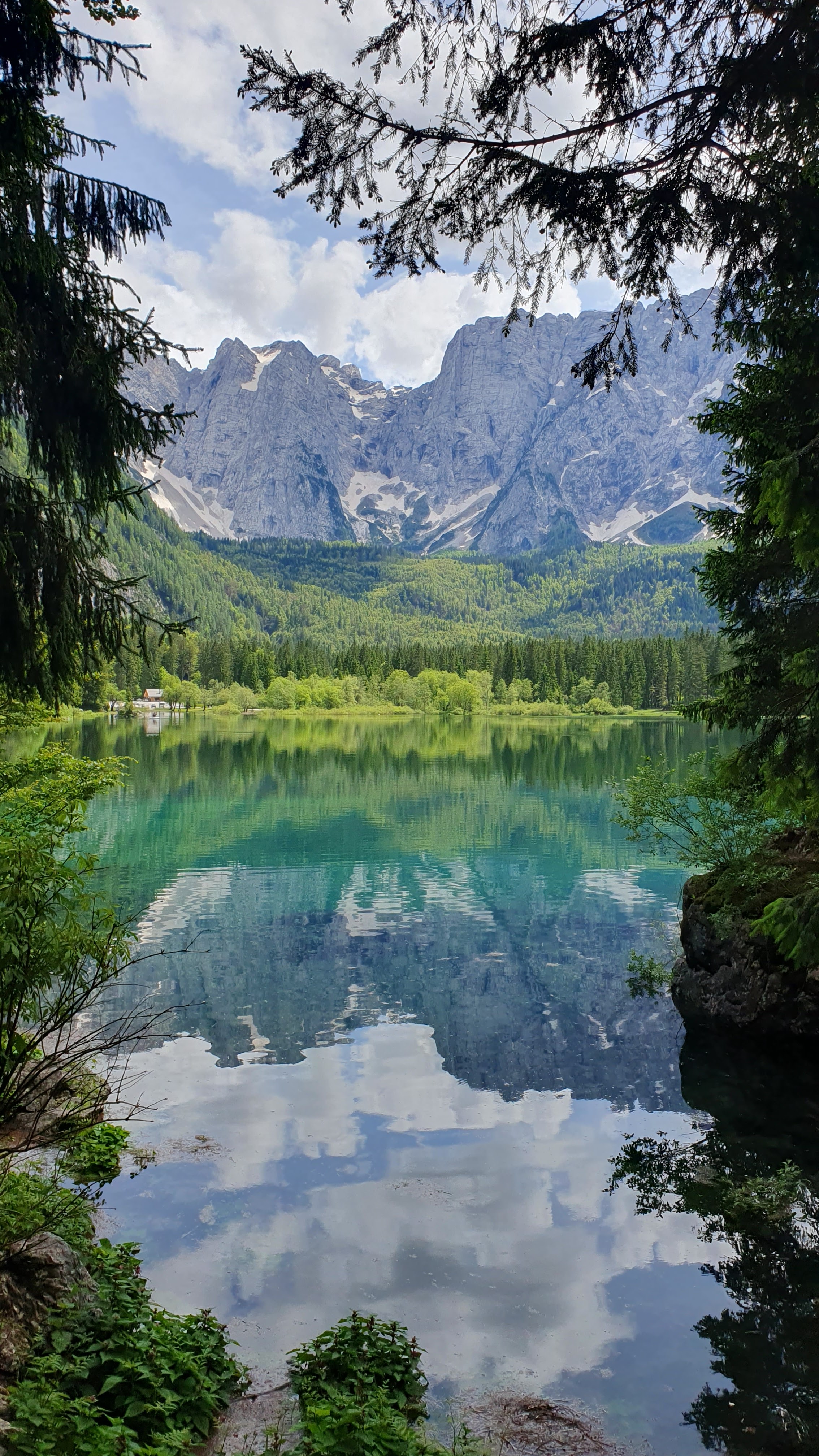 Srijeda je i 45 minuta kasnije, lako pronalazimo parkirno mjesto. Krećemo drvenom stazom uz rub stijene i prelazimo mostić. Ispred nas otvara se markantna stijena Mangarta sa zaostalim plohama snijega, a već sa sljedećim korakom i jezero Lago di Fusine Inferiore. Možda bi jezero bilo samo voda stajaćica da se u njemu ne oslikava svako stablo, svaki žlijeb Mangartove stijene i svaki oblačić, koji nas štiti od sunca, stoga ova voda stajaćica postaje un posto meraviglioso – slika za poster na zidu, naslovnica ljubavnog romana ili uvodna scena filma strave – oni počinju idilično.