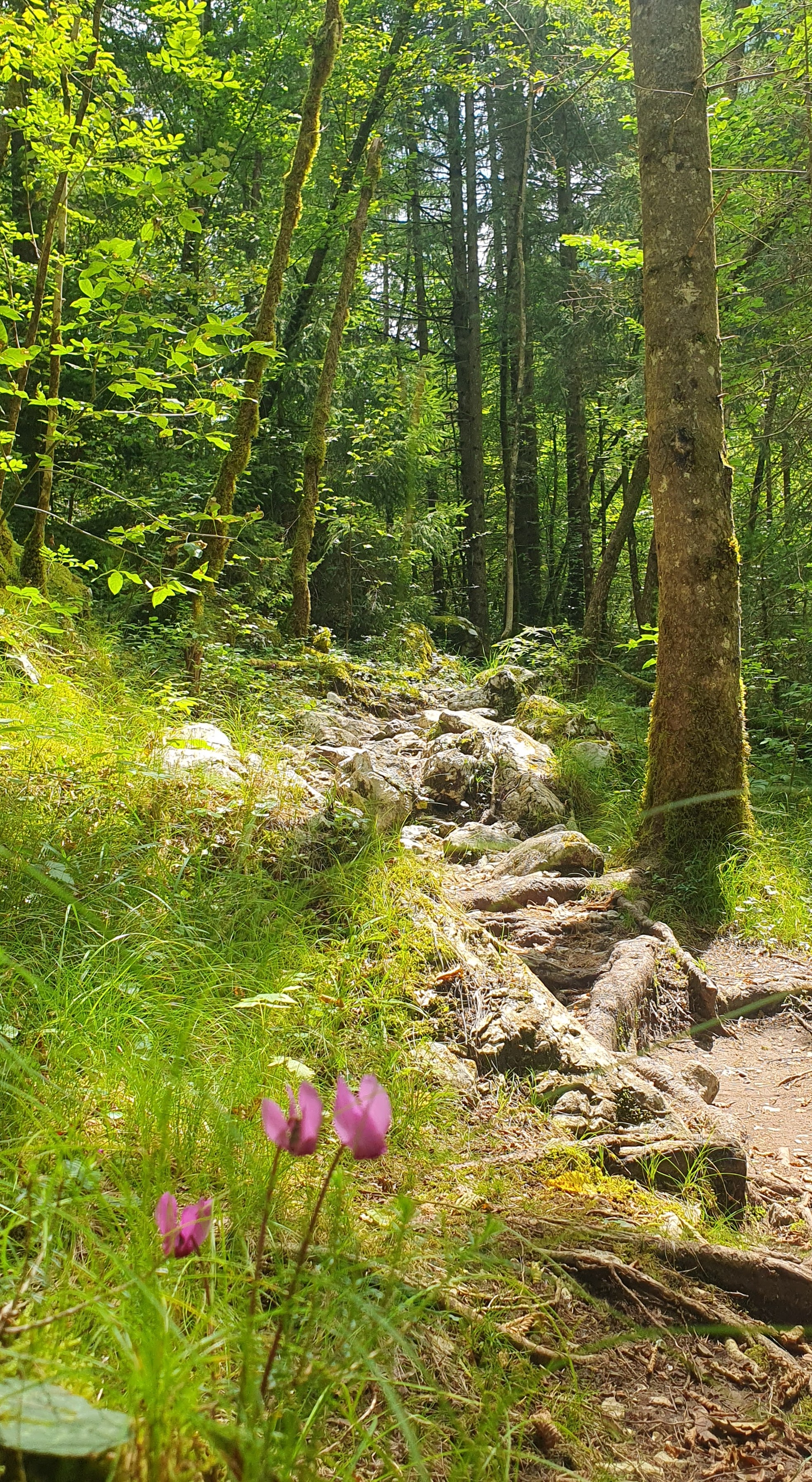 Još par prijelaza preko rijeke i neminovno moramo uzbrdo. Danas savladavamo gotovo 1000 m visinske razlike u cca 28 km. Šumske drvene stepenice, korijenje stoljetnih smreka i puno prijeđenih kilometara čini da mi Goran sa začelja javlja da trebamo pauzu. “U redu, stat ćemo.”, kažem, “Ali nije to još pravi umor.” , “Prva faza pravog umora je urnebesni smijeh, a ne čujem ga. Nakon toga ide faza kad psujemo, jer podsvjesno znamo da tako dajemo sami sebi dodatnu snagu.”