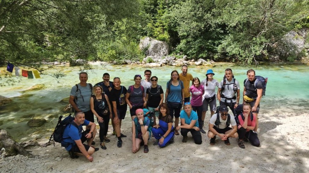 Pažnju mi privlači jedna plaža s još dogležnjakupača i poznati žamor – prijatelji. Njih petero prolazi put u suprotnom smjeru. Grlimo se znojni i vedri. “Dođite se kupati s nama!”, veselo nas pozivaju na dvije – tri minute kupanja, jer više se ne da izdržati. Skidam opet cipele i čarape. “Dobro je, boli!”, govorim, a Lili se smije: “Mislim da to još nitko nije rekao u istoj rečenici!” 🙂 “Kako se vi vraćate do auta?”, pita netko. – “Ako nam date ključeve od automobila, vratit ćemo se s vašim autima i ujedno vama vratiti aute.”, tako je pao najbolji prijedlog oko povratka – sad ne trebamo žuriti na posljednji lokalni autobus, koji od doma pri izviru Soče kreće u 18:35 prema Bovcu.