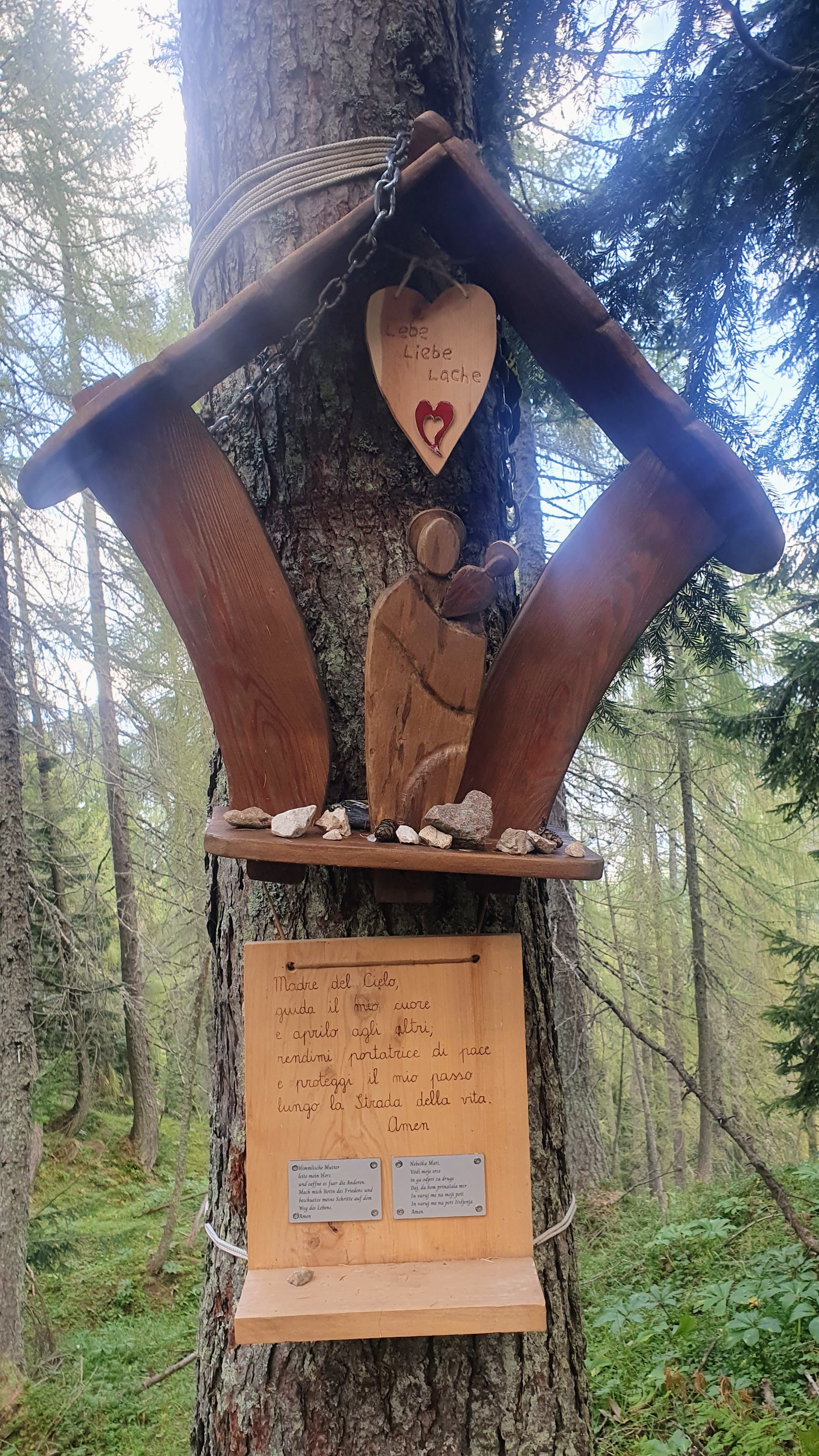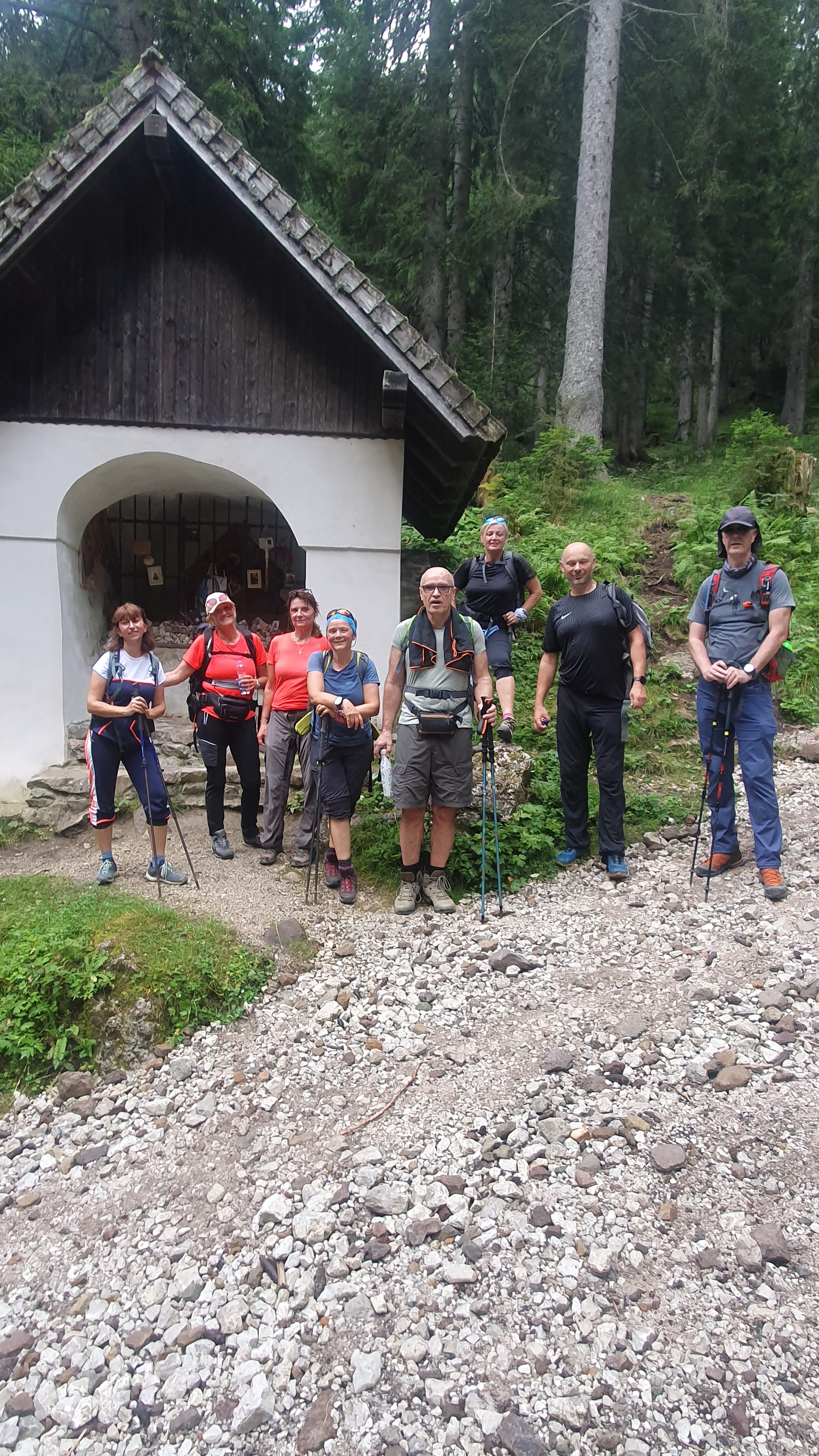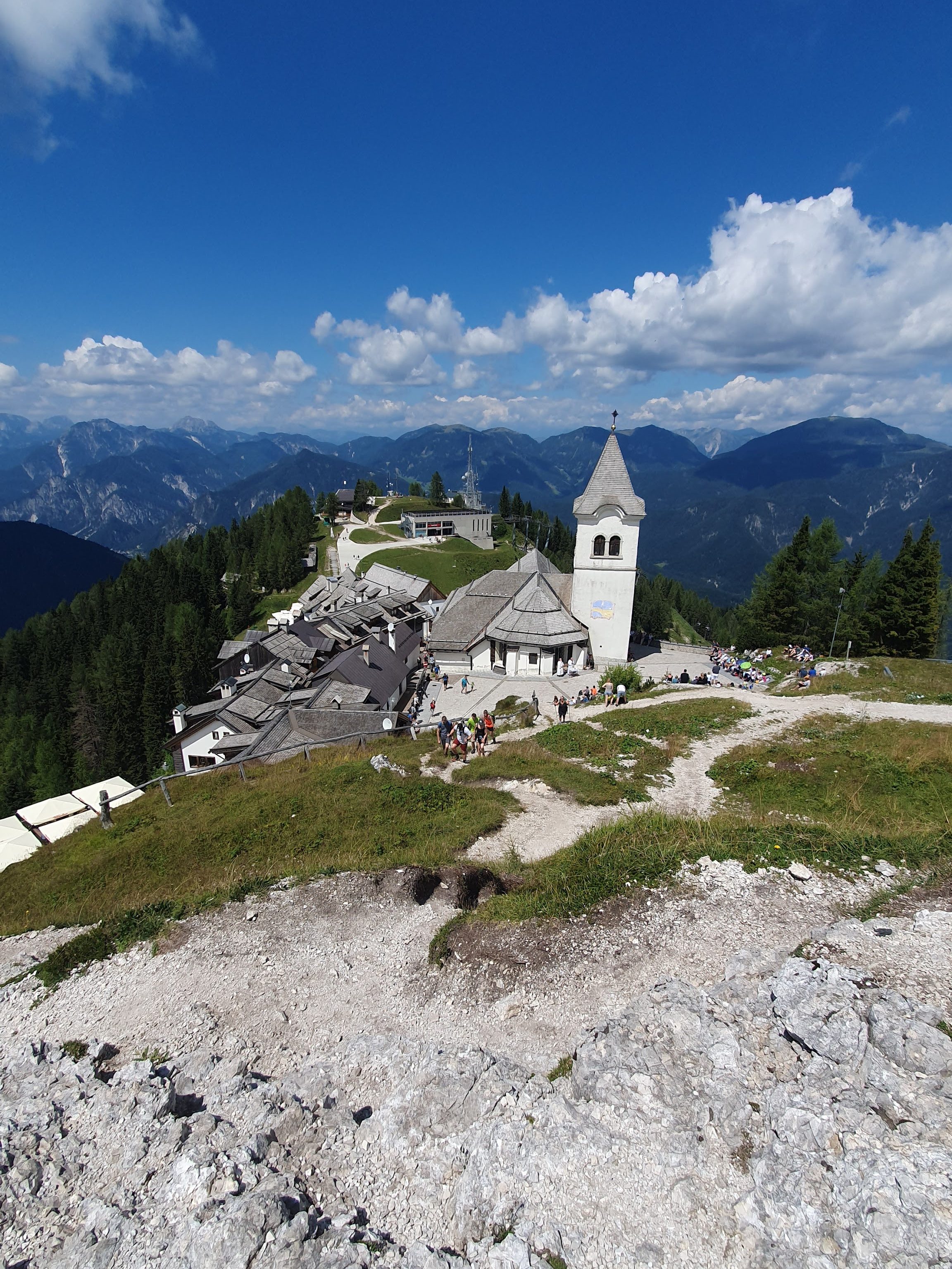 Moglo je biti lako – uspinjačom za trinaest minuta, ali nije – idemo pješke, jer čovjek je stvoren za kretanje, nije li? Hodočasničkom stazom iz Tarvisia, koja je ujedno i Križni put marljivo gazimo ambicioznim jutarnjim korakom. Široka šljunčana staza vodi nas kroz šumu i u debelom smo hladu – što bi trebalo biti odlično, no to ne umanjuje napor koji je potrebno uložiti da savladamo tisuću metara visinske razlike u samo pet kilometara.