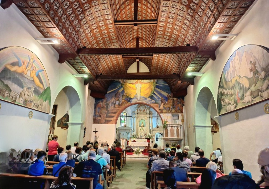 Čarobno selo Monte Lussari jedva nas je primilo u svoju jedinu, usku uličicu krcatu koještarijama, a s mirisom talijanskih delicija. Puno je gostiju danas. Tjestenine i pizze služe se na malim stolovima. Glasno je, preglasno. Atmosfera tipica Italiana! Ulazim u crkvu Sv. Marije po nekoliko trenutaka mira i svježine, kakva se ovdje samo u crkvi može naći.