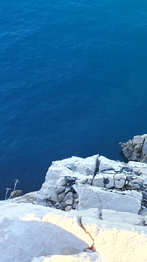 Dok crkvena zvona zvone za početak mise, mi se spuštamo još 130 metara do mora, jer nalazimo se na stijeni iznad mora. Idemo se zagledati u beskonačnost pučine, osjetiti bezbrižnost trenutka, možda umočiti noge i svakako nešto pojesti iz ruksaka.