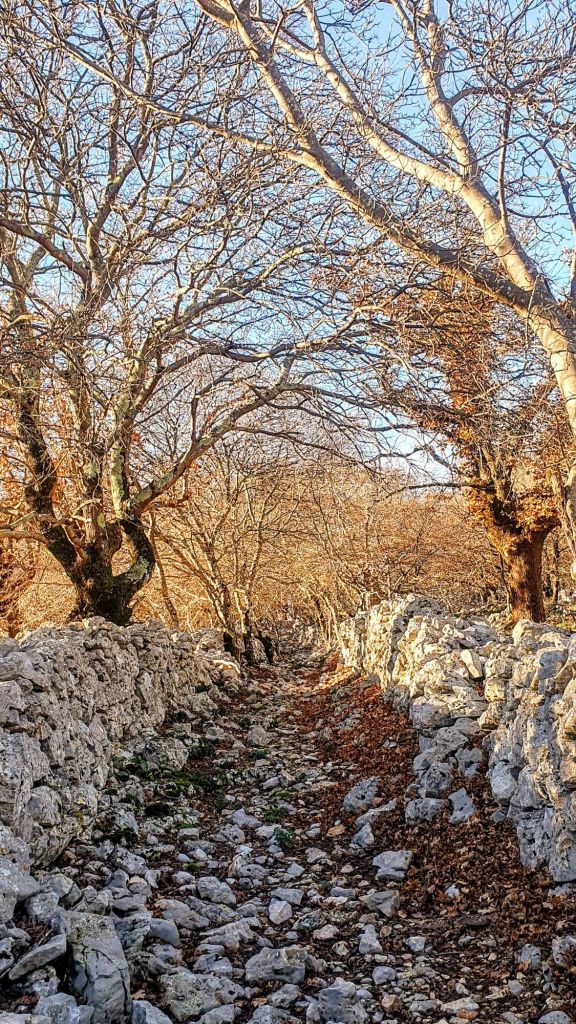 Bilo je to nekad naseljeno područje, nekoliko sela, puno ljudi, stoke, njiva i pašnjaka. Volovska staza kojom hodamo sagrađena je još u srednjem vijeku, a trenutno posuta šuškavim lišćem stoljetnih hrastova između kojih vire njegovi neobični okrugli žirevi. Podižem jedan da ga bolje pogledam, a ima ih i u krošnjama.