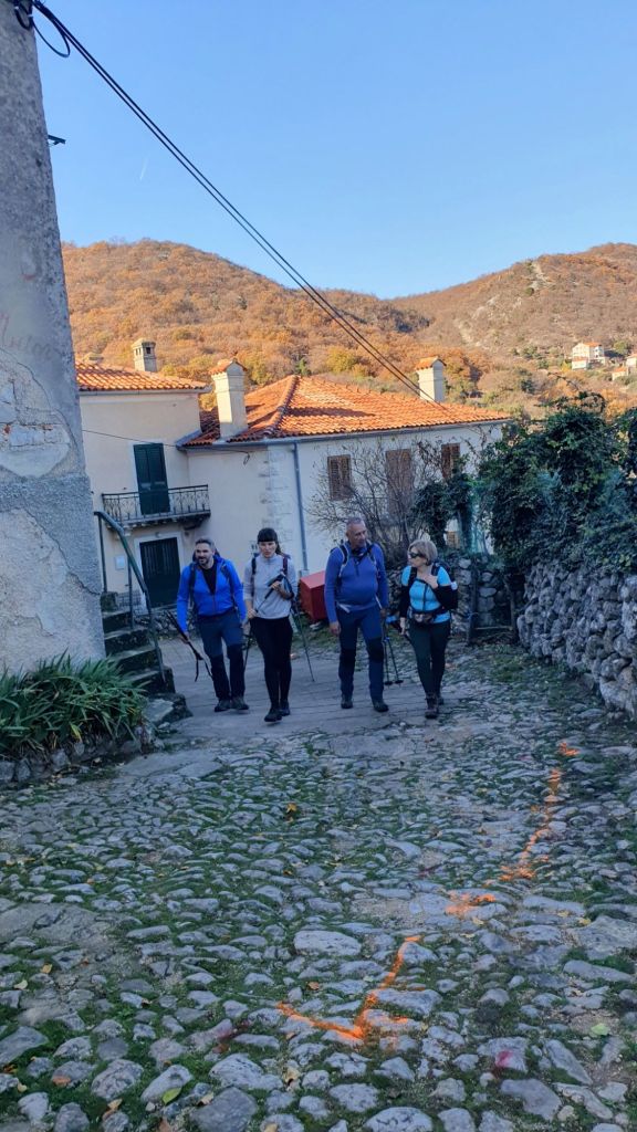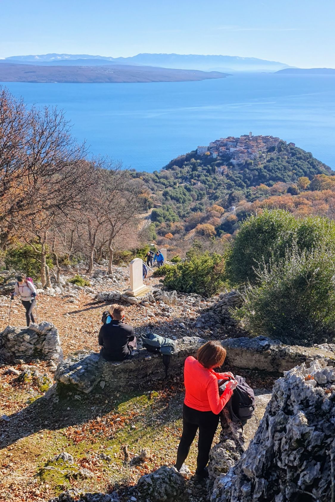 Spuštamo se na drugu stranu otoka. Otvara se pogled na more i zasniježene velebitske vrhove. Boris je popio svoju pivicu. Neki smo pomalo gladni. “Gle, vidi se Beli!” – “Prekrasno!” Žurimo što prije doći u stari gradić na brežuljku, jedan od najstarijih na otoku, no zdesna su nove mramorne postaje križnog puta i mame nas. “Idemo prvo na križni put. Imamo dovoljno vremena.”, odlučujem.