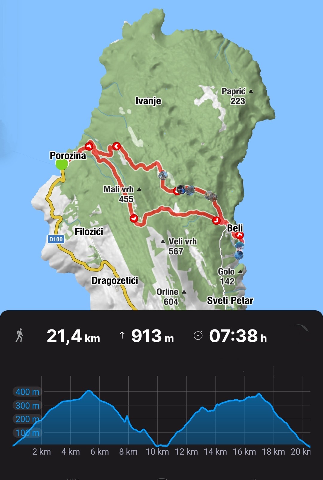 Kružna staza od dvadesetak kilometara uz devetsto metara visinske razlike sasvim je dovoljna za jedan dan, kažu neka koljena. U Porozinu stižemo prije mraka i taman na željeni trajekt u 16:30. Nismo posjetili centar za oporavak bjeloglavog supa, niti obišli labirinte, moramo nešto ostaviti i za drugi put!