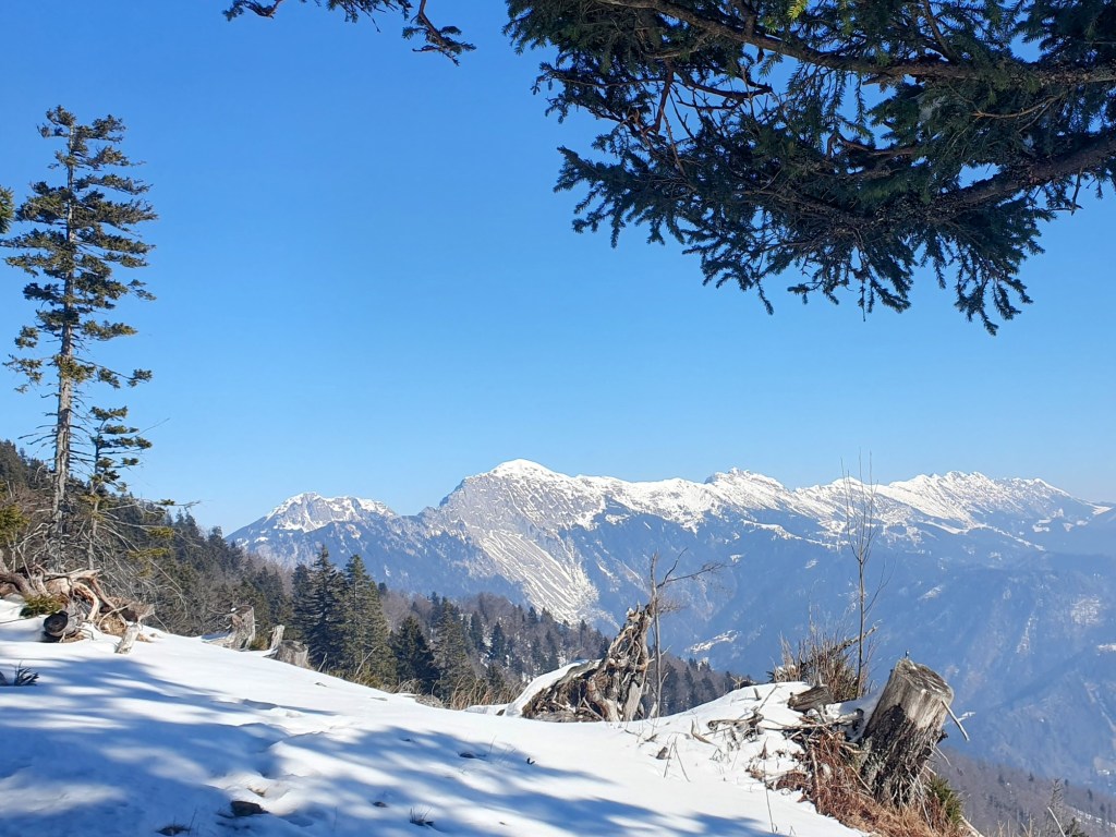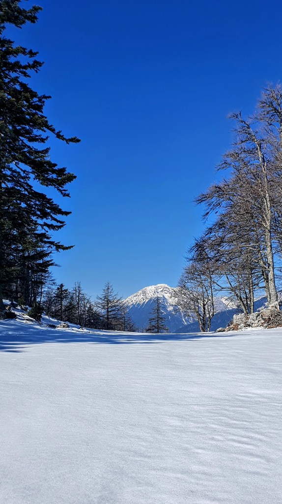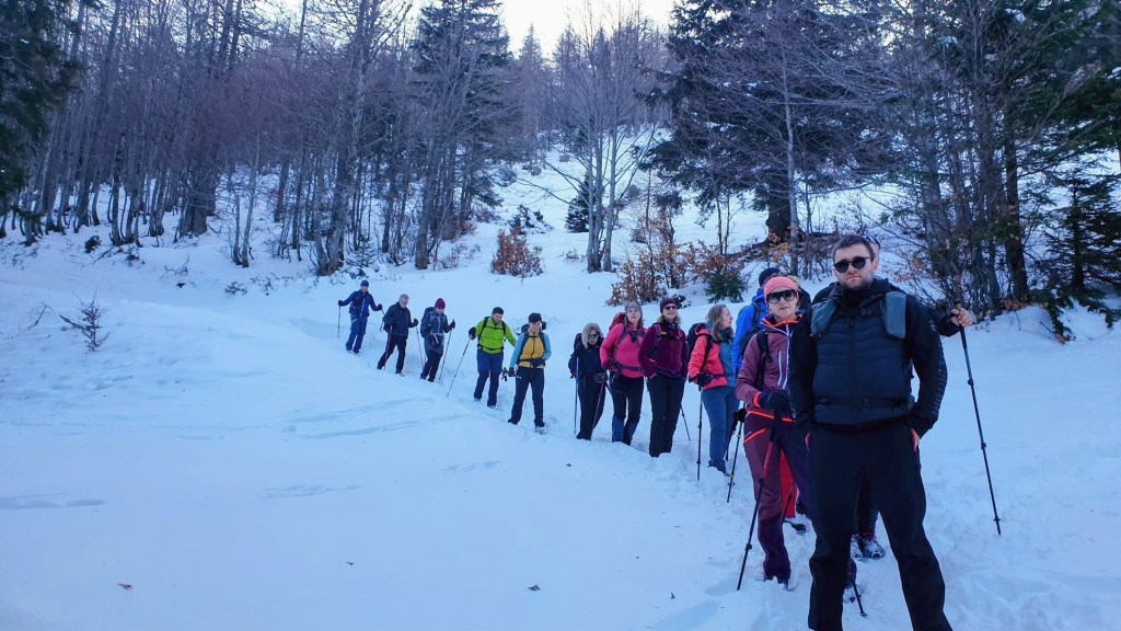 pored Breške i Bistriške planine ugodnom snježnom stazom. Kroz krošnje visokih starih smreka probijaju se sunčeve zrake, a mi koračamo nečujnim koracima po besprijekornoj bjelini nizbrdo. Barem se nakratko prestajem pitati kako bi nam bilo na Snežniku, jesmo li dobro odlučili Goran i ja. Sigurno bi nam bilo hladnije, sigurno opasnije, vidici nikakvi, možda uzbudljivije. Saznat ću na fb, netko je sigurno tamo bio.