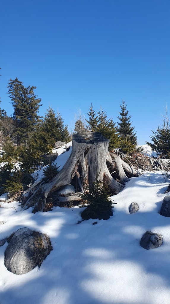 Otvara se pogled na greben Košute, od Velikog vrha slijeva do Košutnikovog turna skroz desno. Danas moju pažnju imaju panjevi – skršena stabla od prirodnih sila ili srušena ljudskom rukom, svejedno ostaje trag njihovog postojanja, i dalje imaju svoje mjesto na svijetu.