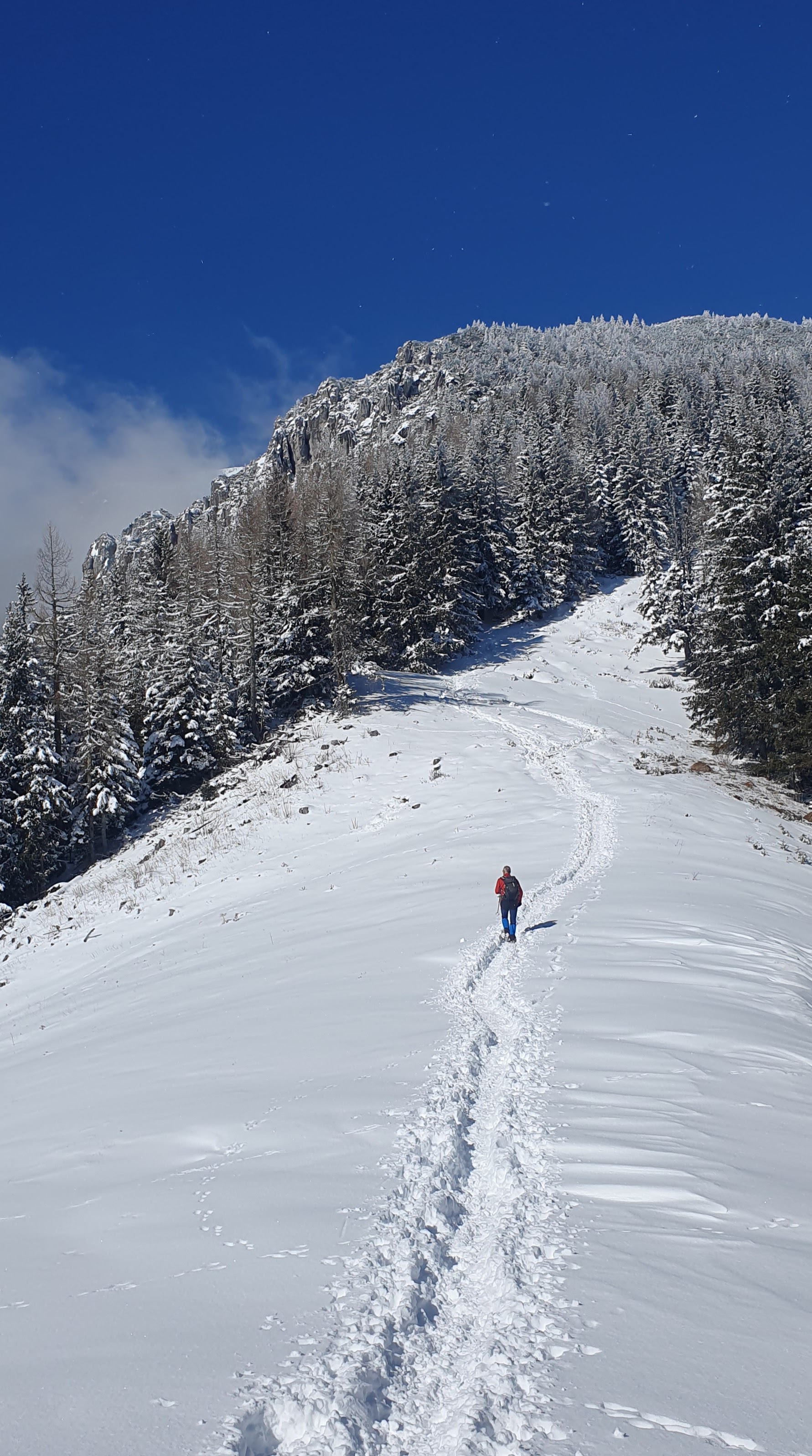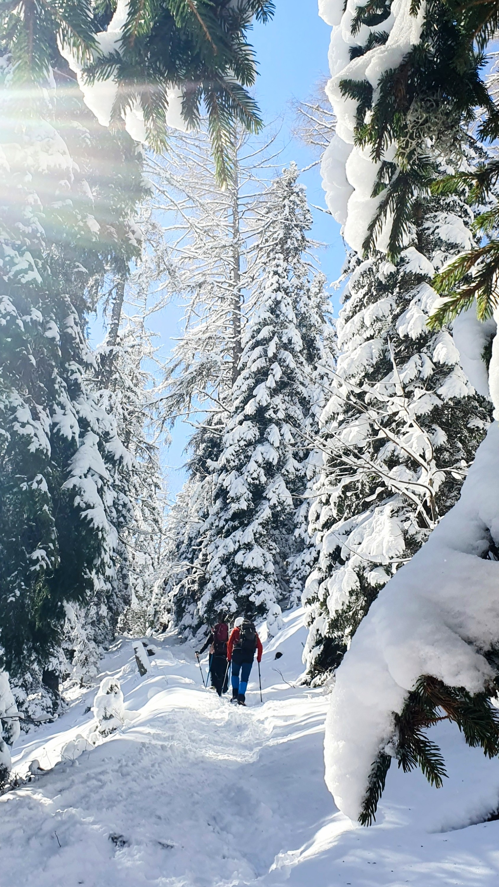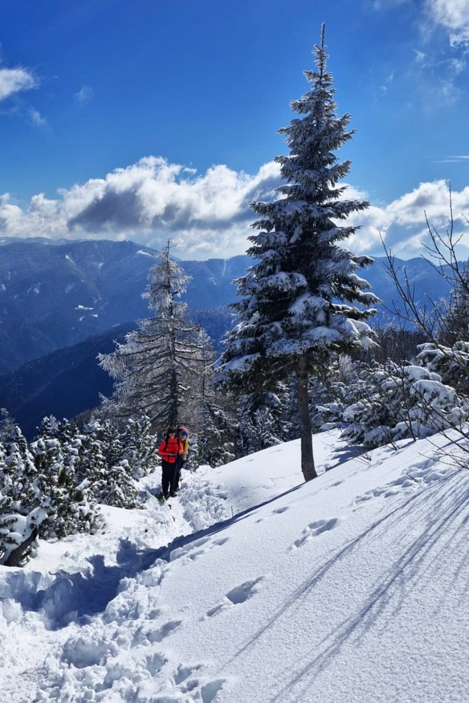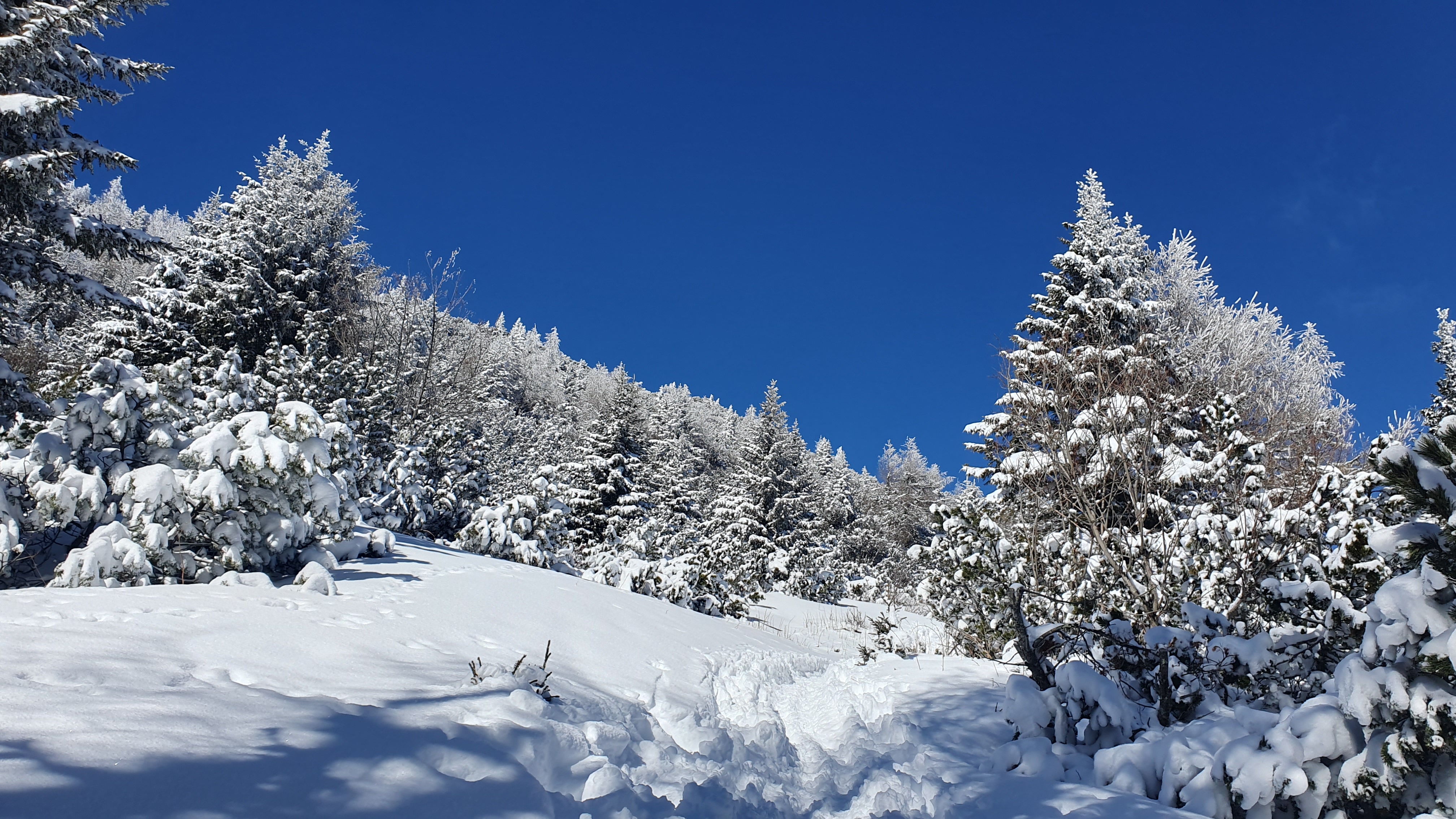 Hodamo po savršenom tepihu od dvadesetak centimetara svježe napadalog snijega šumskom stazom, koja s vremena na vrijeme siječe širok kolni put. Grane prekrivene snijegom protežu se kao da žele dotaknuti nebo, a ono ne može biti plavije. Dan ne može biti ljepši, još samo da ne idemo uzbrdo!