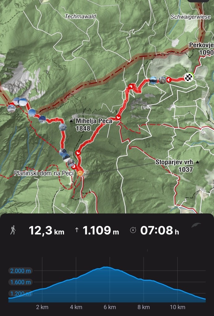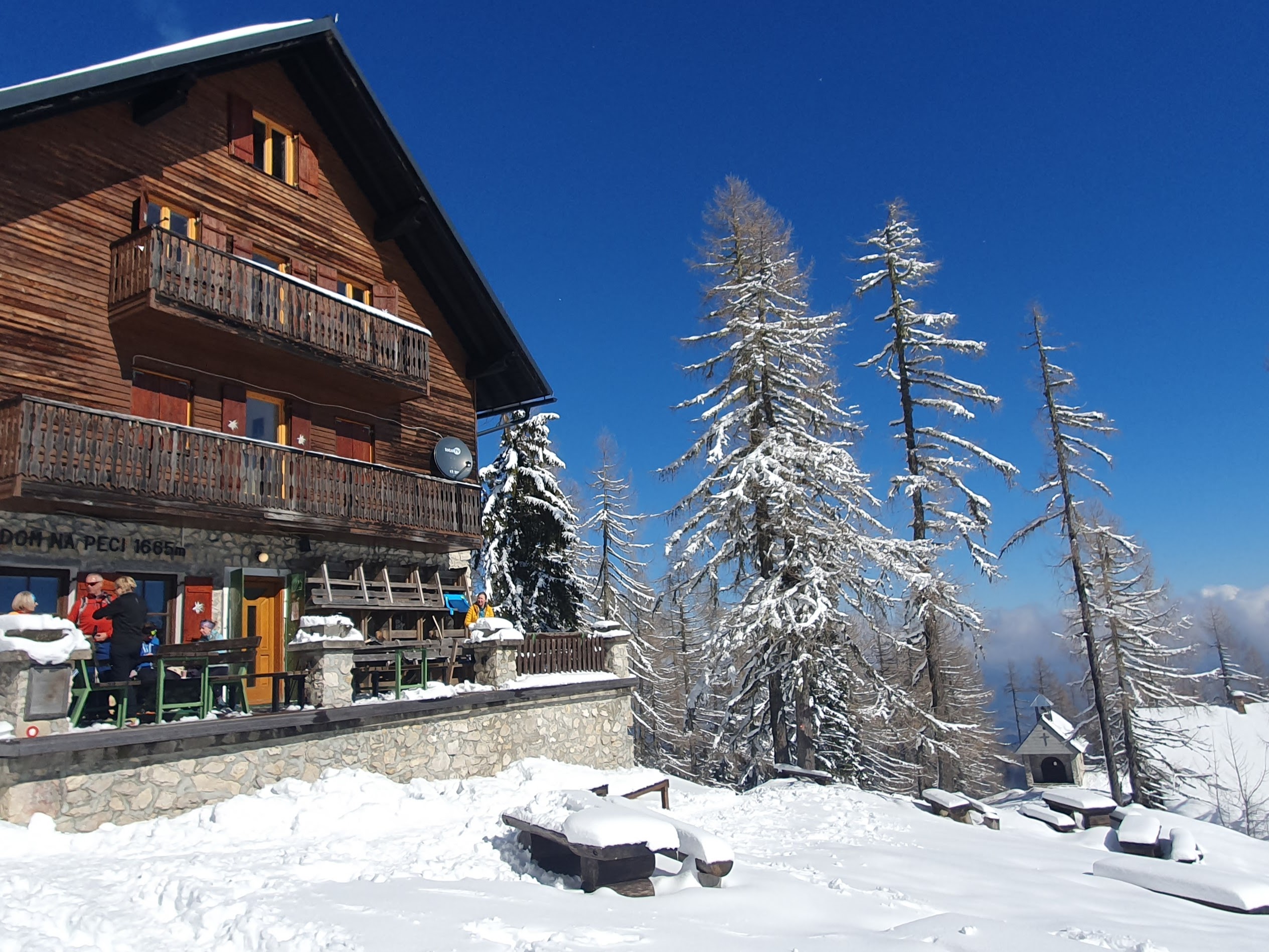 Nakon dva sata sjedamo na terasu planinarskog doma na Peci, na 1665 mnv. “Dober den, izvolite!”, srdačna mlada domaćica već je kraj nas. “Ništa za sad. Idemo prvo do vrha, poslije ćemo sjesti i uživati kod vas.”, objašnjavamo, “Nadam se da ćemo stići. Do kad ste otvoreni?” – “Otprti smo do tri, imate dost časa, a i imamo svega za pojesti – gulaš, pasulj, štrudle…”, uvjerava nas i mami lokalnom hranom da se požurimo. Nadam se da neće sve pojesti neki drugi gladni planinari.