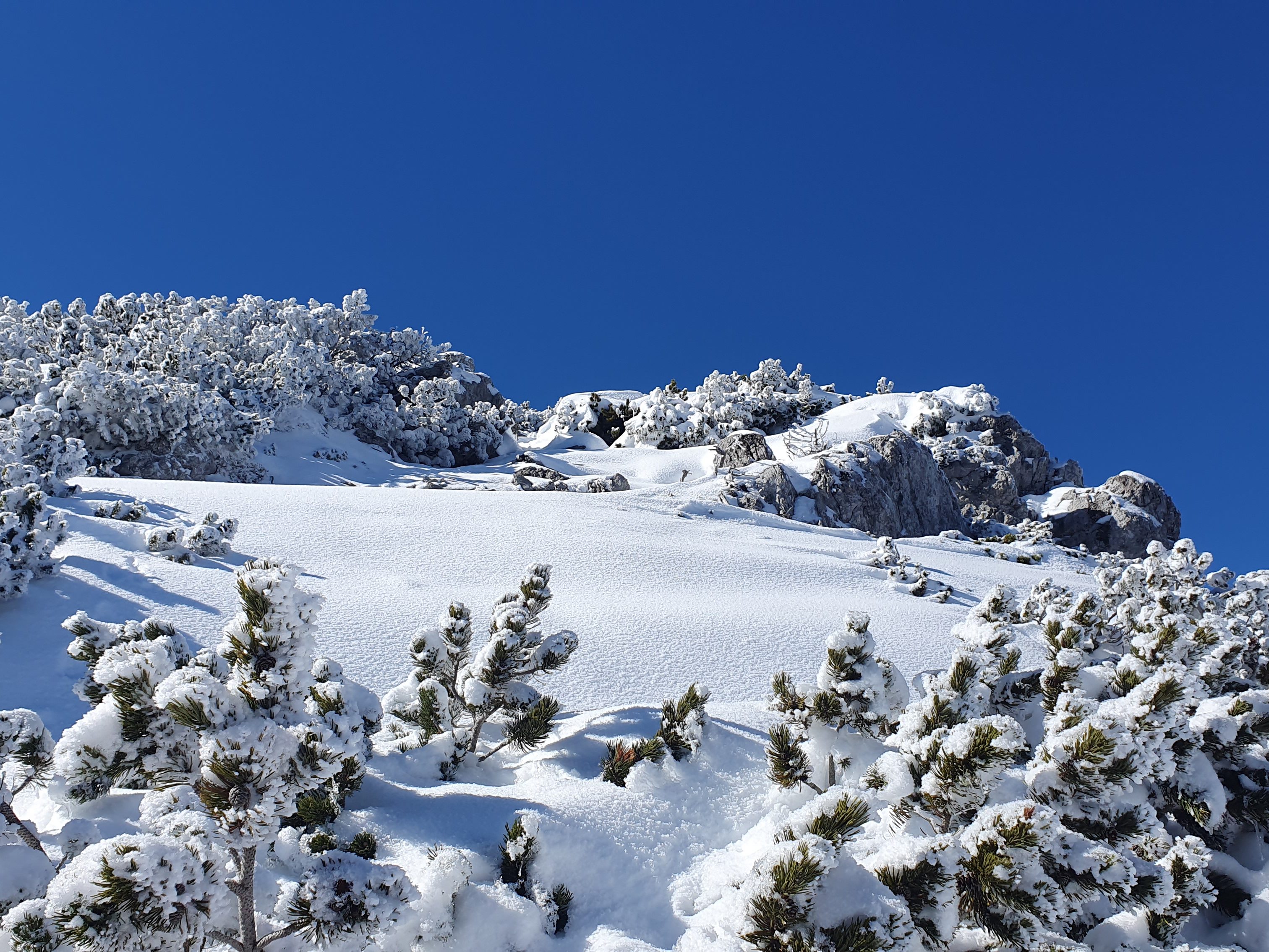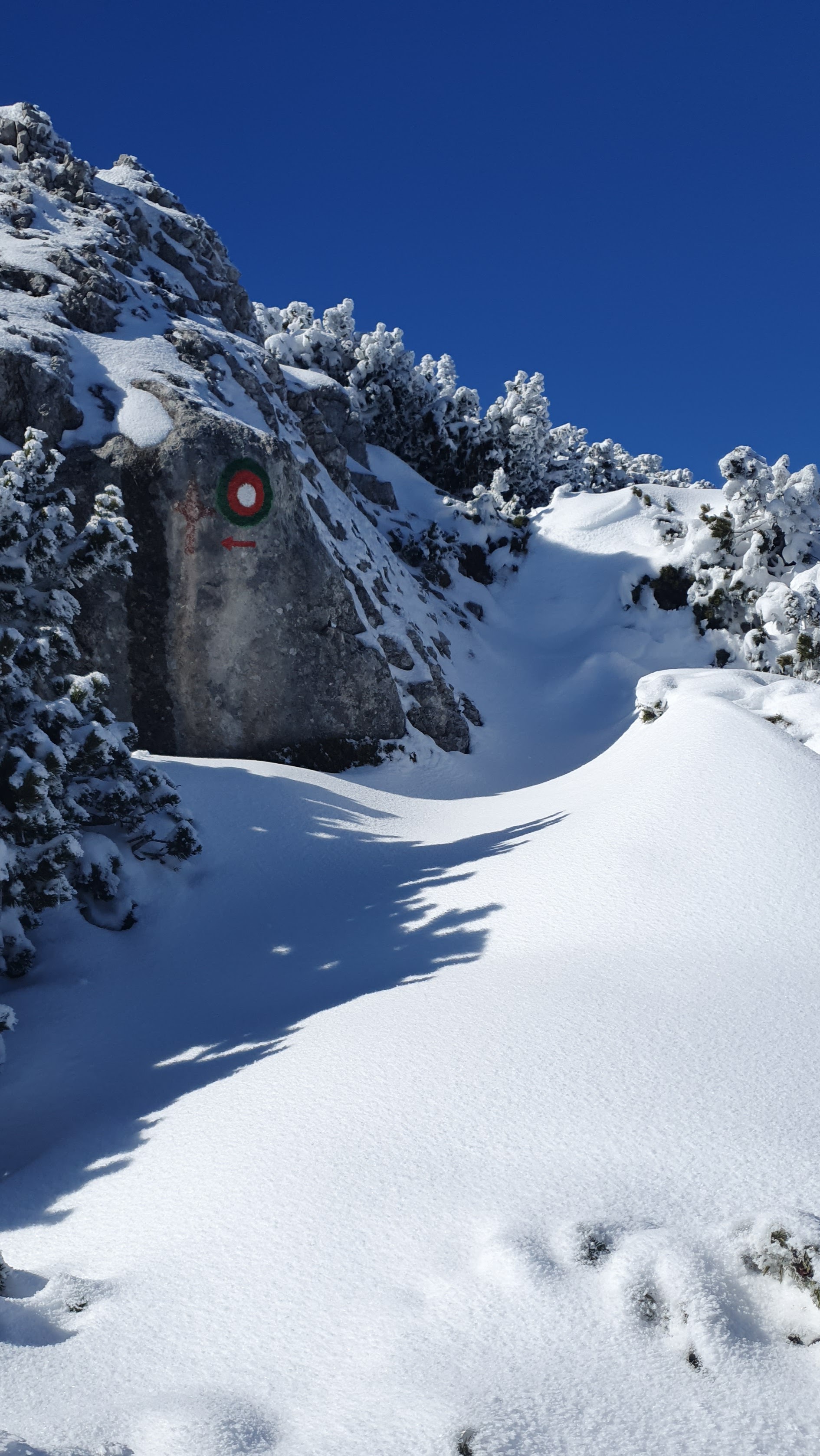 Stavljamo dereze. Staza je ishodana i na nama je samo da je slijedimo nečujnim koracima. Srećemo nekoliko planinara koji se već spuštaju. Planina danas ispunjava sve moje želje – savršeno plavetnilo u kontrastu s bjelinom, a zasniježene smreke smjenjuje klekovina prekrivena još čvrščim slojem snijega i leda.