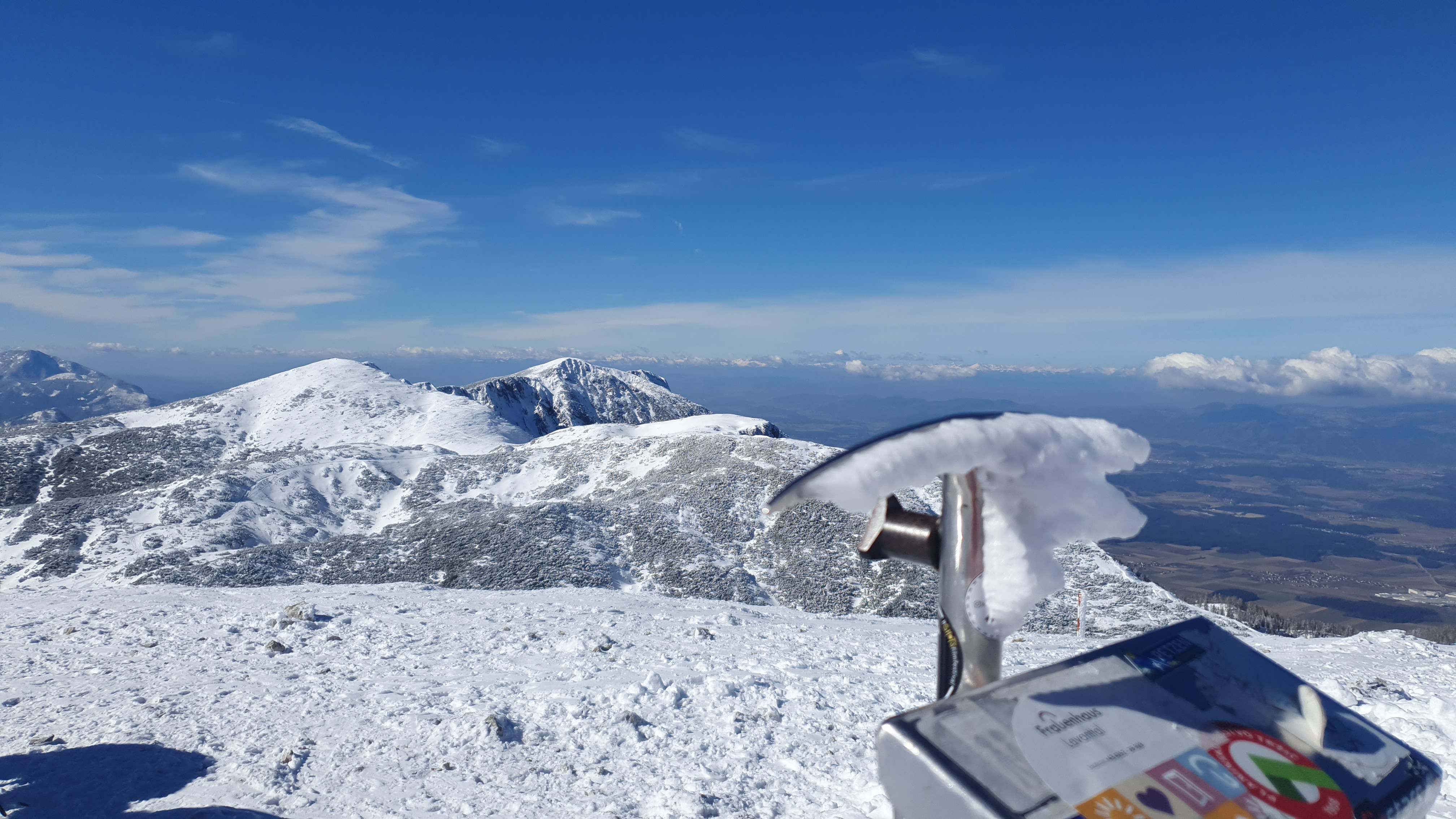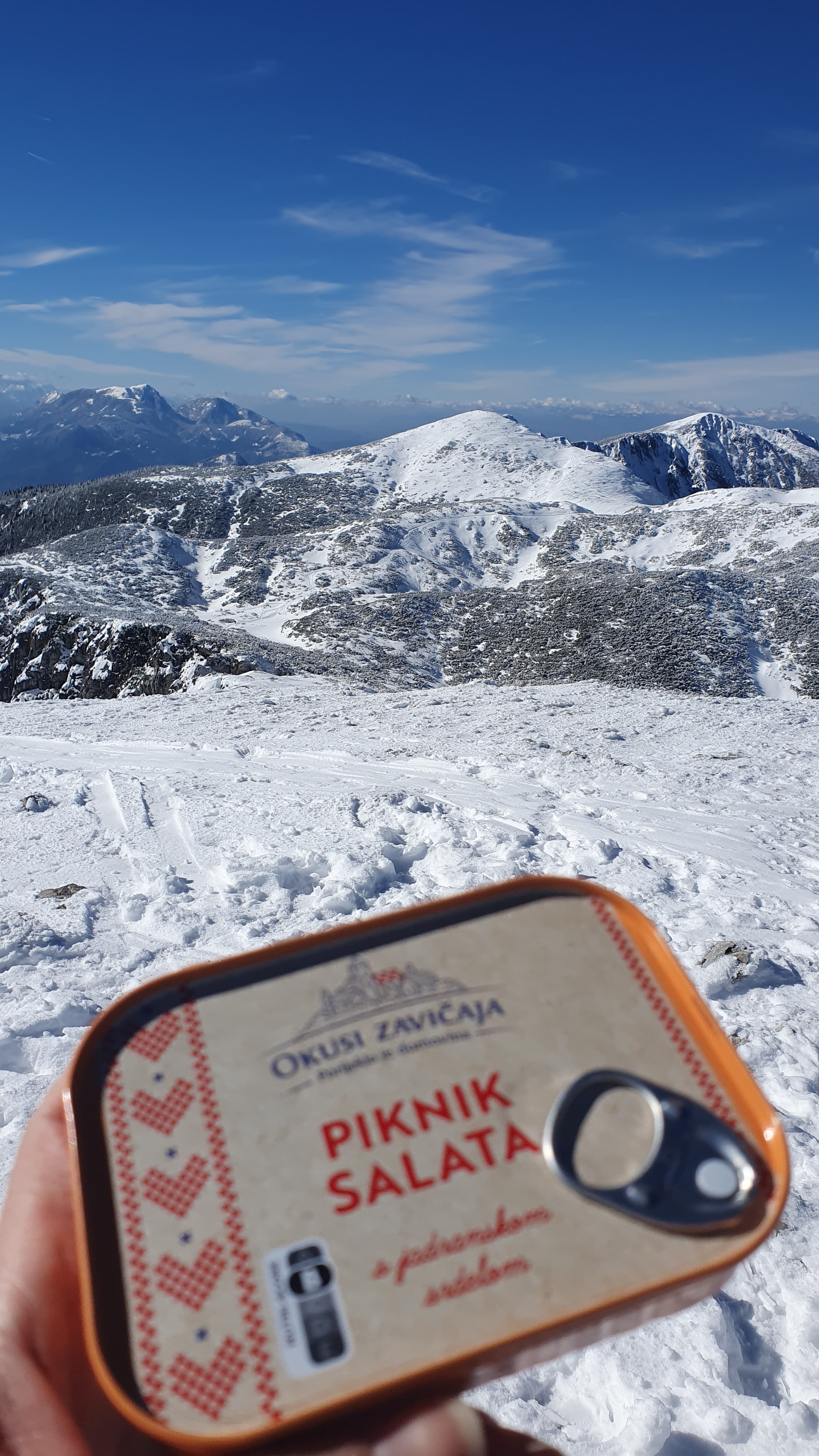 Odavde se otvaraju i nove mogućnosti za nastavak planinarenja po grebenu i možda bismo poželjeli ići dalje da vjetar nije leden, a želuci prazni. Sjedam da otvorim, za ovaj vrh odabranu, konzervu salate sa srdelom okusi zavičaja.