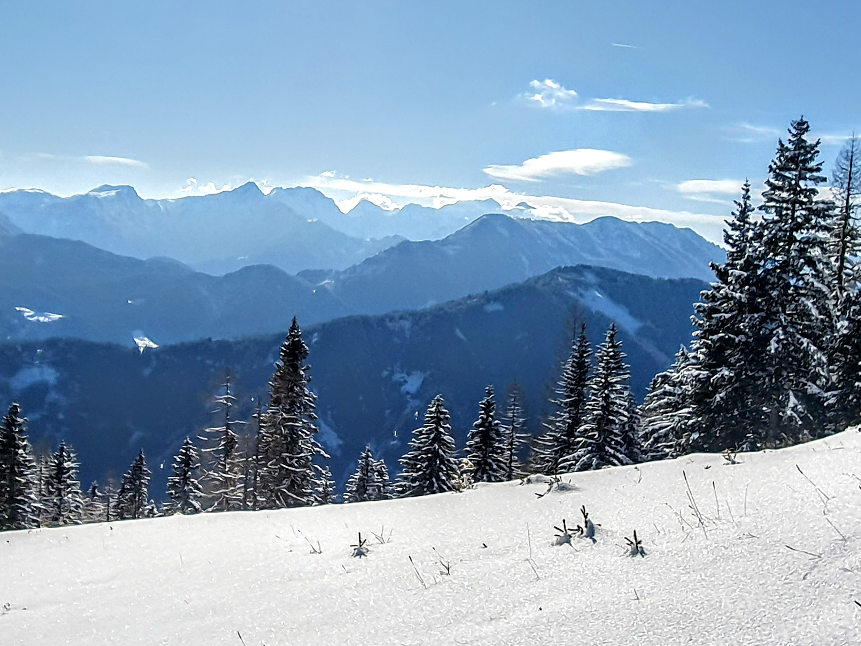 Na početku staze nema snijega, samo kukurijeci i pjev ptica, no ubrzo smo na bijeloj podlozi i sa svakim novim korakom radost se širi žilama. Otvara se pogled na dolinu i susjedne planine, a ističe obližnja Uršlja gora, usamljena i šiljata.