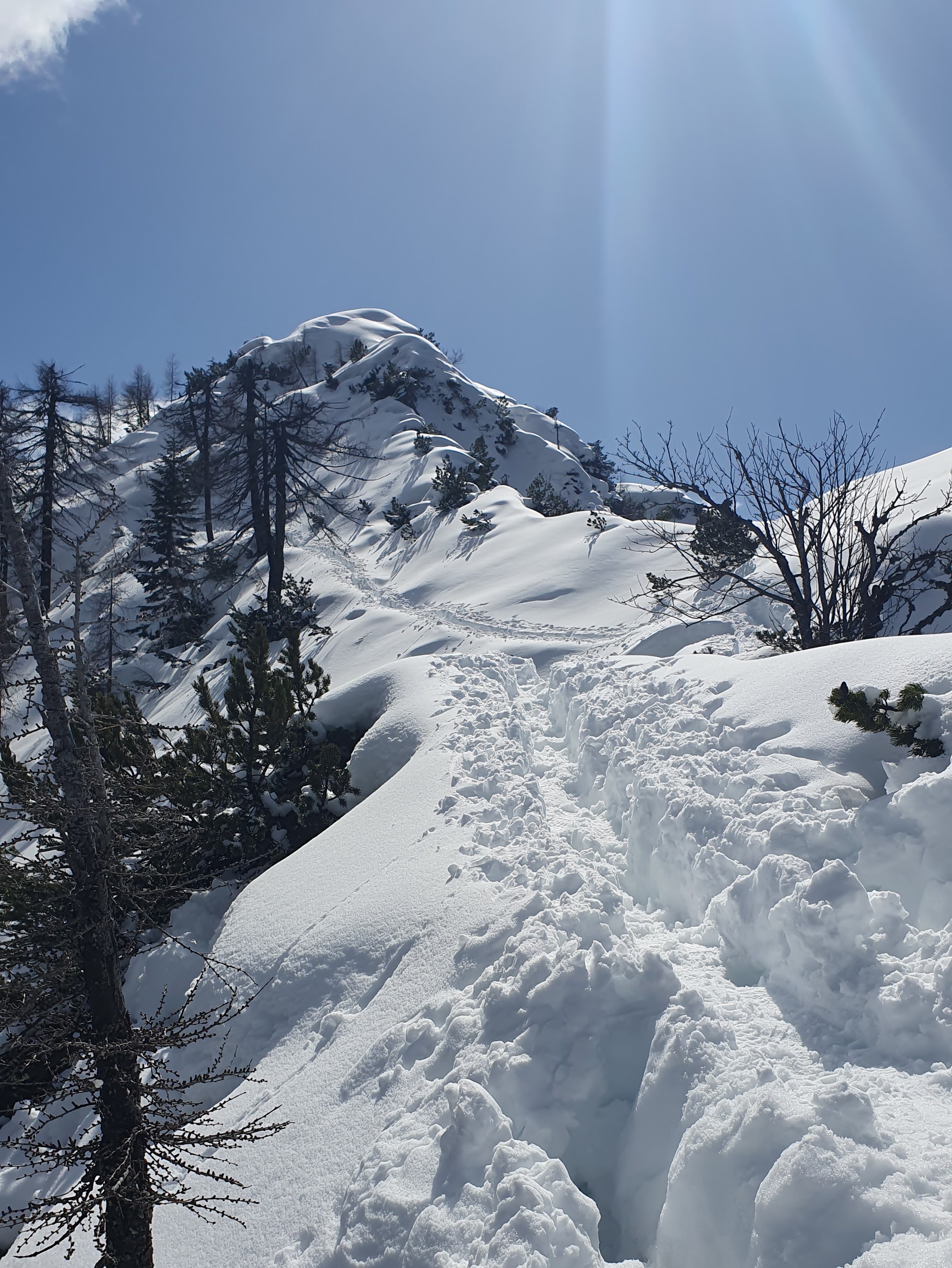 Dvadeset minuta kasnije staza koja vodi grebenom borove šume zaustavlja nas na trenutak na vrhu Vitranc i pušta dalje prema Ciprniku. Stazom se lako hoda, iako je pored staze snijeg dubok gotovo metar. Snijeg na granama se topi i kaplje po nama, a najradije za vrat i zato hodamo dosta brzo.