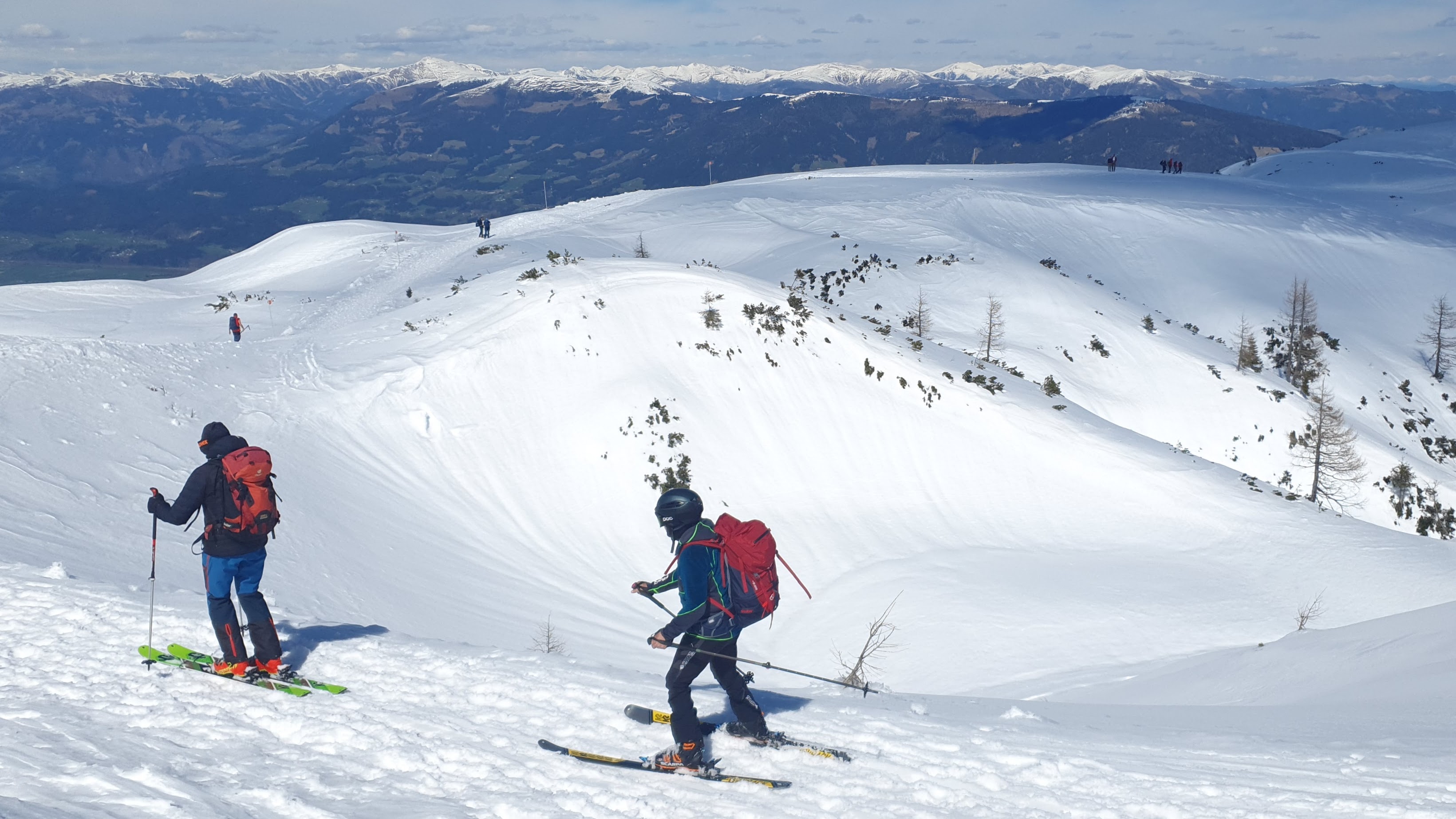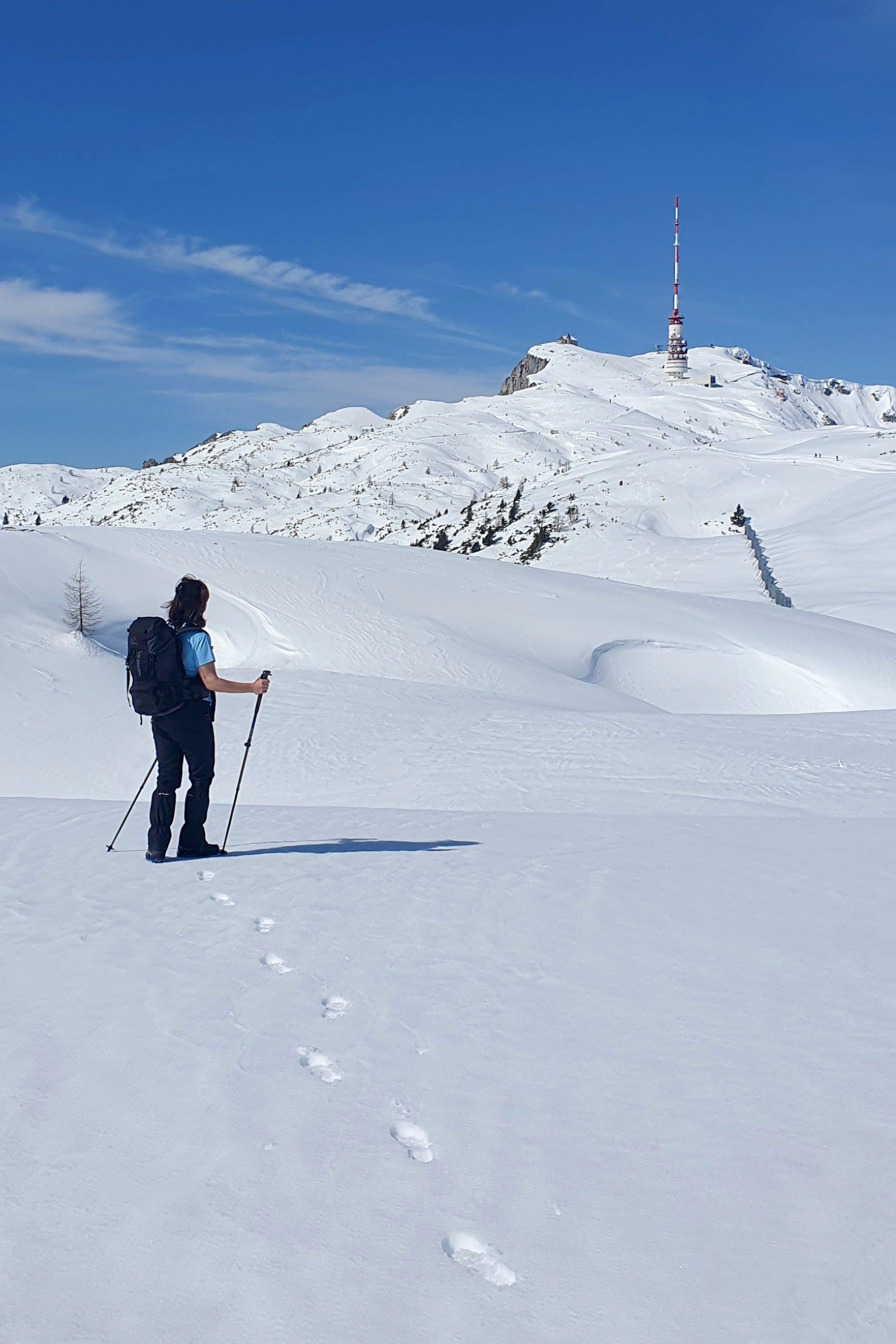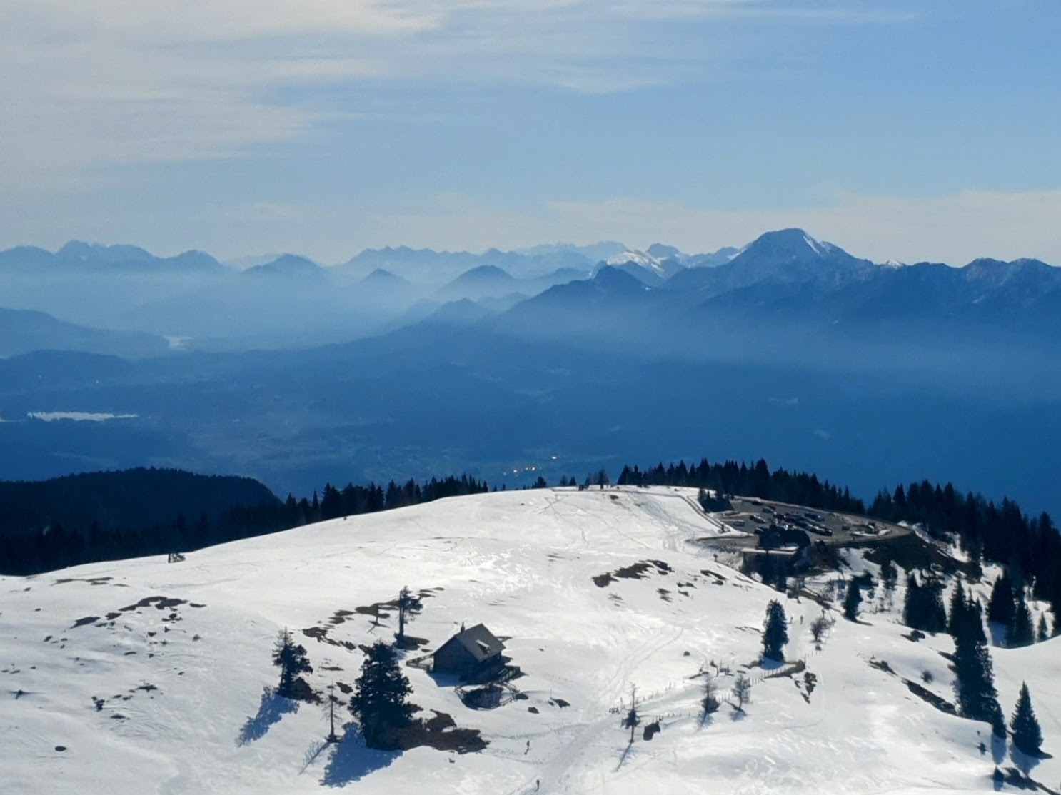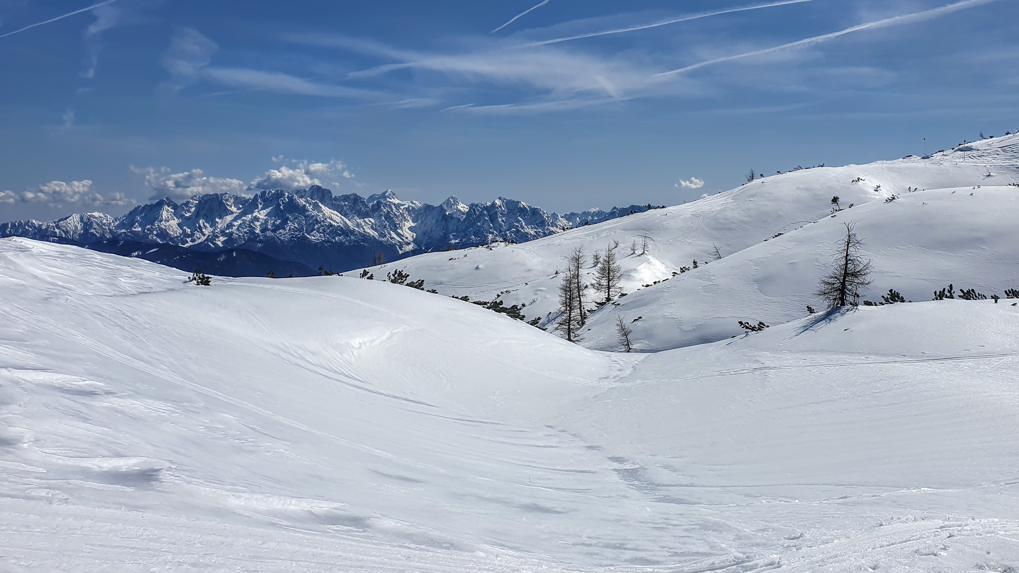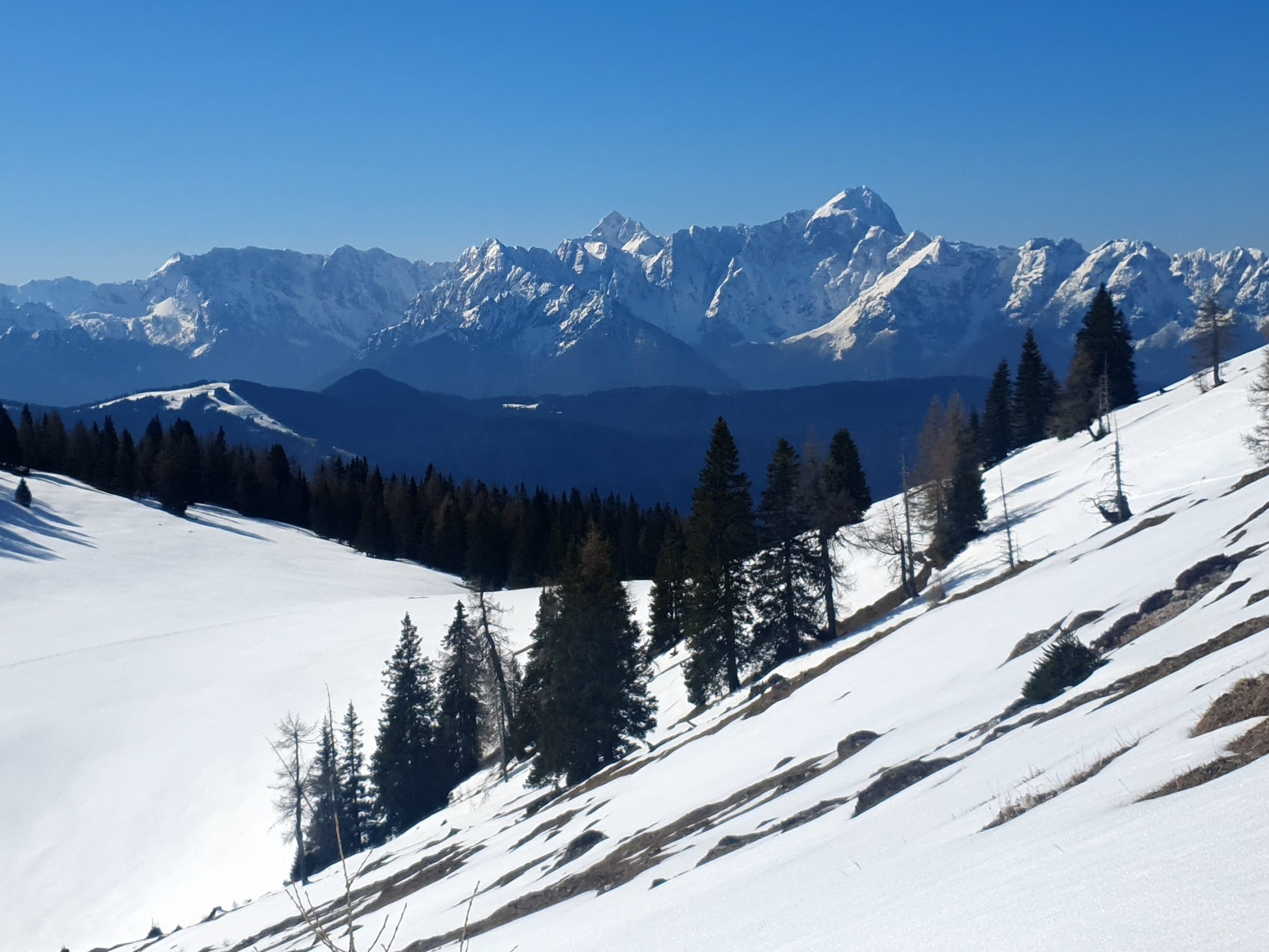 Krećemo širokom stazom, koja je zapravo cesta s još uvijek lijepim slojem savršeno bijelog snijega. To je jedina ishodana staza na Dobrač, kako ga još zovu, dok ostala prostranstva pripadaju turno skijašima. S lijeve strane predstavljaju nam se velikani Julijskih Alpa na čelu s Mangartom, a ispred nas na većoj udaljenosti ističe se oštri vrh Gross Glocknera i tritisućnjak blažih linija Grossvenedigger.
