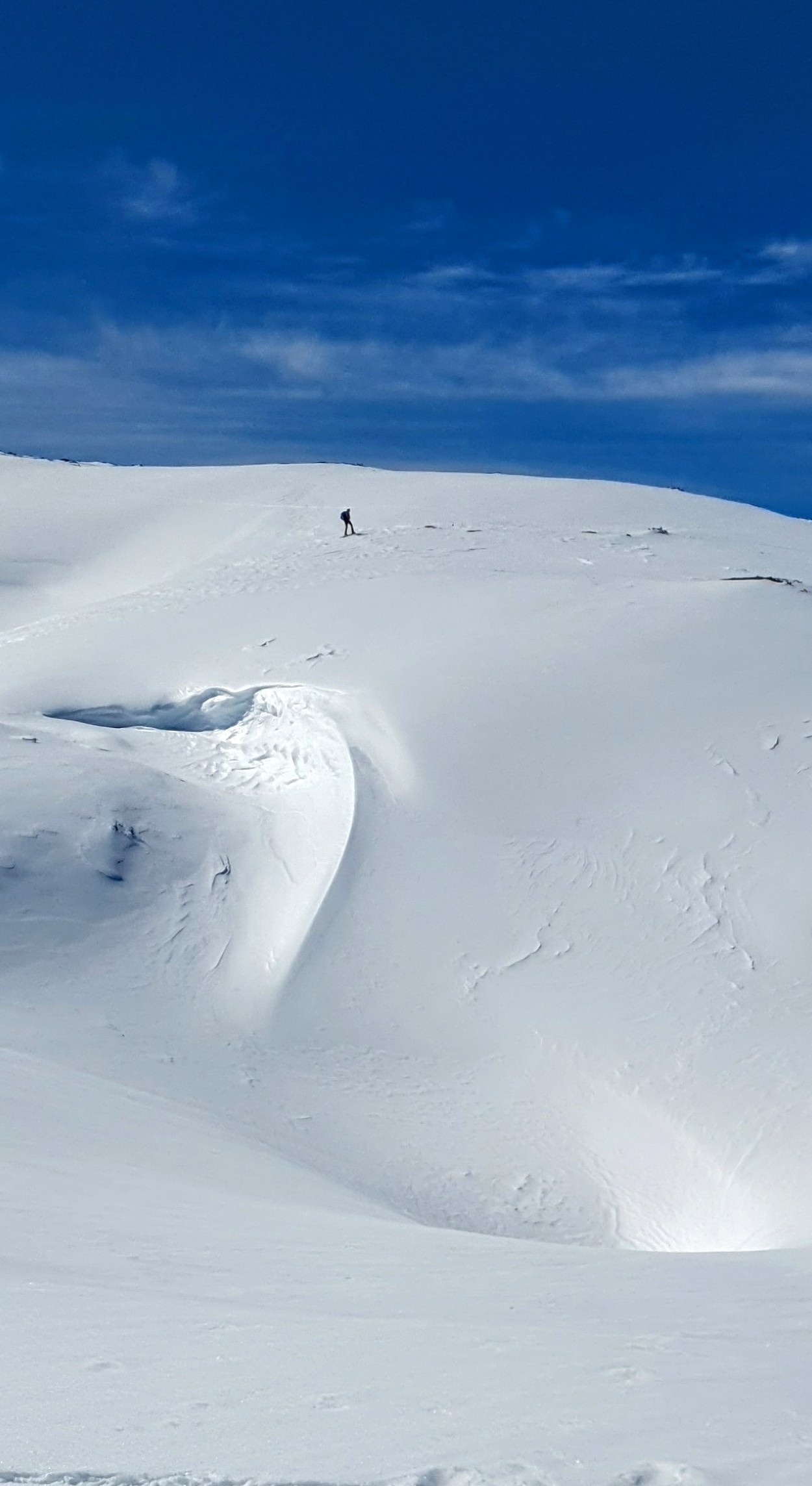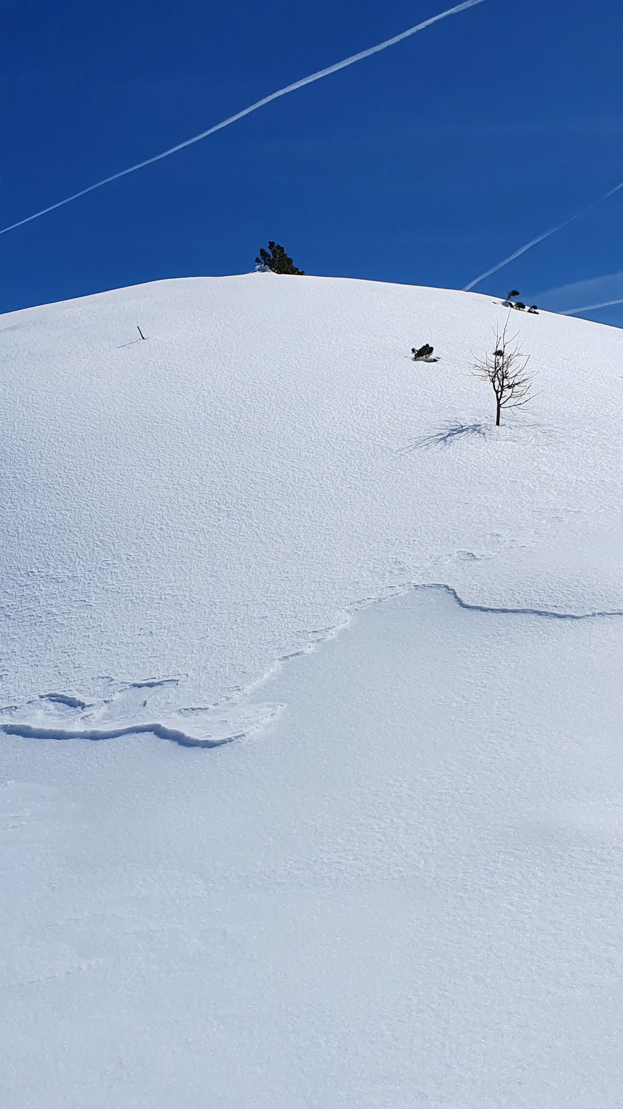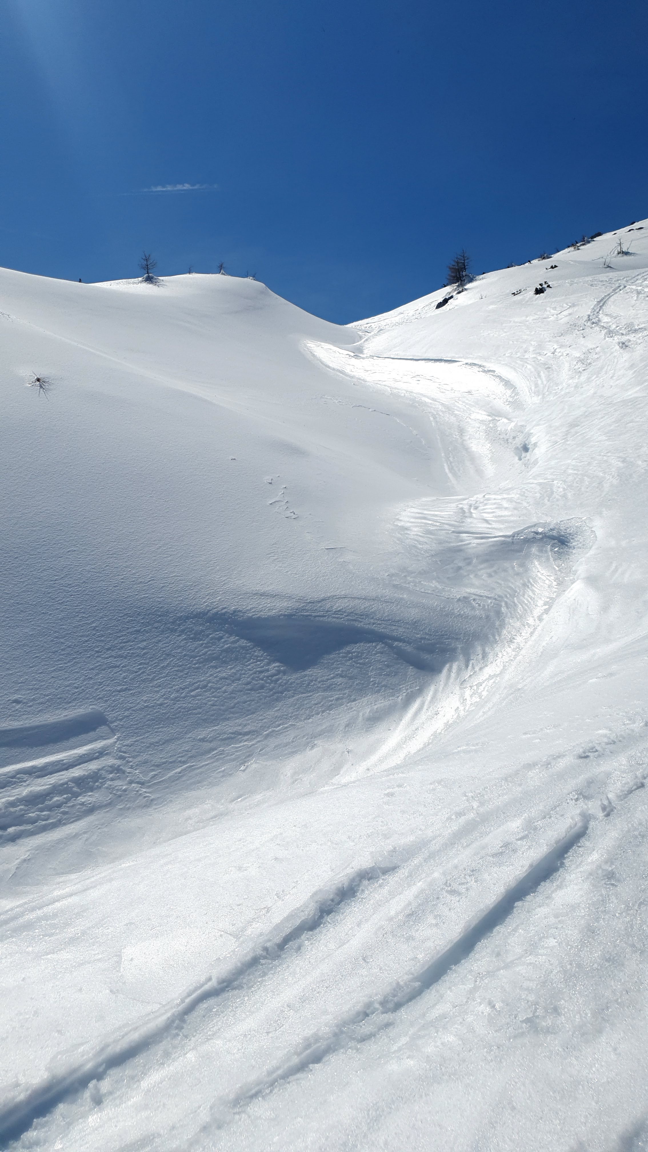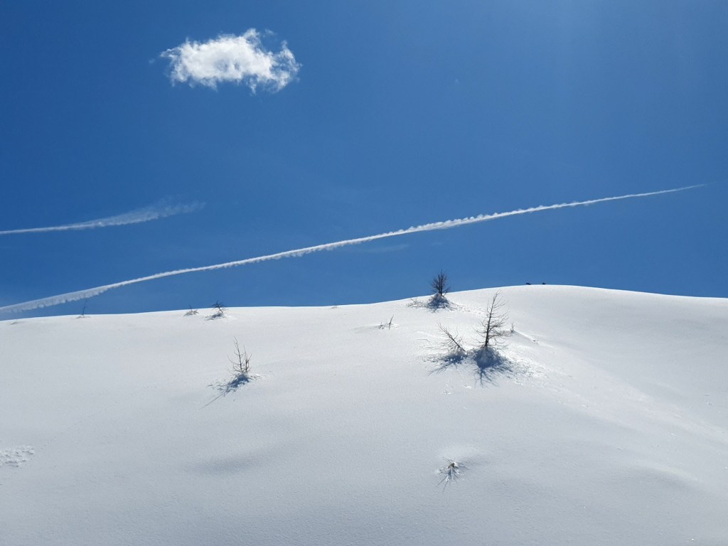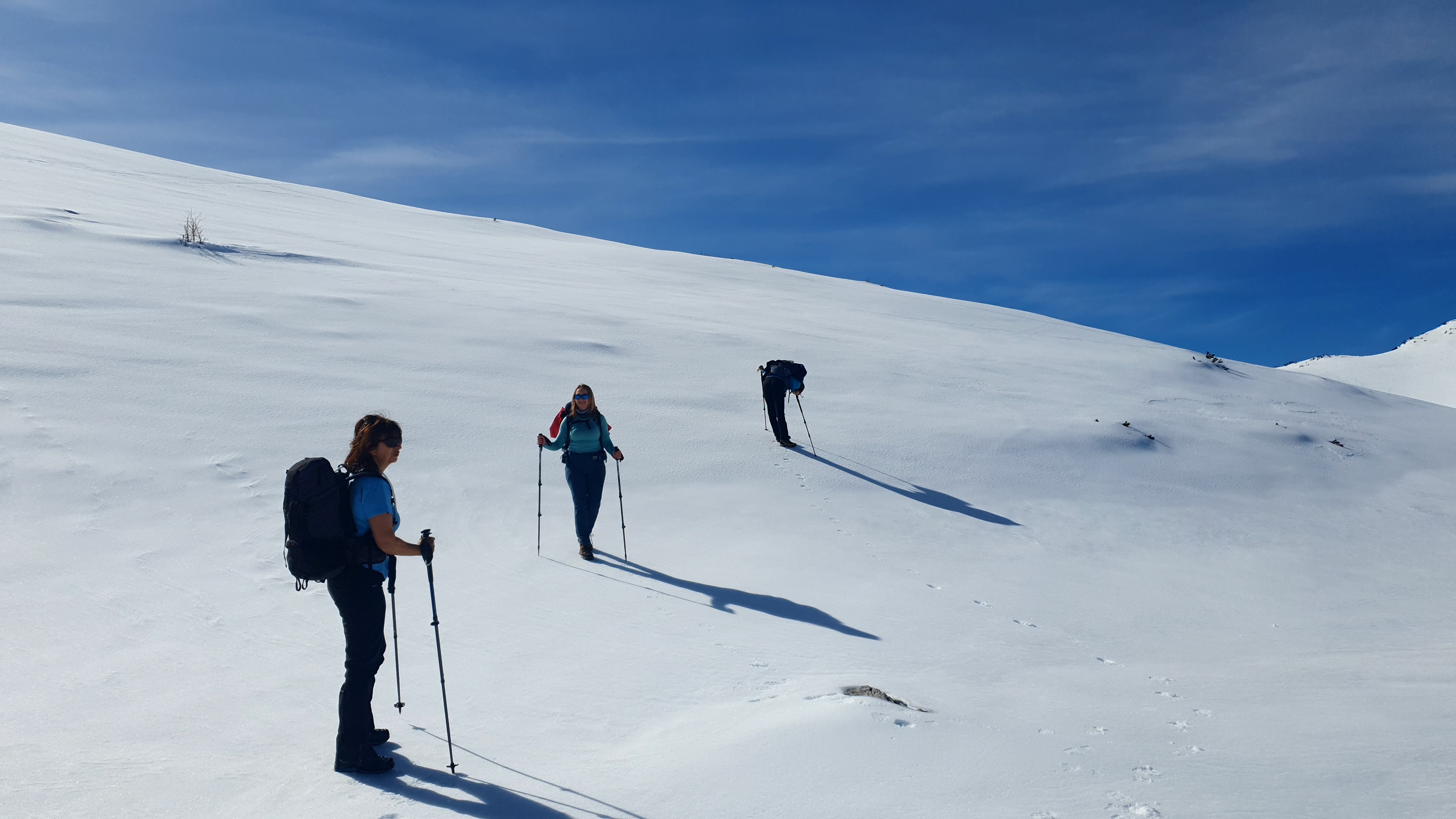 Neodoljivo je malo skrenuti s puta, ne propasti do bokova već ostati na površini, stati, nasmiješiti se sebi i nebu, zahvaliti na ovom zen doživljaju. “Ovo je savršeno mjesto za vježbu zaustavljanja cepinom.”, sve kvari Mirjana, no cepine i tako nemamo stoga samo uživancija.