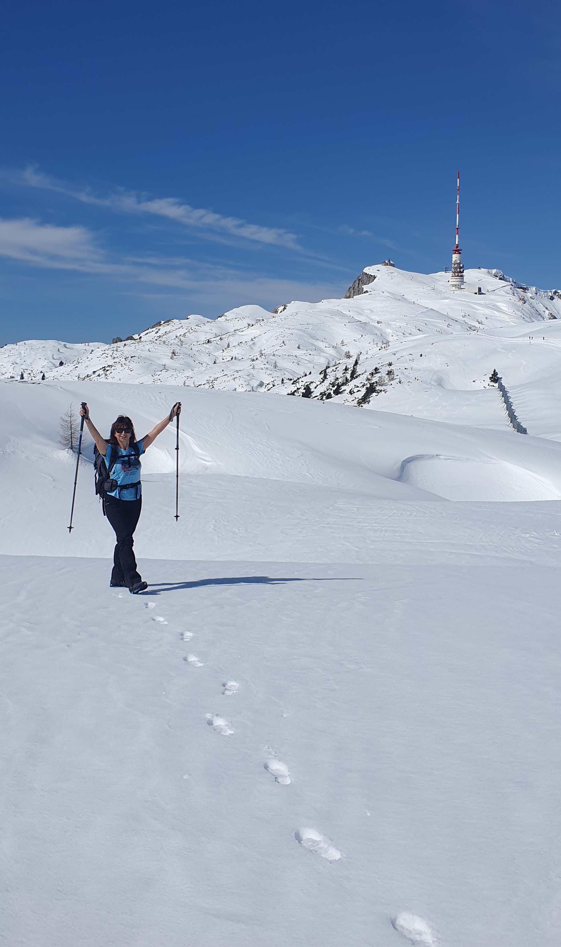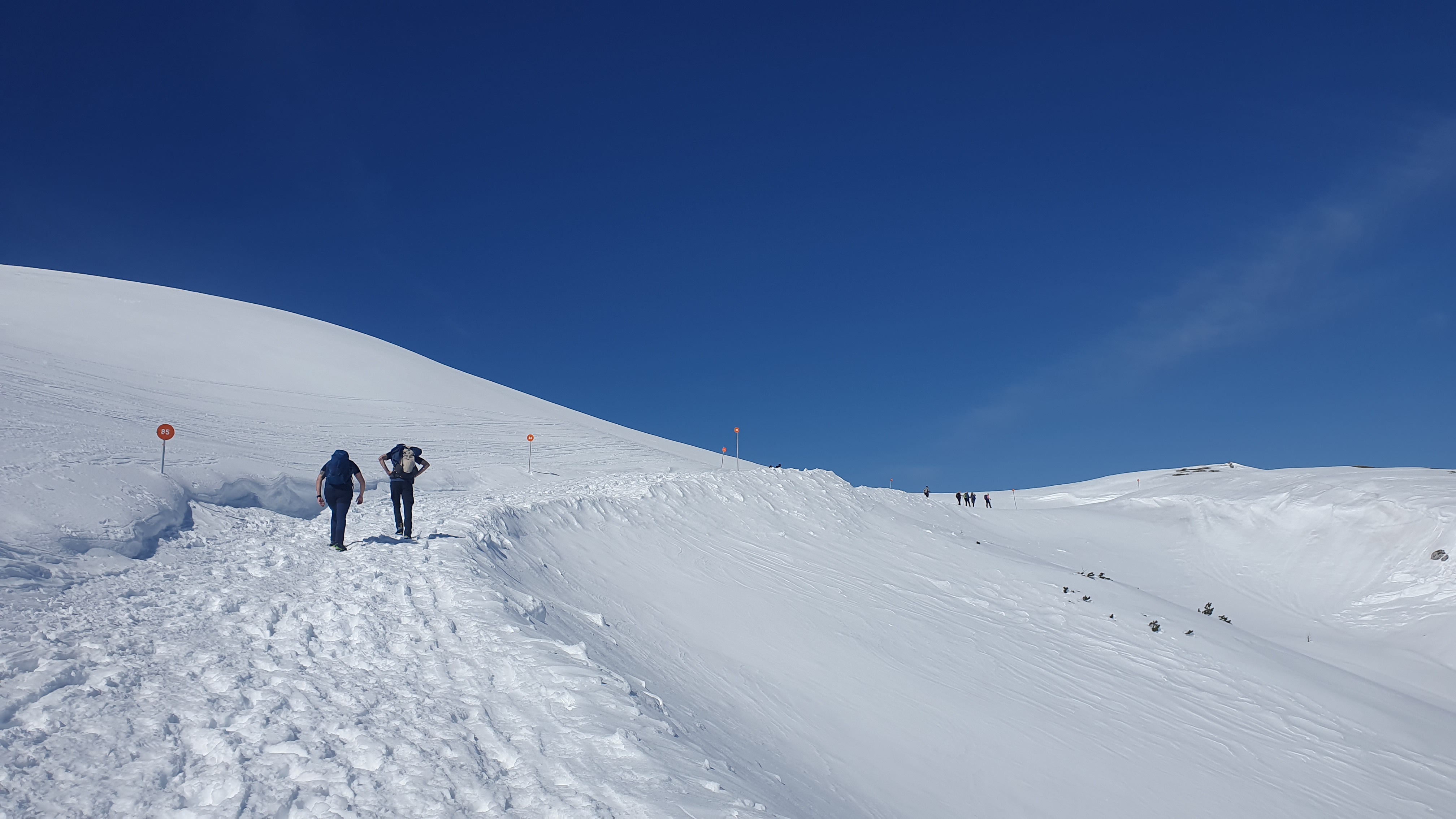 9:45 Dan je sunčan, baš kao što je prognoza najavila. Krema za sunčanje i sunčane naočale su neophodni, a hoćemo li koristiti i nešto od stvarno zimske opreme ne zna se. “Evo, naš cilj je jasno vidljiv ispred nas. Na vrhu bismo mogli biti za sat i pol, ali ja se nadam da ćemo to uspjeti pretvoriti u tri sata.”, govorim i čisto sumnjam.