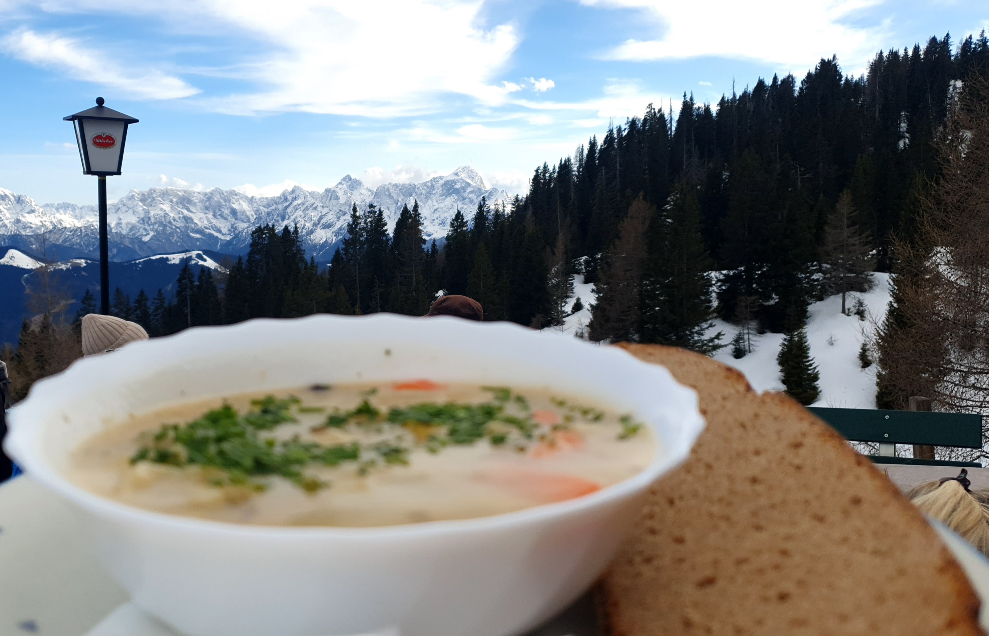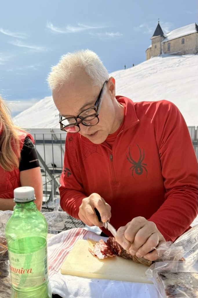 12:00 Društvo se okupilo na terasi velikog modernog planinarskog doma Ludvig Walter Hutte, koji evo danas nije otvoren, ali nije to nikakav problem: Mladen je već izvadio kruh, drvenu daskicu, špek i salamu, koje sam radi, posudio nož i stavio još jedne naočale – sve nas je, kao Isus, nahranio kirurški precizno izrezanim tankim delikatesnim zalogajima.