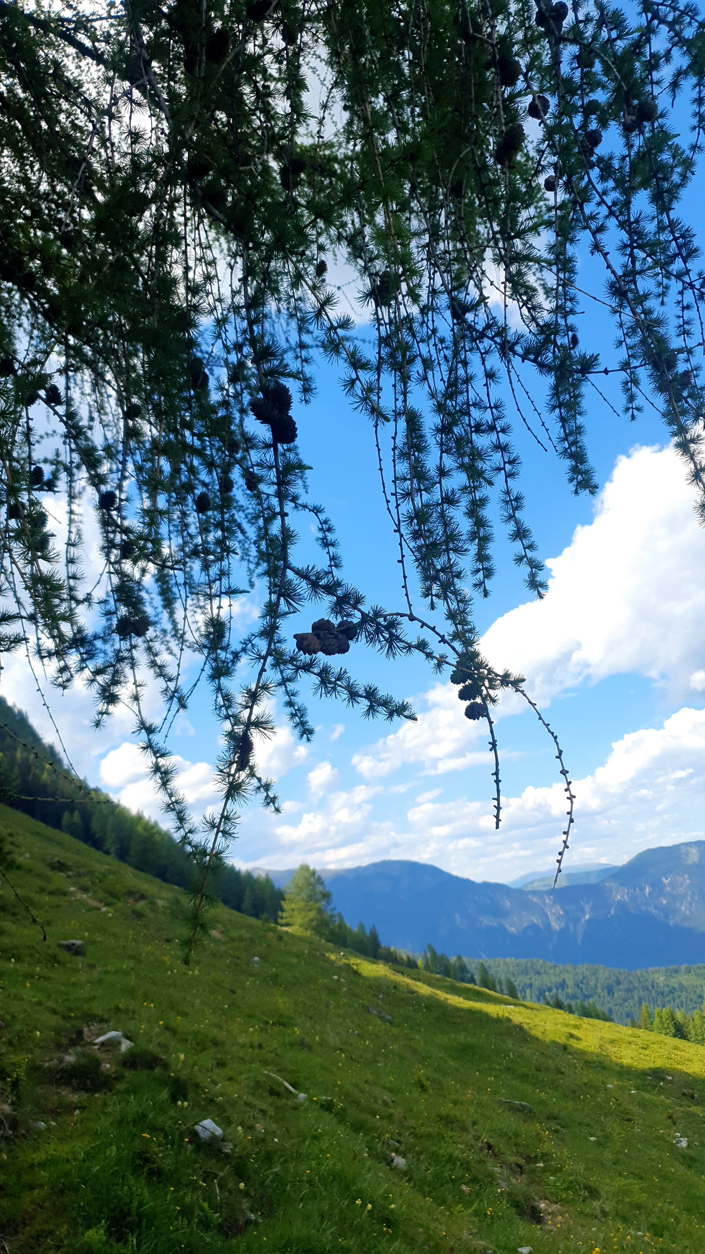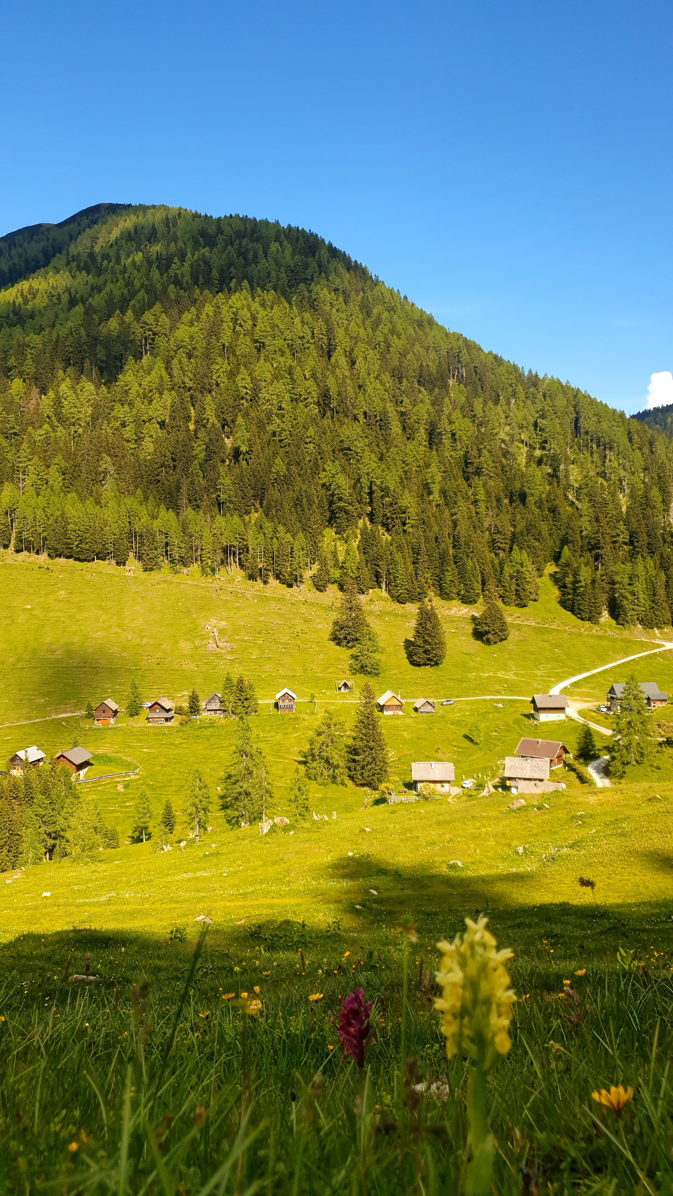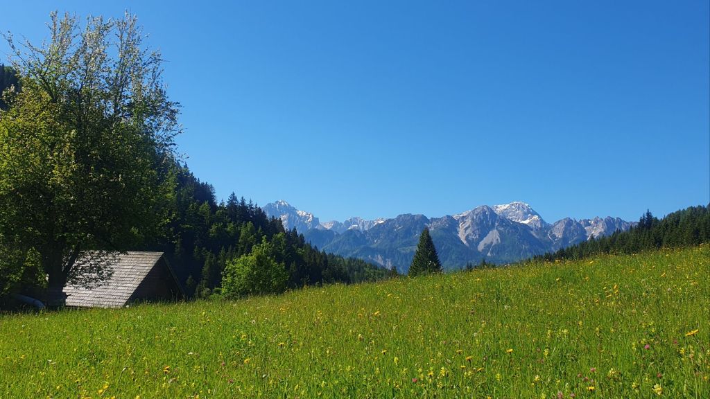 Zelene livade cvatu u svim bojama, poneka romantična drvena bajta viri iz visoke trave, sloj tamne crnogorice osigurava dozu svježine, a nazubljeni vijenac zasniježenih alpskih vrhova dijeli nas od beskrajnog plavetnila bez ijednog oblačka.
