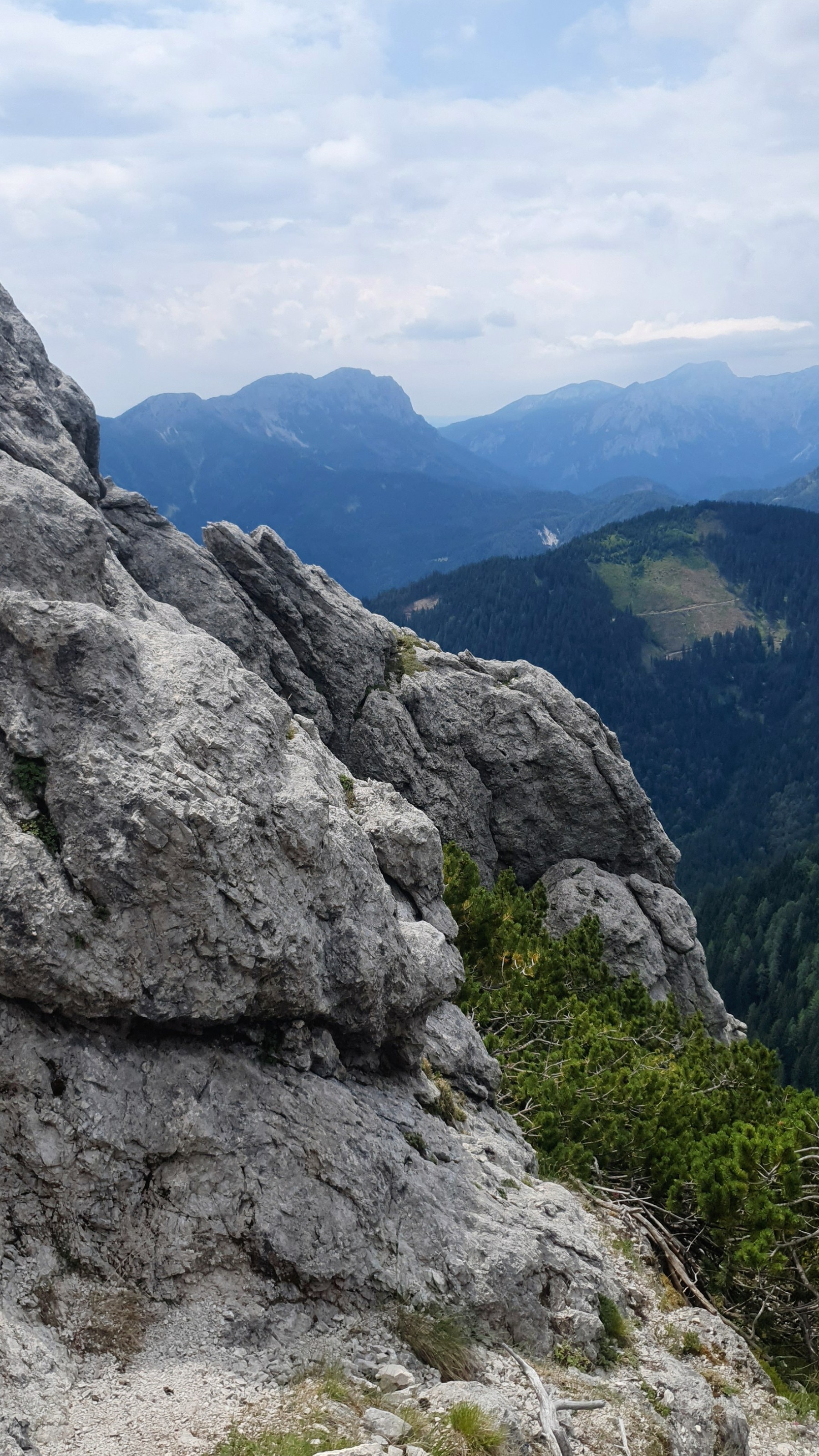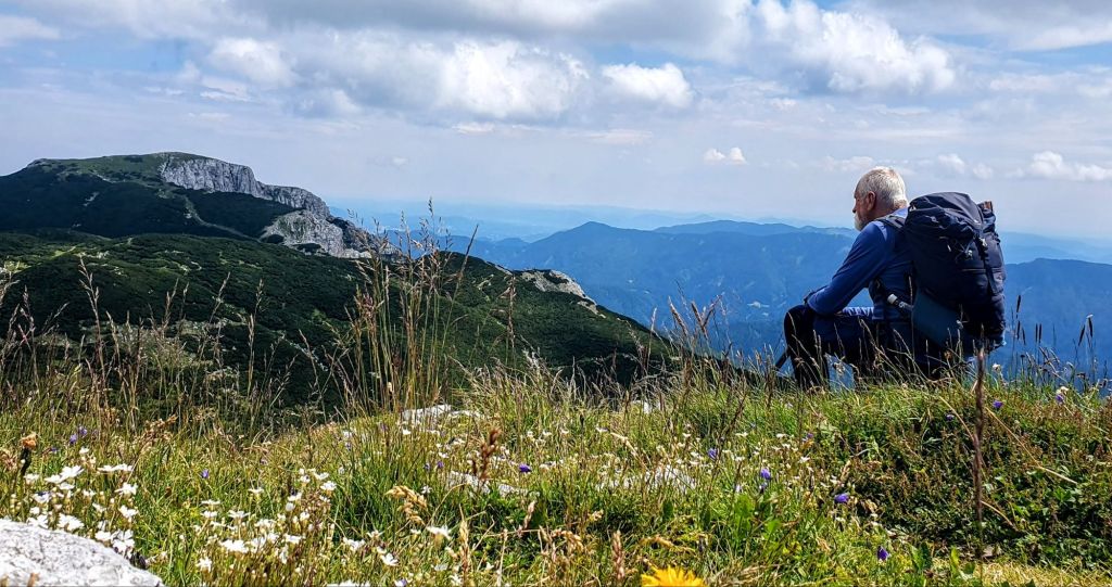 Na raskršću puteva na Kniepsovom sedlu sjedamo na travu da malo otpočinemo. Neki nalazimo dobru poziciju u Austriji, neki u Sloveniji, a Silvani nije teško sve nas obići i ponuditi čokoladom iz Belgije. S jedne strane imamo strme litice, prostrane gradove i obrađena polja – Austriju, a s druge beskrajne planine obrasle crnogoricom nepovoljne za življenje i obradu tla – Sloveniju. Dok mi topimo čokoladu, iznad nas odvija se prava drama – oblaci se preslaguju, jure, žure, sve su tamniji i sve su nam bliže. “Hoćemo na dva – tri vrha u suprotnom pravcu, pa se vraćamo i onda penjemo na Pecu ili da skratimo?”, pitam. Nekad mi naiđe demokracija. – “Ako pokisnemo, svejedno je na kojem smo vrhu.”, kaže ekipa i to je stvarno točno, kao što je točno da je ovo ekipa kaja uvijek bira više. – “O.K. Onda idemo po planu!”