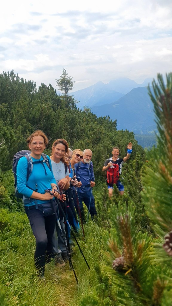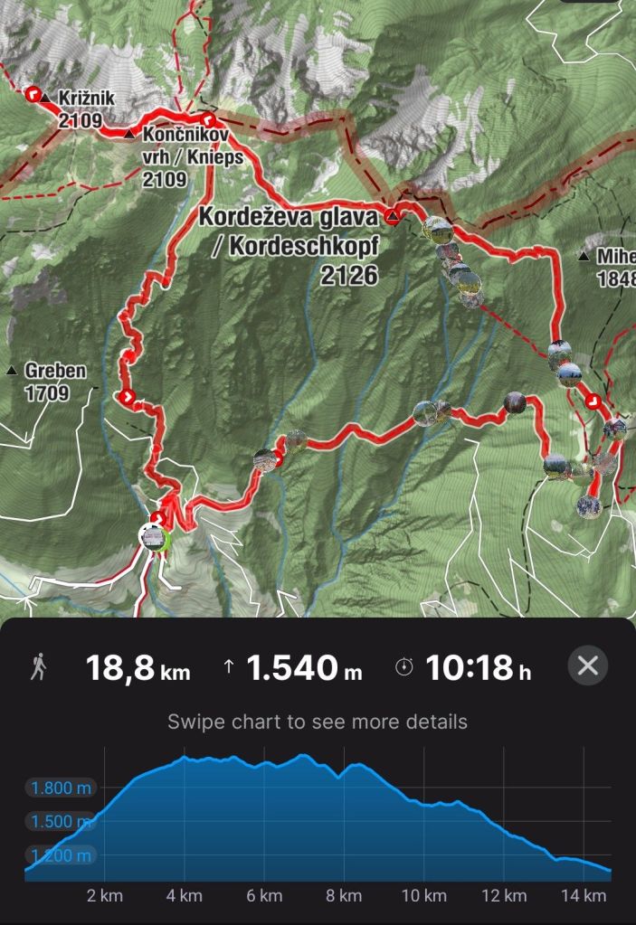 Dvadest i pet minuta kasnije sjedimo na vrhu Križnik iste visine i mjerkamo križ na trećem vrhu Bistriška špica na koji ipak danas ne idemo, radije ćemo na ovome guštati malo dulje. Previše smo na putovanje danas potrošili. “Vidiš ovu vijugavu stazicu na austrijskoj strani?, pokazuje mi Silvana. – “Da, baš je lijepa. Vjerujem da ide od jezera, a do jezera vozi gondola…”, otvaram aplikaciju, vidim da možemo složiti kružnu turu i tako nastaje plan za jednu subotu sljedeće godine, jer vidici su odavde predivni, a staze pitome.