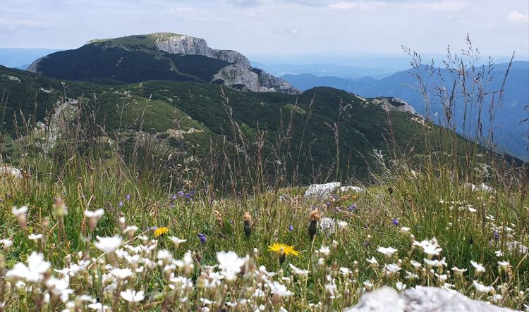 Nakon dosta znoja, jer uspon jedva da može biti strmiji, izlazimo na otvoreni greben. Pogled se širi, a staza sužava i sad vijuga kroz bujnu travu i razgranatu klekovinu.